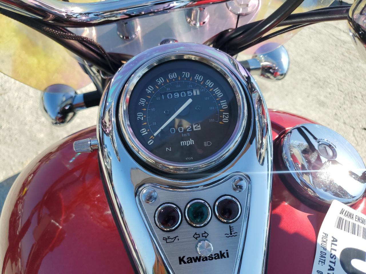 GoodThe 2004 KAWASAKI EN500 C, is presented in red. The vehicle's exterior shows signs of use, with minor cosmetic imperfections. The wheels appear to be in good condition. The lights and glasses are intact. The motorcycle itself is a cruiser-style bike known for its reliability and comfortable ride. The current state suggests it has been used and maintained.