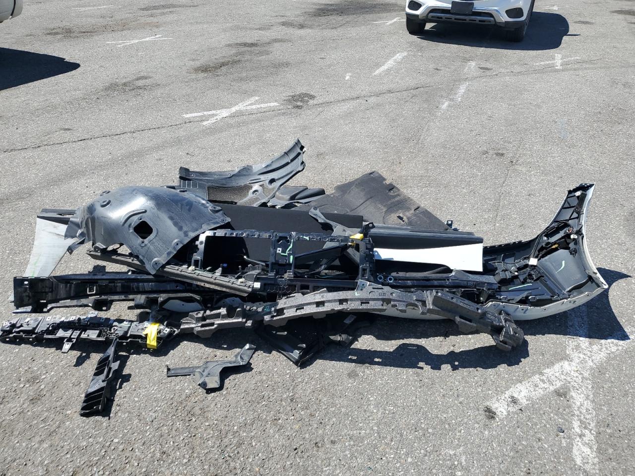 The car has sustained damage to the front end, with the bumper detached, and side damage along the body panels.