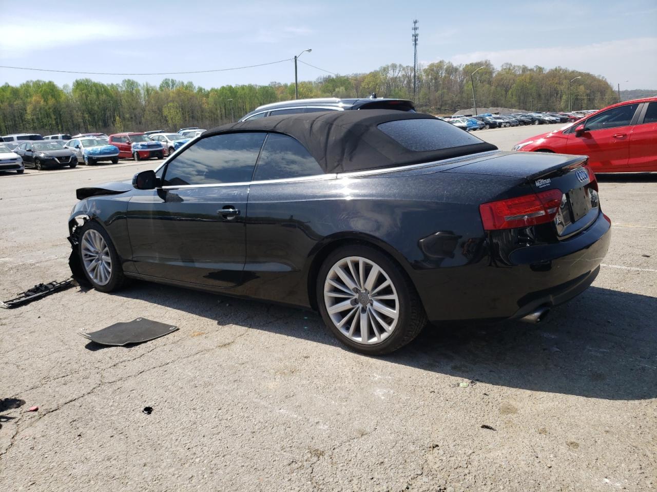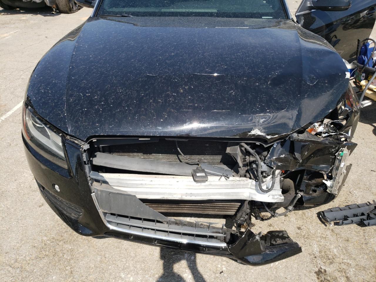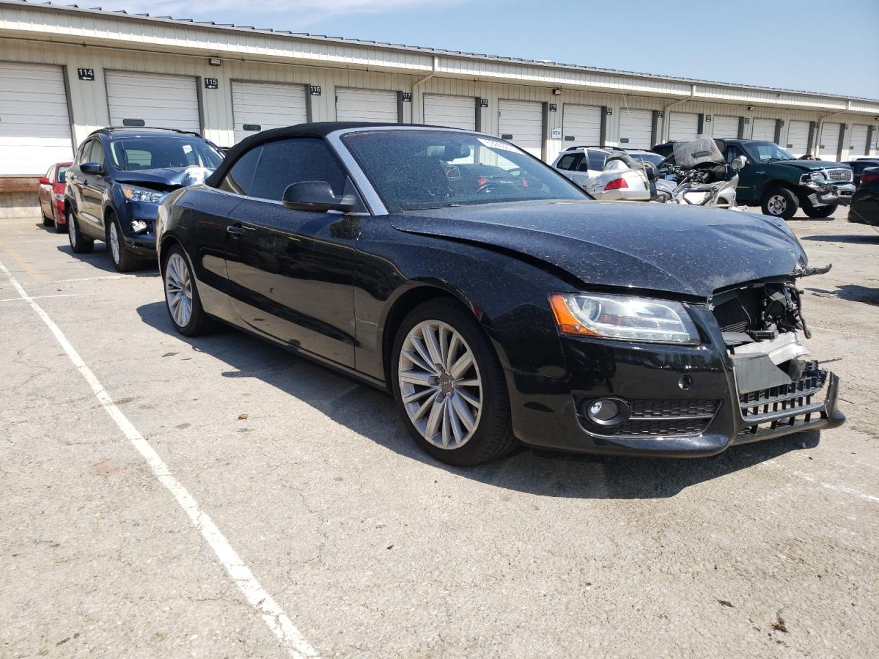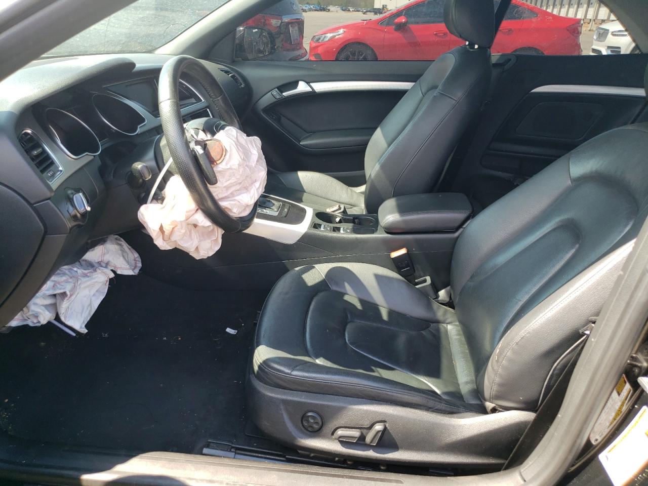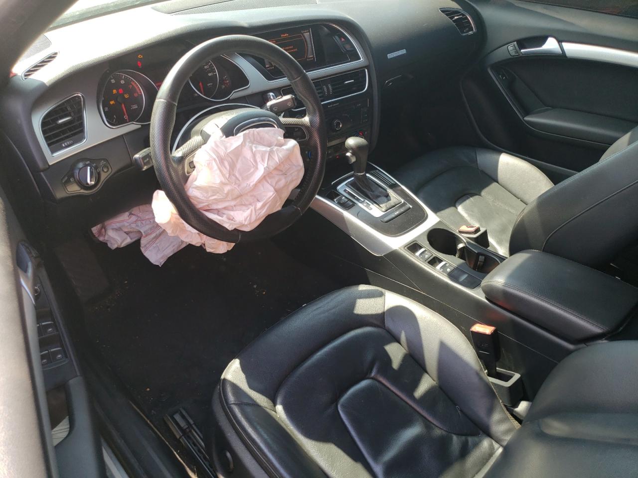 FairThe 2012 AUDI A5 PREMIUM, a black convertible, has sustained significant front-end damage. The front bumper, hood, and headlights are heavily damaged, indicating a collision. The airbags have deployed, and the interior shows signs of damage. The wheels appear to be intact. Overall, the car requires considerable repair.