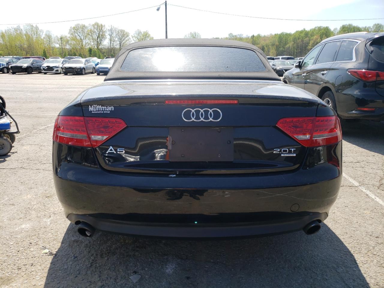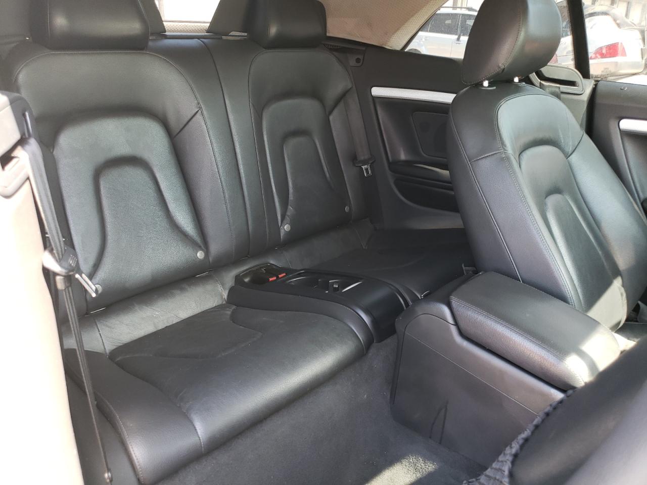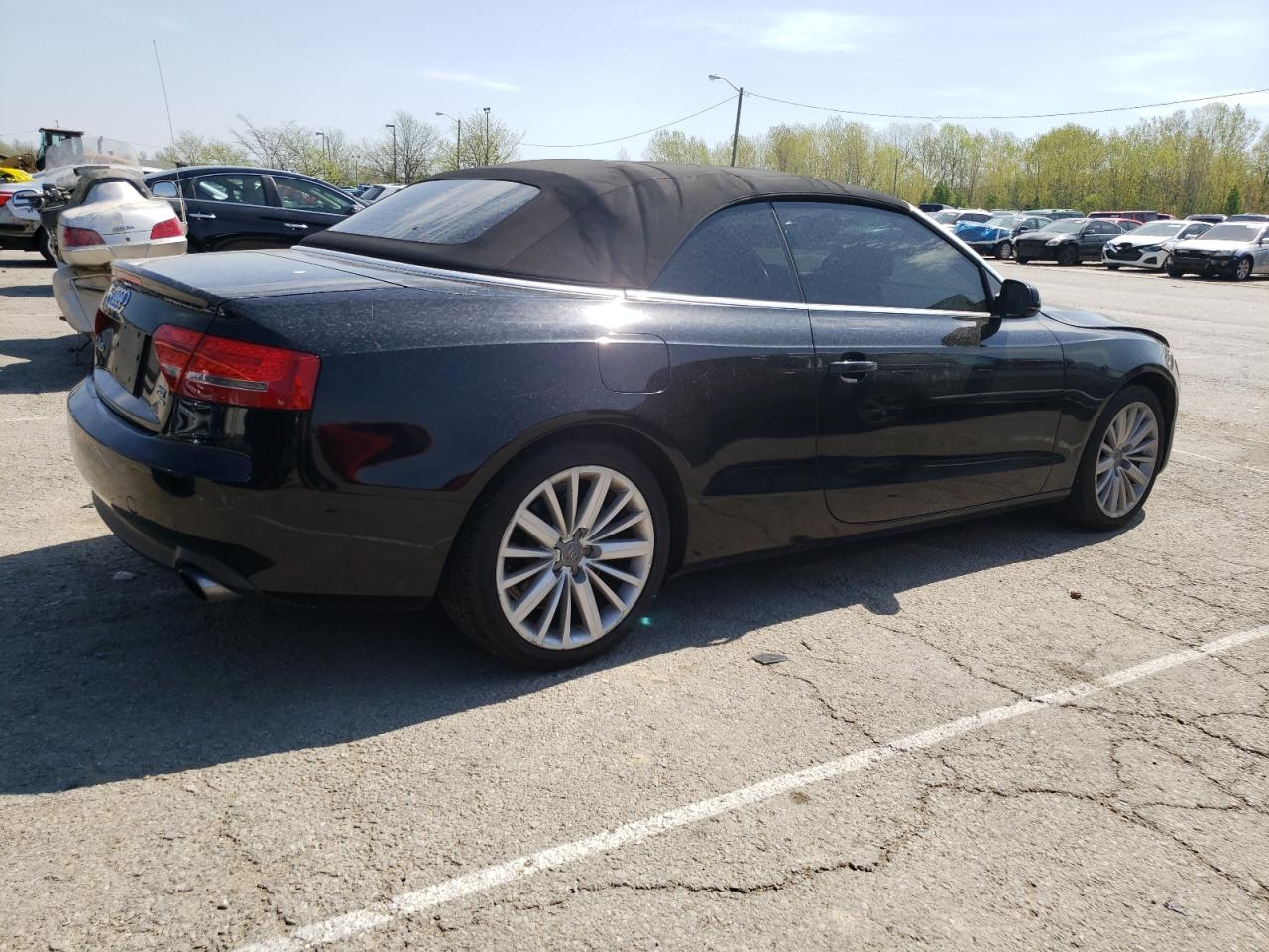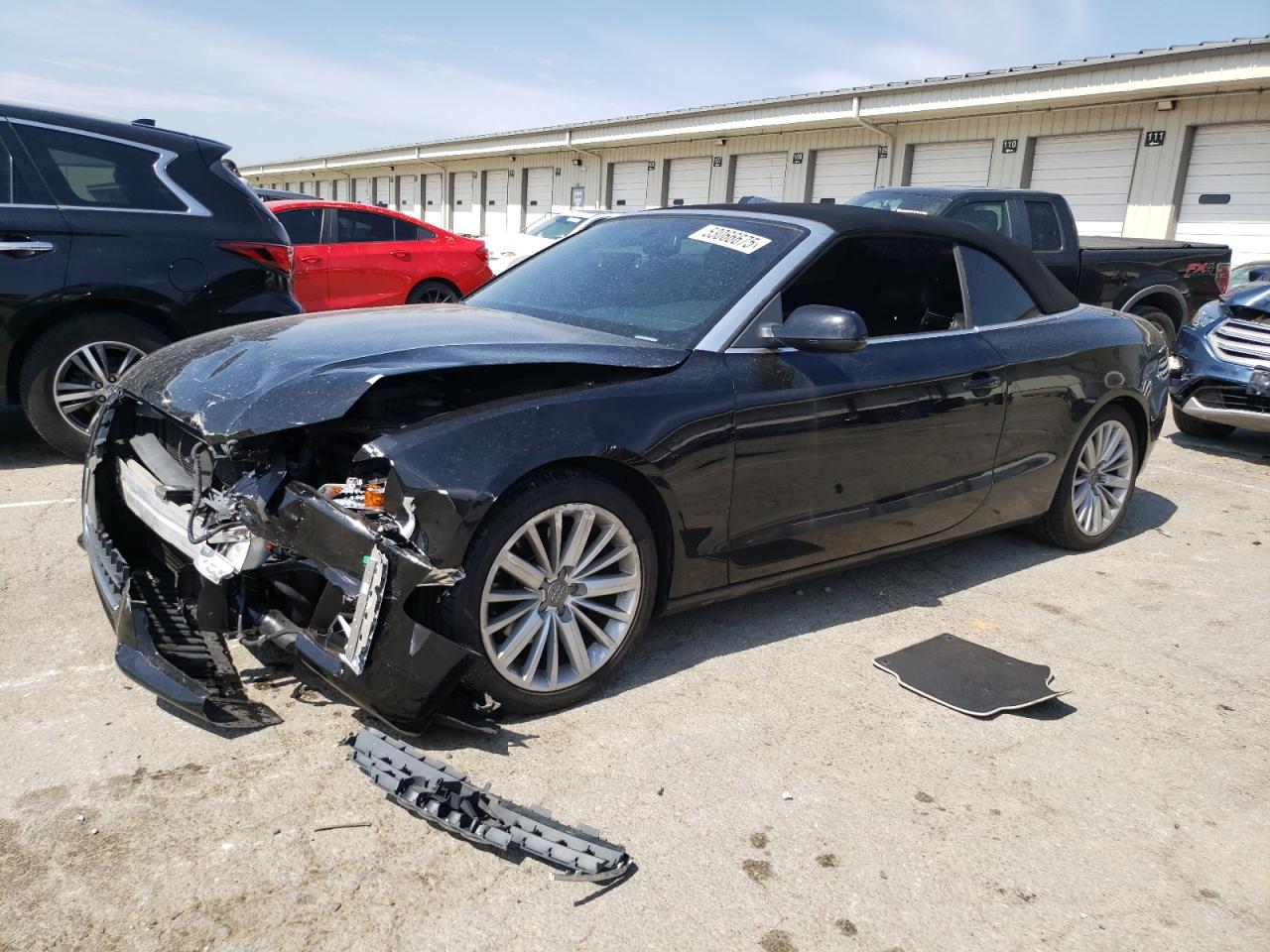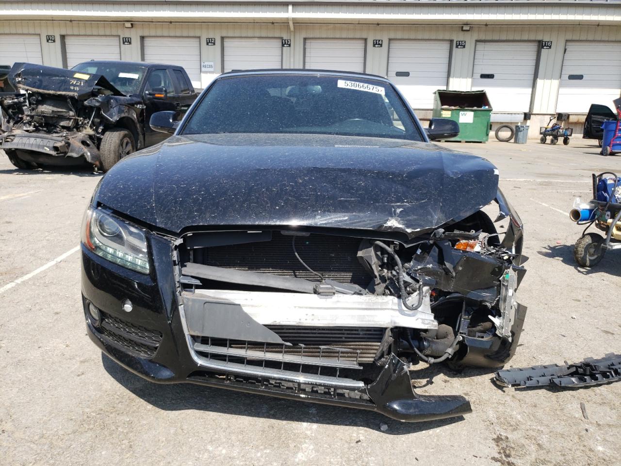 FairThe 2012 AUDI A5 PREMIUM, a black convertible, has sustained significant front-end damage. The front bumper, hood, and headlights are heavily damaged, indicating a collision. The airbags have deployed, and the interior shows signs of damage. The wheels appear to be intact. Overall, the car requires considerable repair.