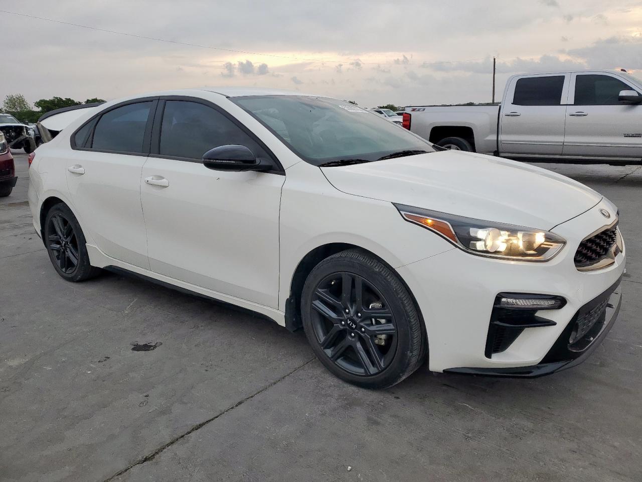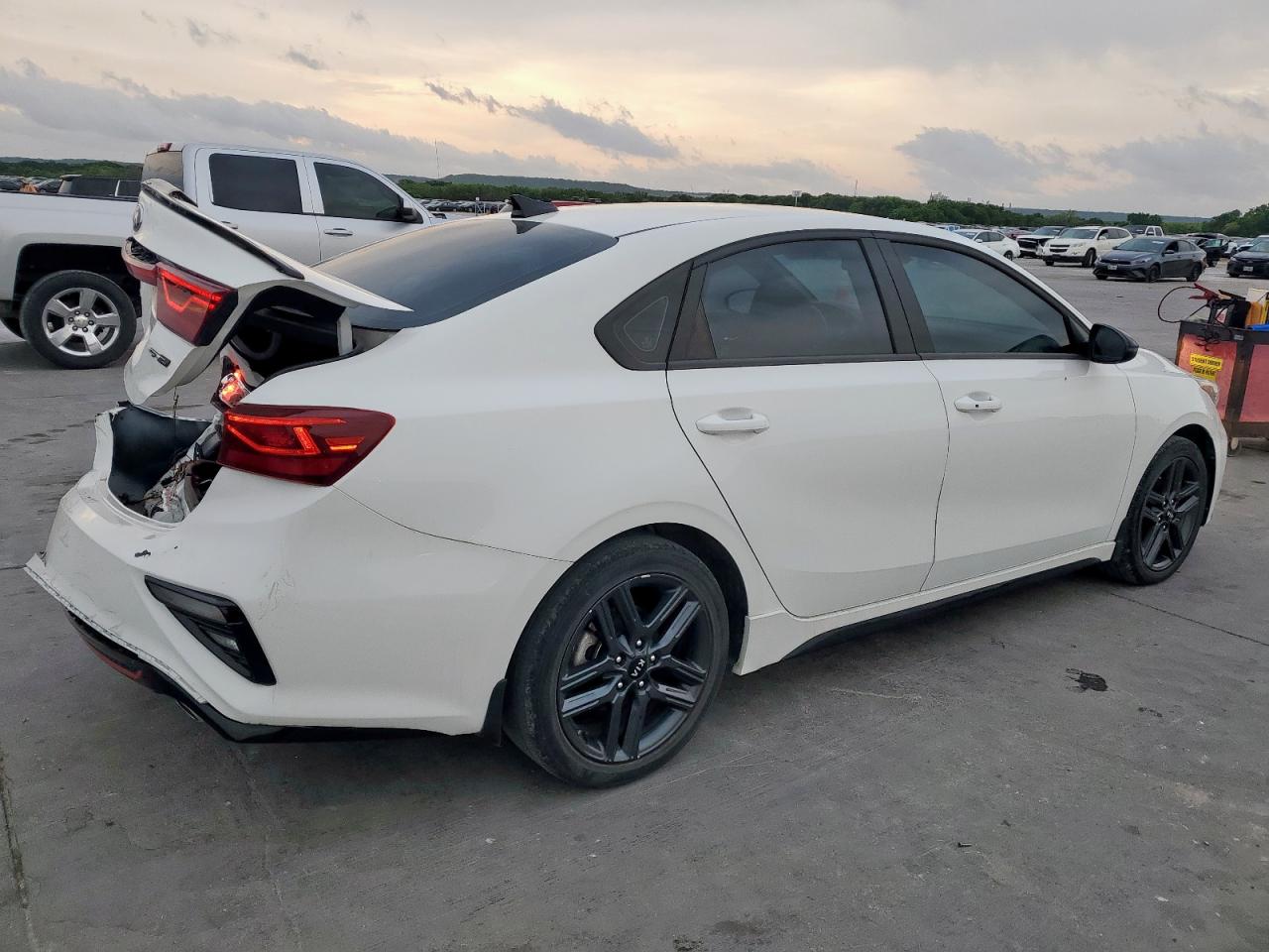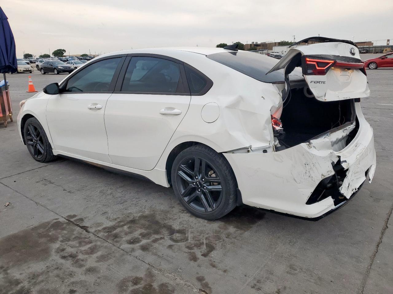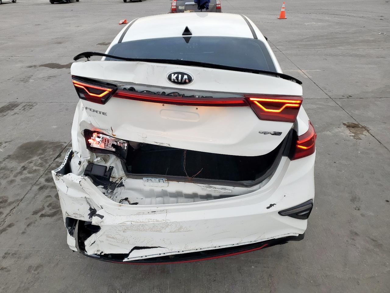 FairThis is a white 2021 KIA FORTE GT. The car has sustained significant rear-end damage, impacting the body panels, and damage to lights. Wheels appear intact, and the car is able to run and drive. The interior condition appears well maintained. The vehicle's start code indicates it is in running condition.