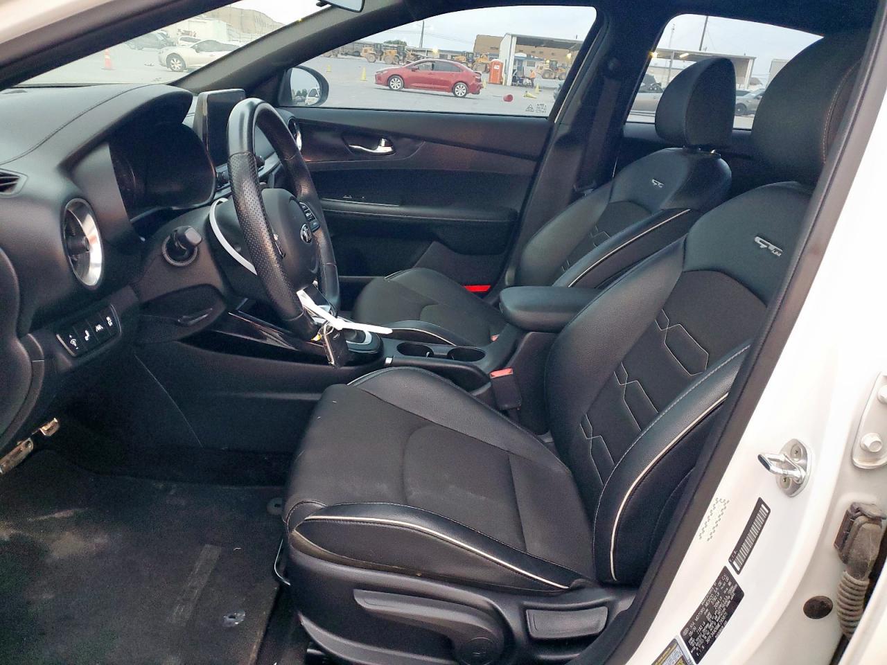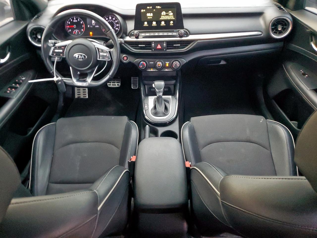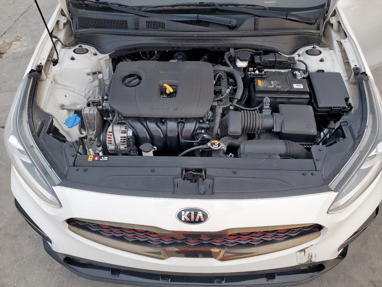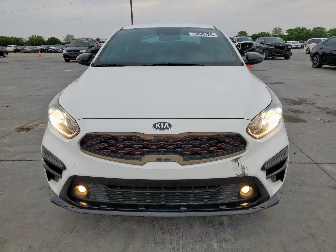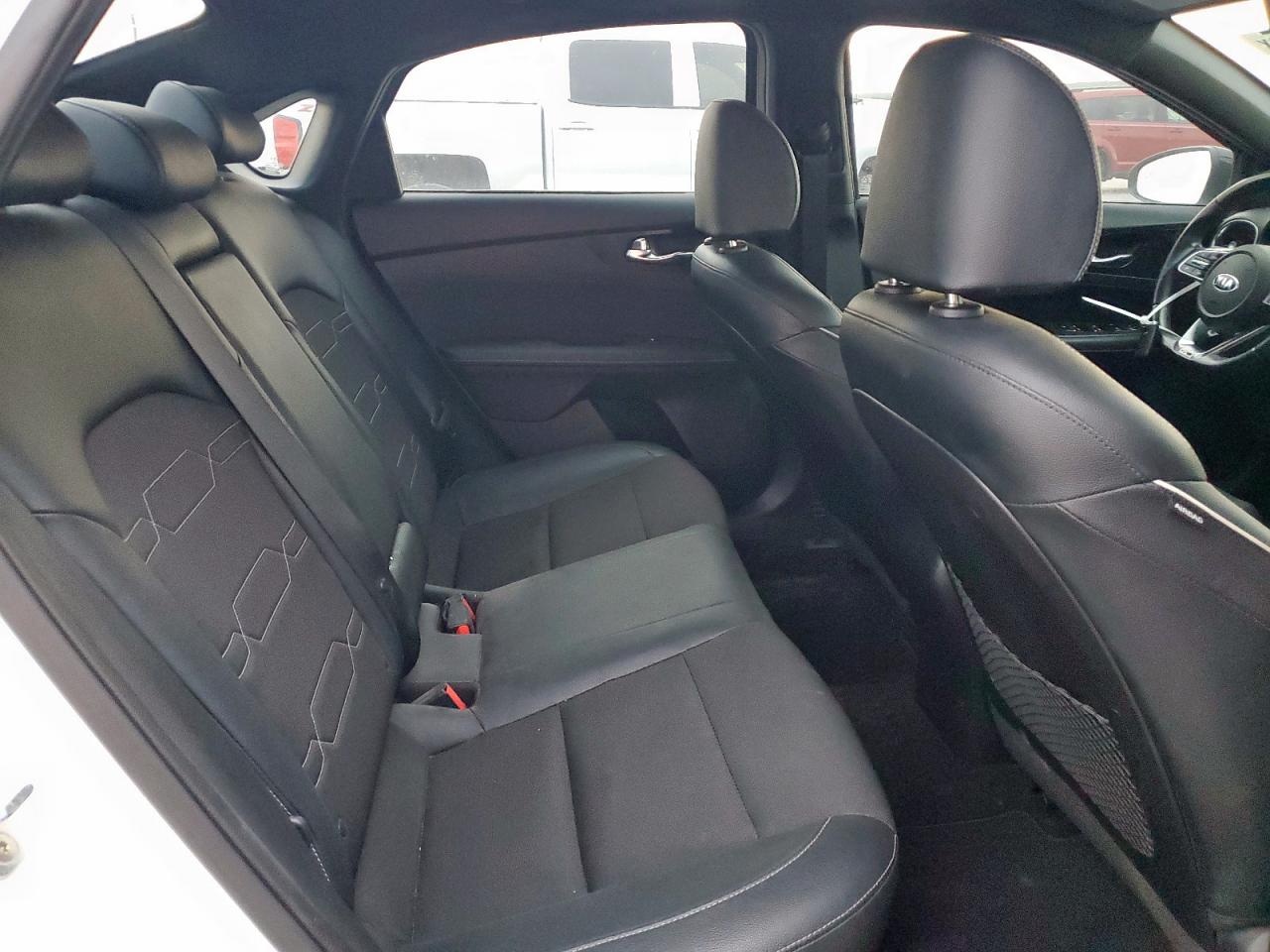 FairThis is a white 2021 KIA FORTE GT. The car has sustained significant rear-end damage, impacting the body panels, and damage to lights. Wheels appear intact, and the car is able to run and drive. The interior condition appears well maintained. The vehicle's start code indicates it is in running condition.