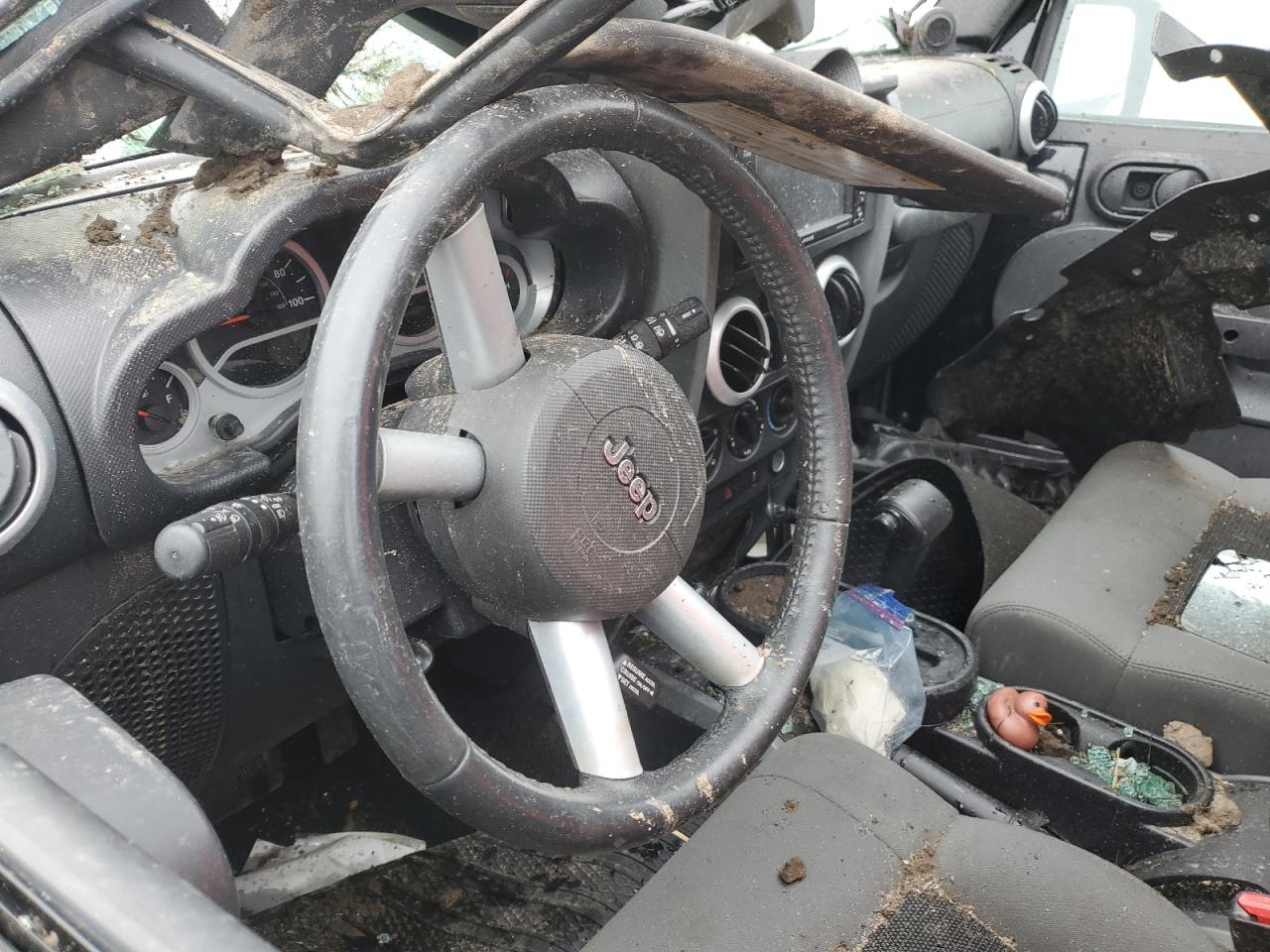 PoorThe 2010 Jeep Wrangler is severely damaged from a rollover accident. The black exterior exhibits extensive body damage with the roof completely caved in, shattered windows, and significant panel deformation. The wheels appear to be intact, but the overall structural integrity is compromised. The interior is heavily damaged as well, with visible damage to the dashboard, steering wheel, and seats, suggesting a complete overhaul is needed. Airbags might have been deployed, but it's impossible to confirm. The car is not drivable in its current state, and requires considerable repair.