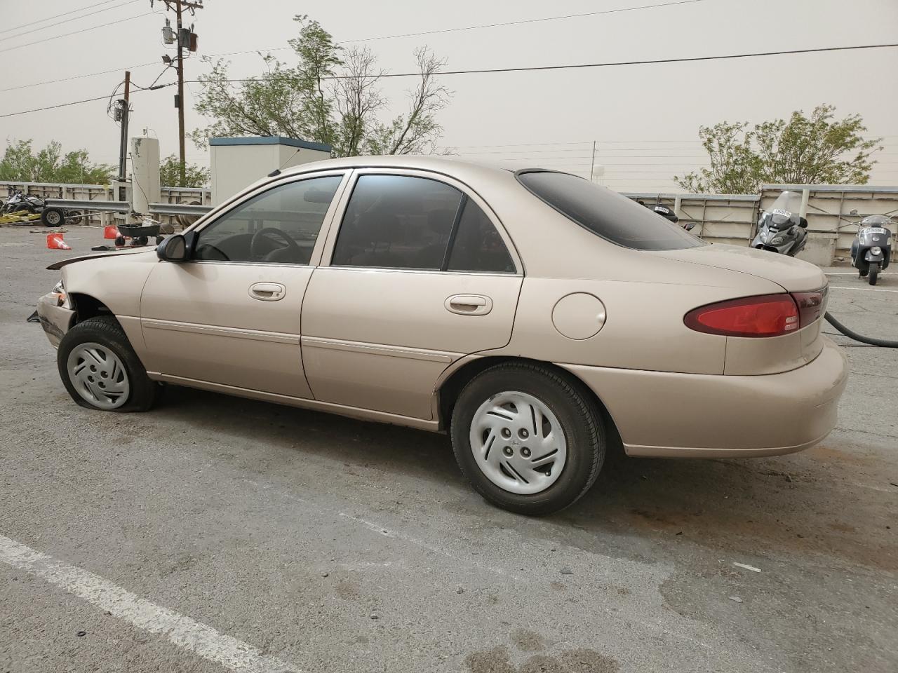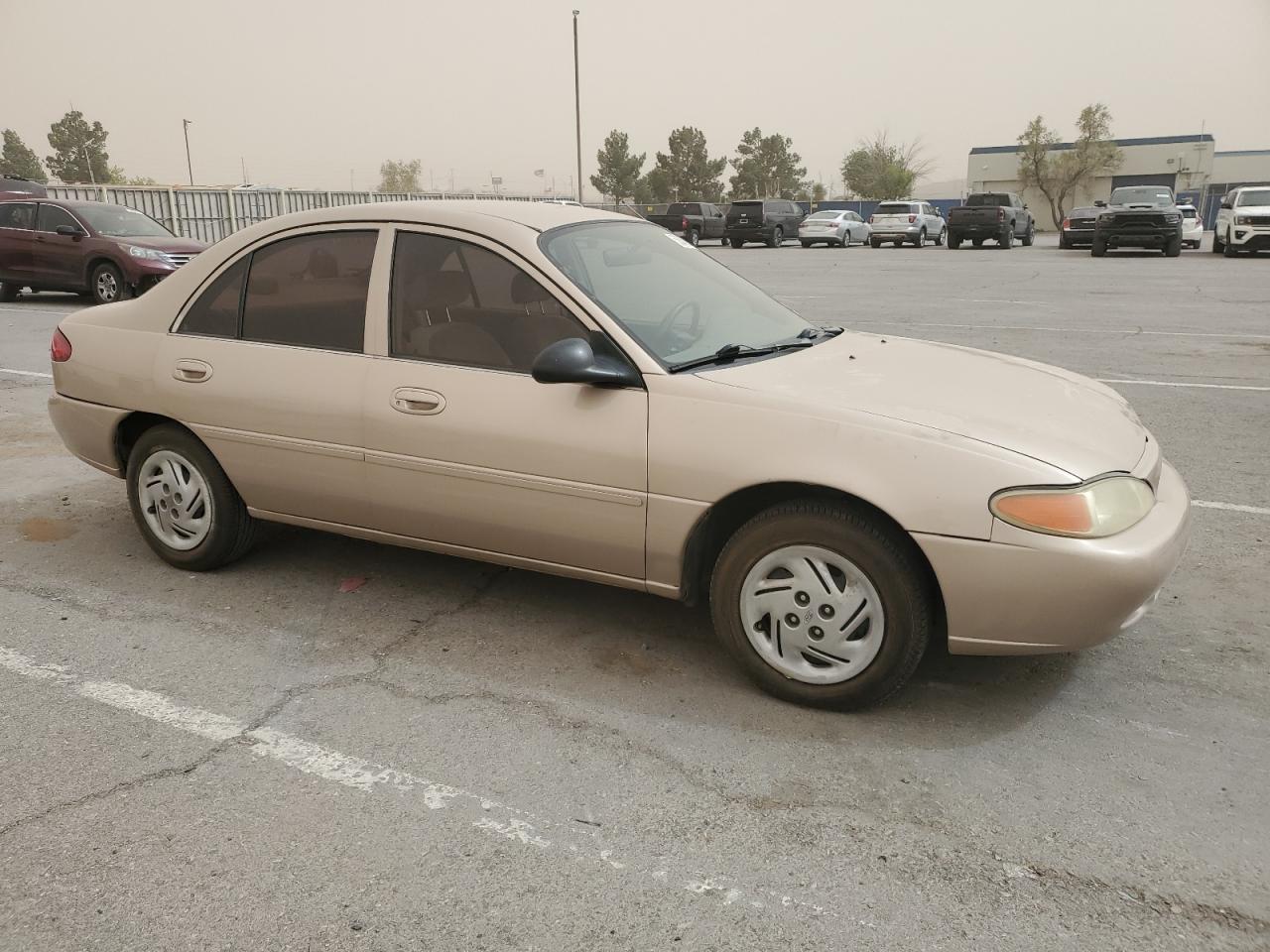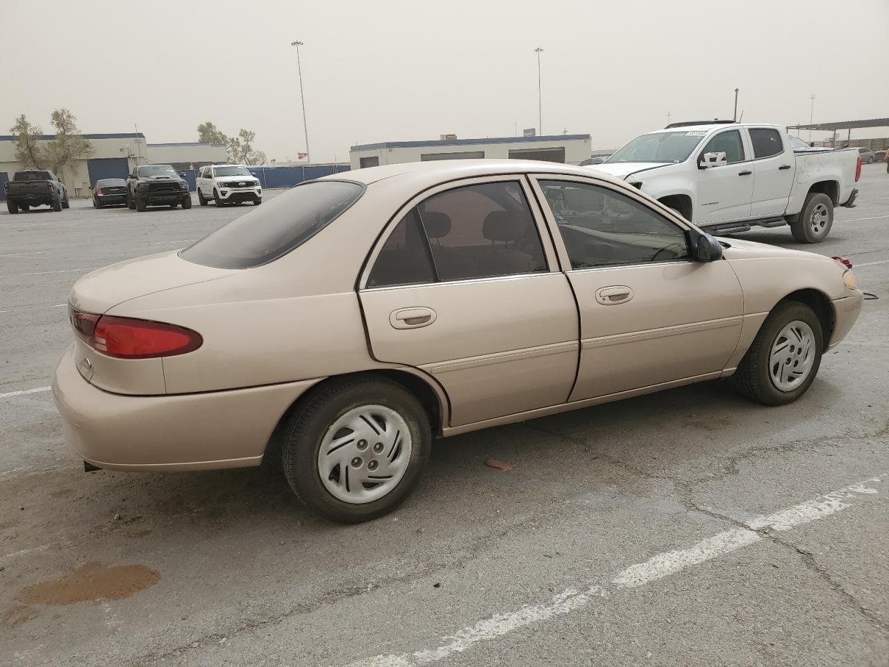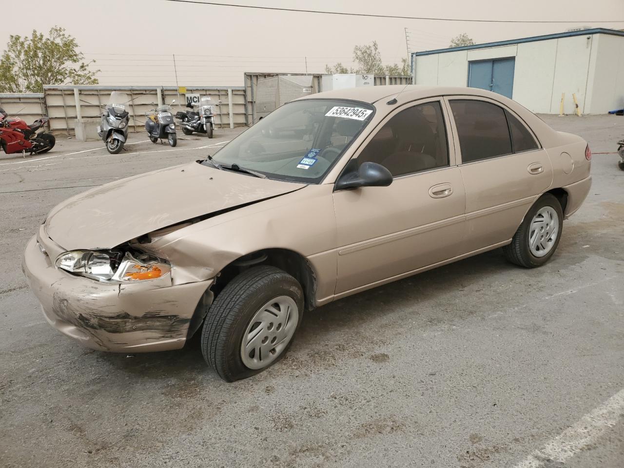 FairThis is a 1999 Ford Escort LX in tan. The primary damage is to the front end, with secondary mechanical issues. The car's exterior shows moderate visible damage, including a damaged front bumper and possible damage to the front fender. The wheels appear to be in decent condition. The interior has minor wear and tear consistent with its age and mileage. The car is drivable but requires repairs.