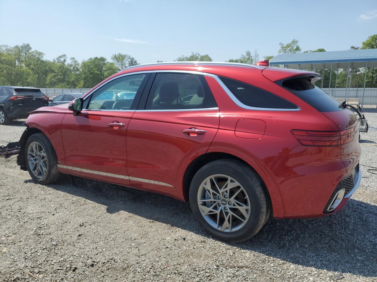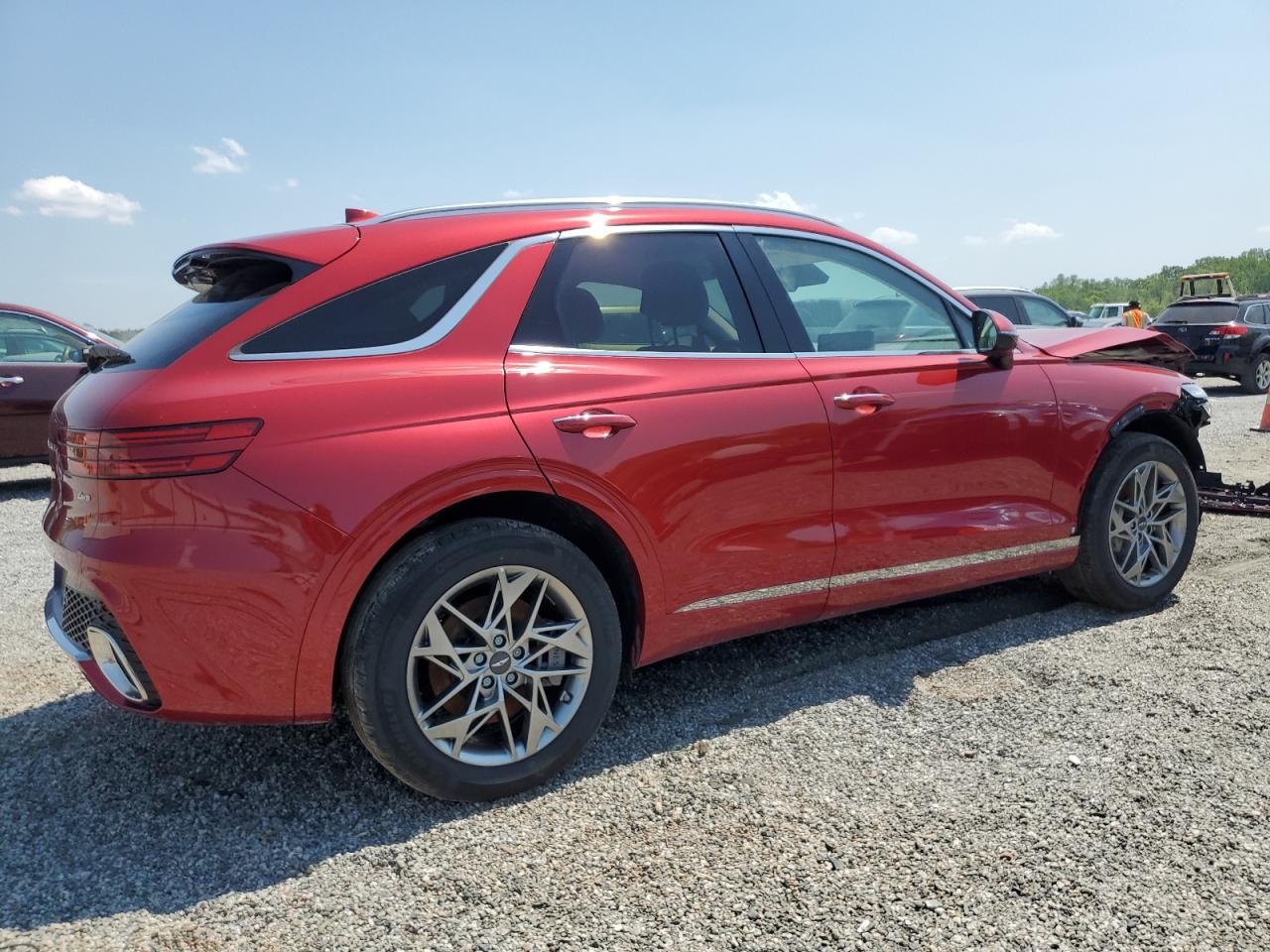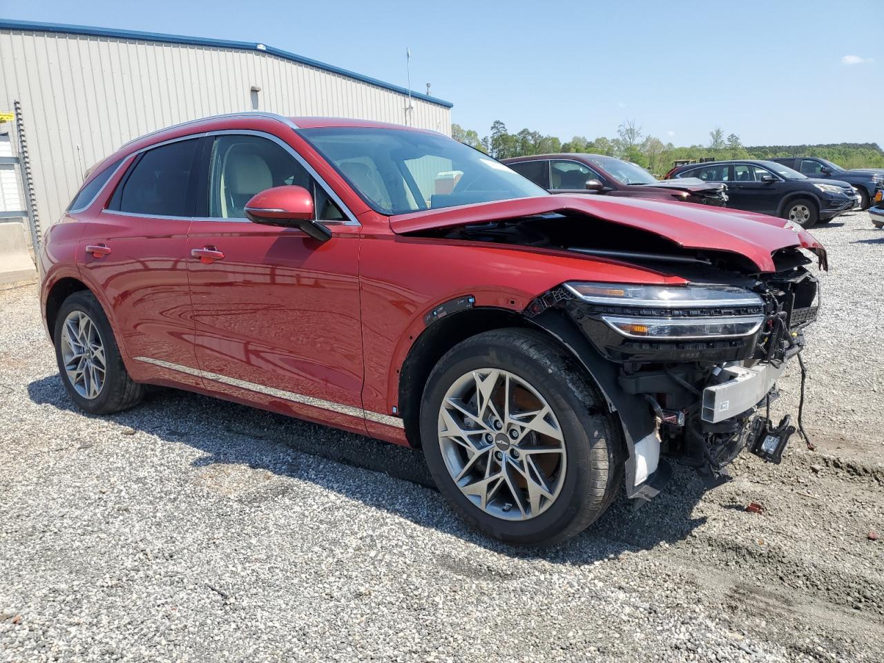 FairThe red GENESIS GV70 BASE 2025 shows significant front-end damage, categorized as Body damage. The car has a 'Run & Drive Verified' start code, indicating it can be driven. Damage includes a crumpled front end, affecting the lights, front body panels, and likely the frame. The wheels appear intact. Interior damage is also present, and the airbags have deployed. It's a candidate for repair.