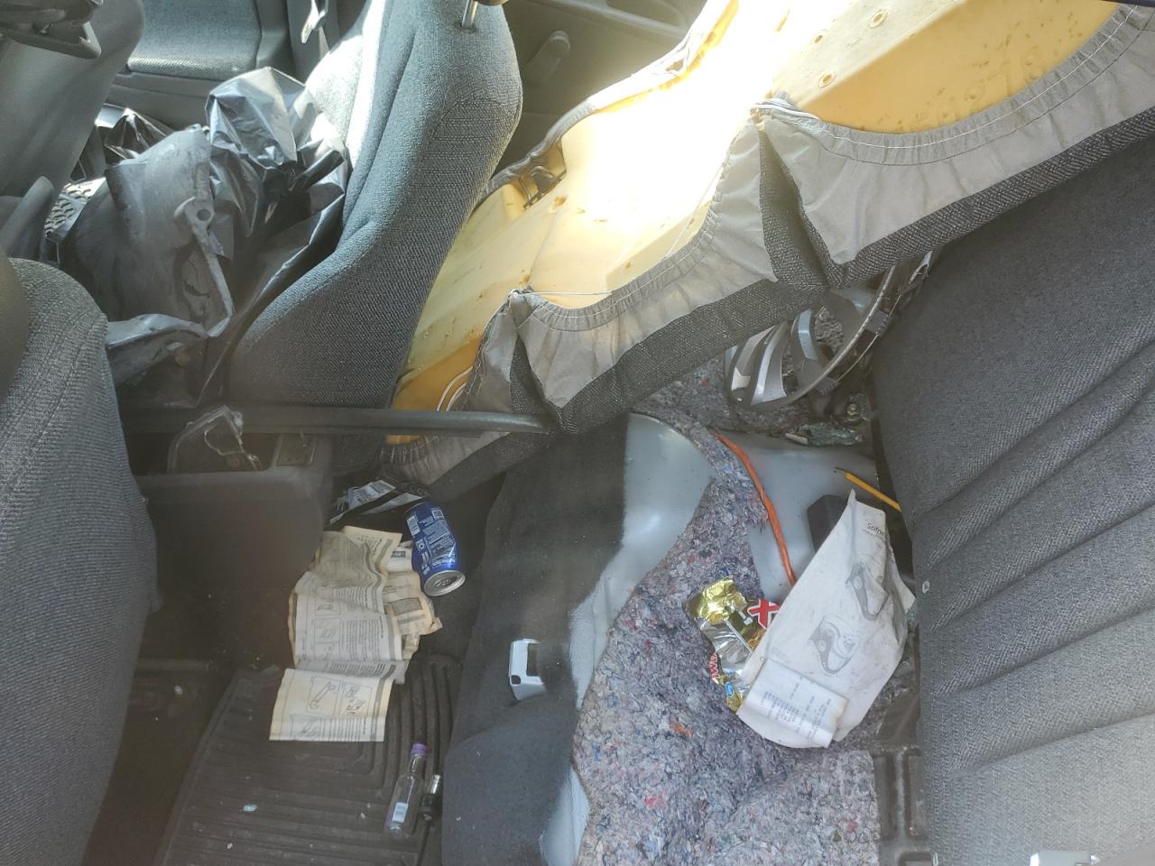 Severe damage to body panels and potential frame issues. Interior damage includes possible airbag deployment and dashboard damage. Non-functional wheels and lights.