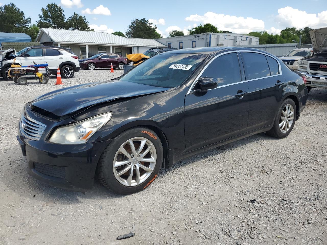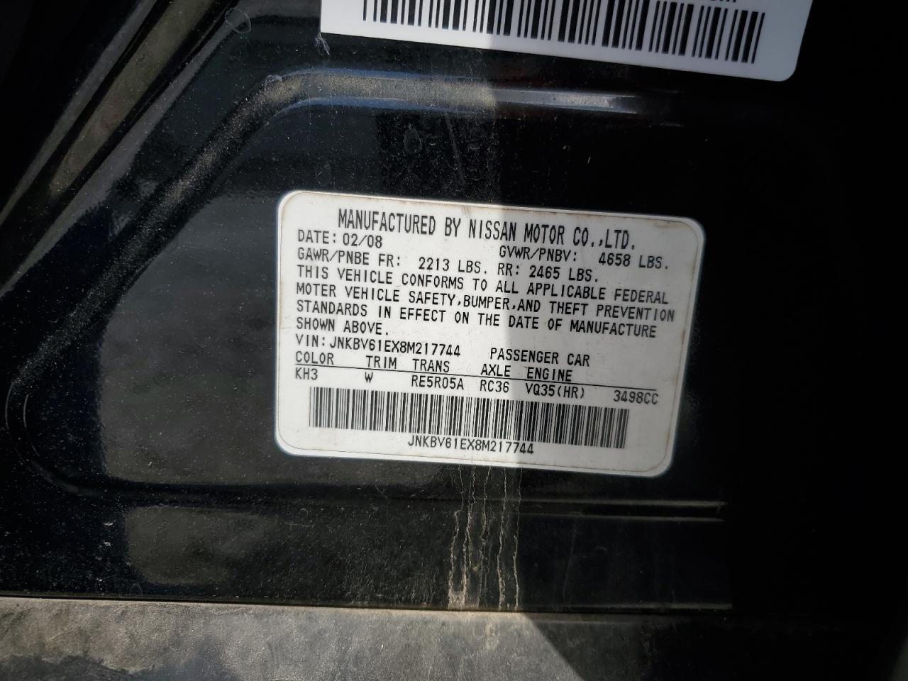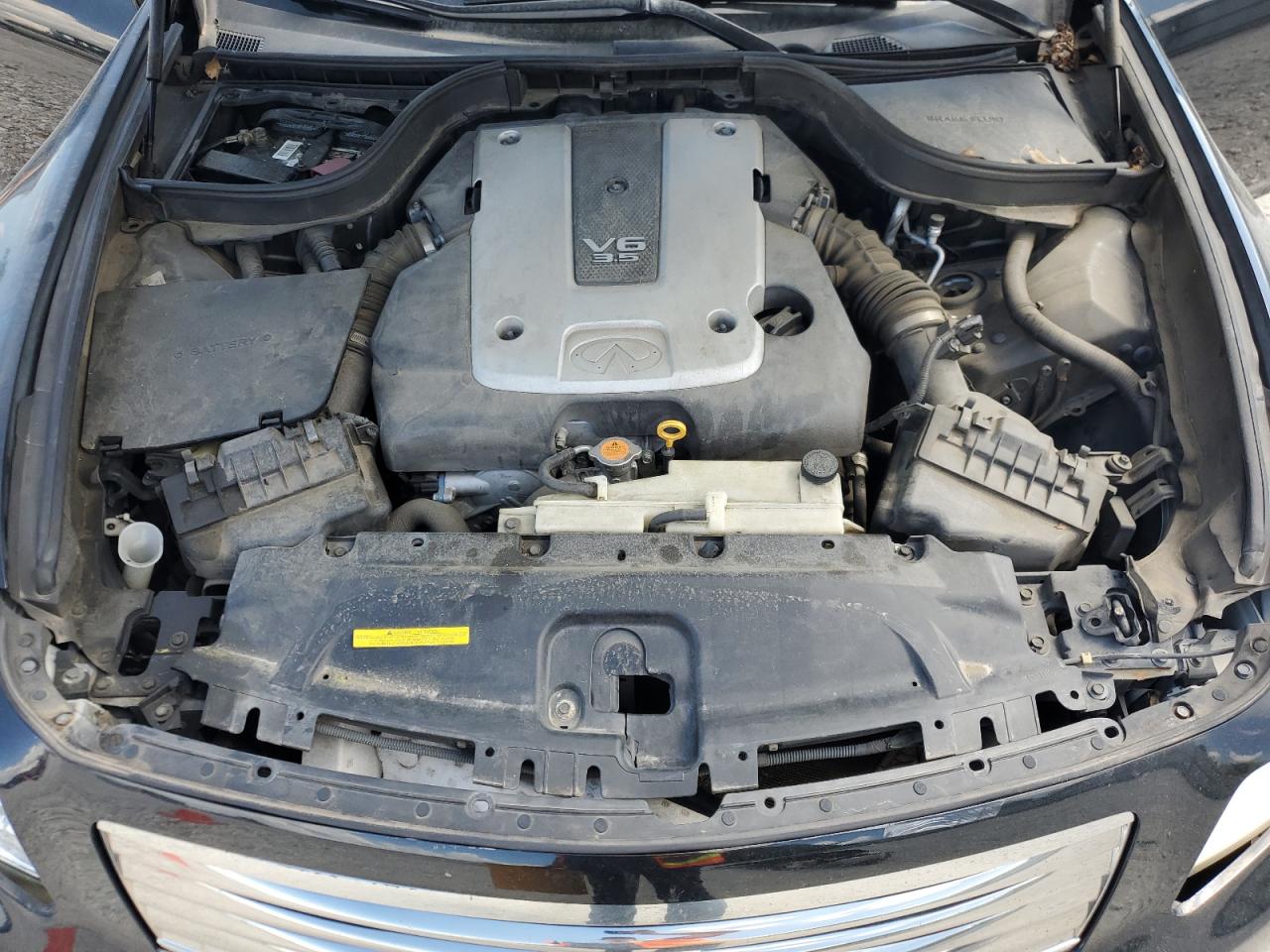 FairThis is a black 2008 INFINITI G35. The vehicle has sustained significant damage. The front end is heavily damaged with the primary damage being to the front end and secondary damage to the undercarriage. The lights and glasses appear to be affected. The interior shows signs of wear and tear, with deployed airbags. The wheels appear to be in decent condition despite the overall damage. The car's state is poor and requires considerable repair.