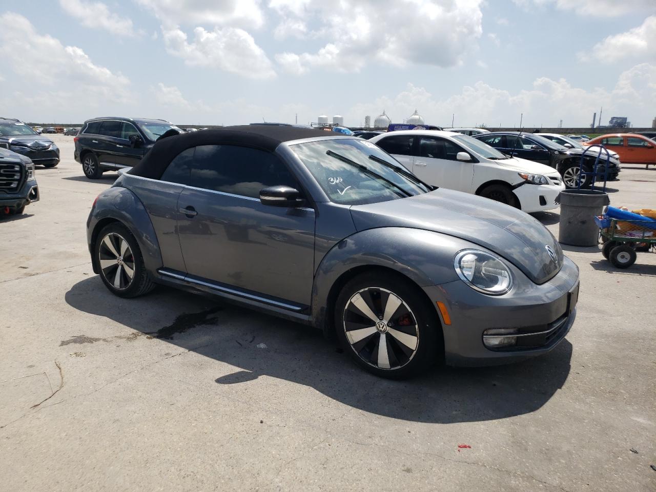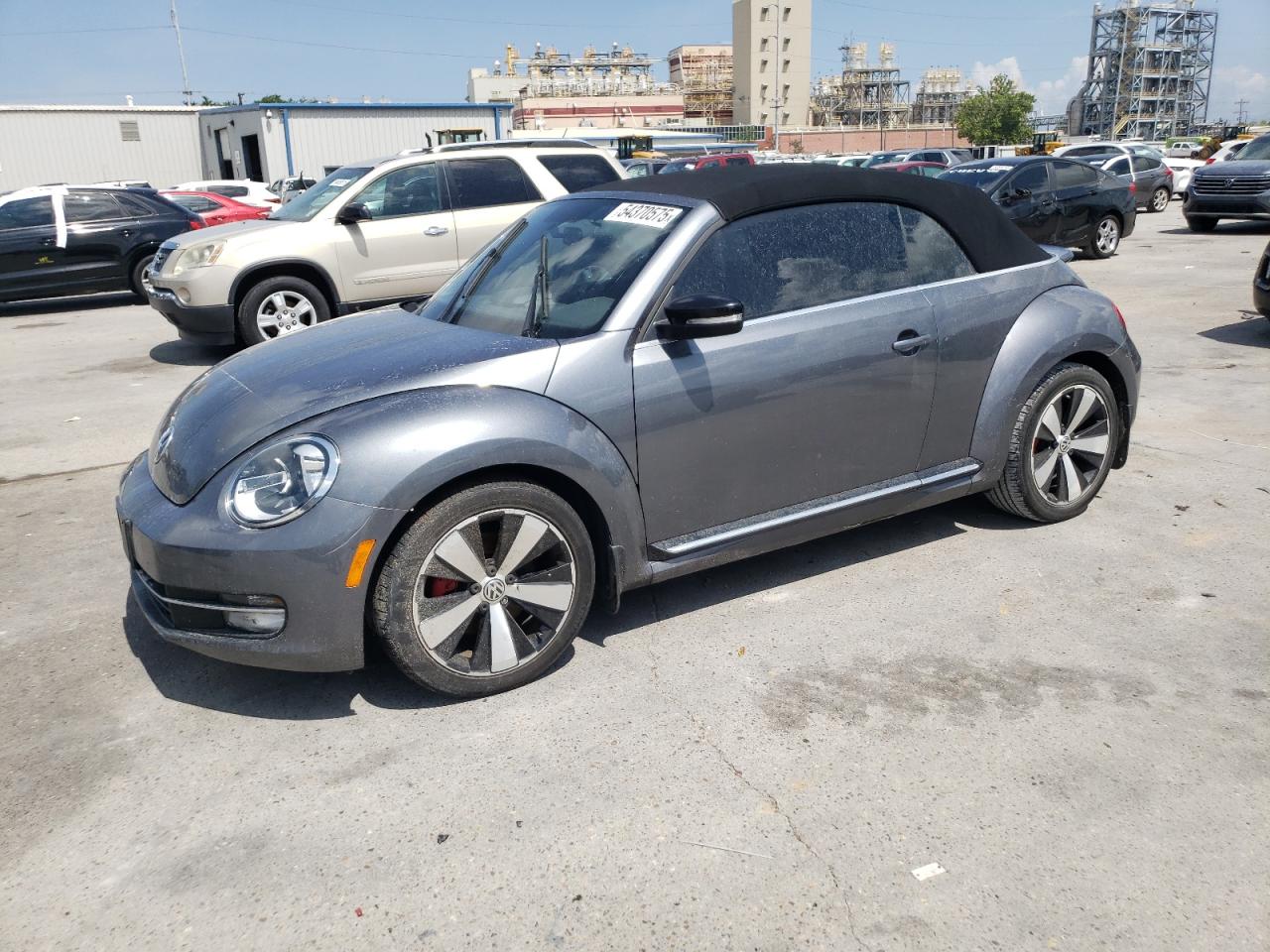 FairThis 2013 VOLKSWAGEN BEETLE TUR has suffered from water damage and exhibits minor dent and scratches. The vehicle's exterior is gray. The images show the car is likely drivable despite the damage. The convertible top is present, and the wheels appear intact. Interior condition suggests moderate wear and tear.