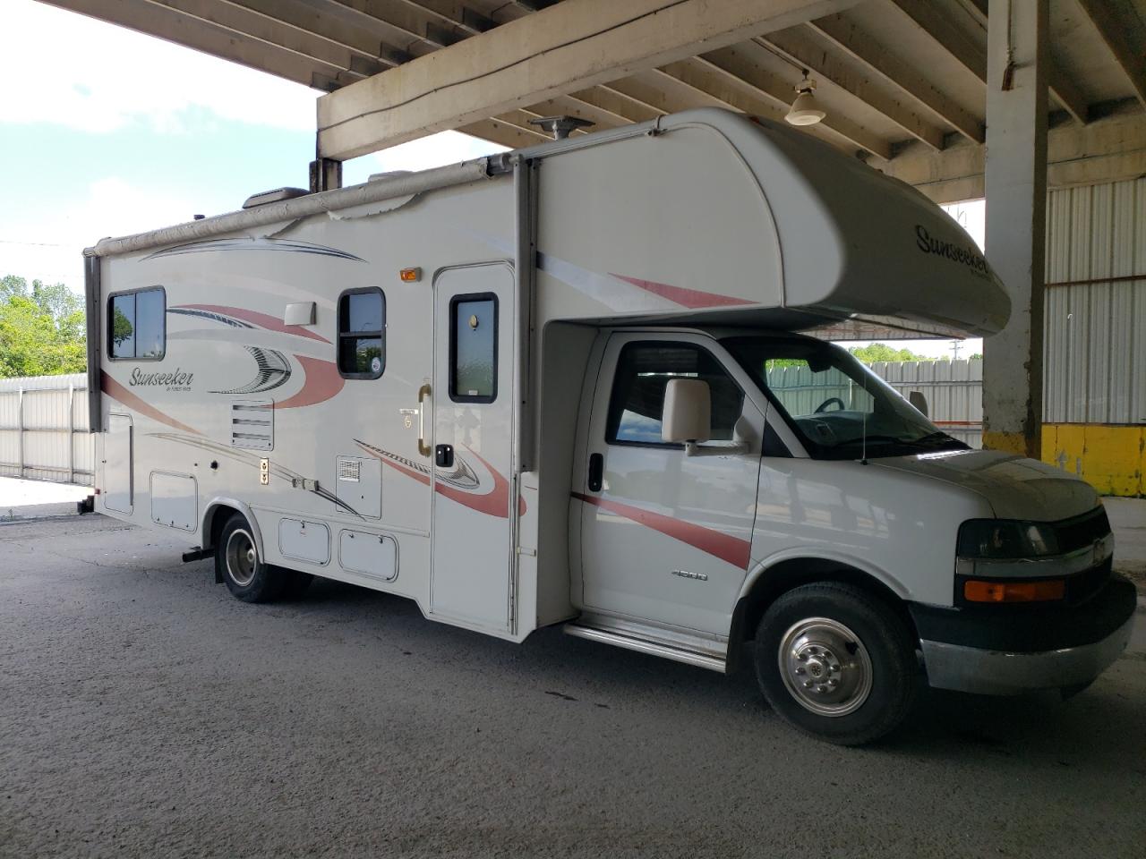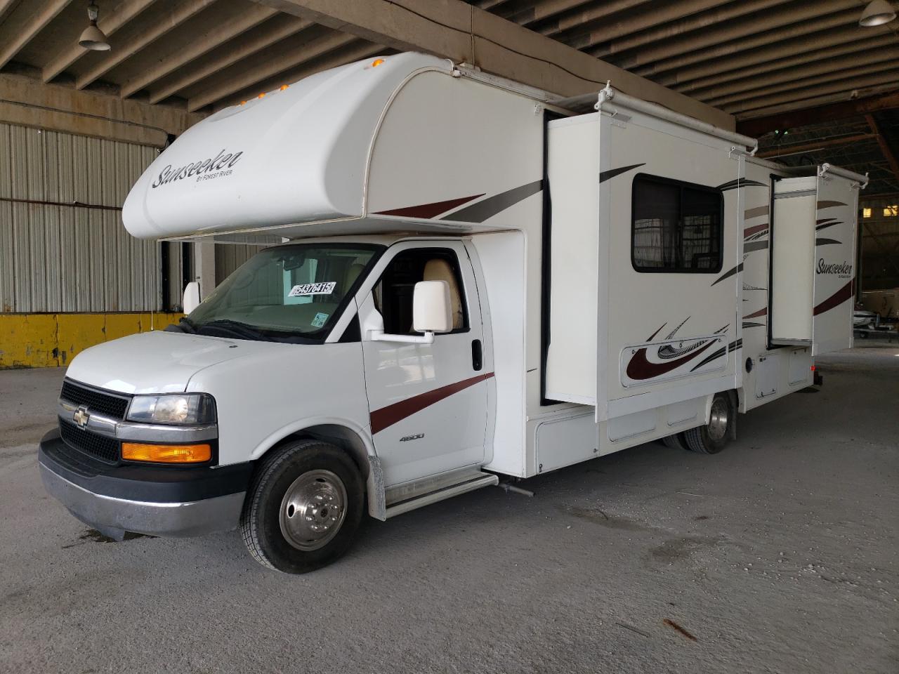 FairThis is a 2015 Chevrolet Express G4 RV, showcasing signs of mechanical and water/flood damage. The exterior is white, with the engine bay open and showing potential issues. The interior presents wear and tear, with visible damage and potential water-related issues. The vehicle's starting code is Run & Drive Verified.