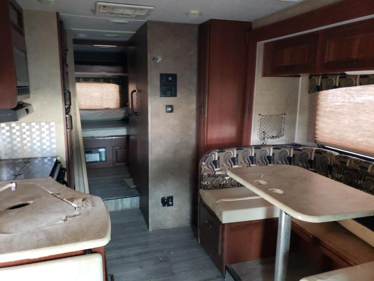 The RV has significant mechanical and water/flood damage. The body shows some wear, wheels look intact. Interior damage includes wear and tear and potential water damage.