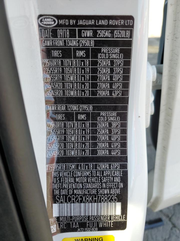 FairThe 2019 LAND ROVER DISCOVERY shows significant damage, primarily to the FRONT END and SIDE. The white SUV has extensive damage to its body panels. The interior appears to be in good condition, with visible wear and tear. The car is Run & Drive Verified.