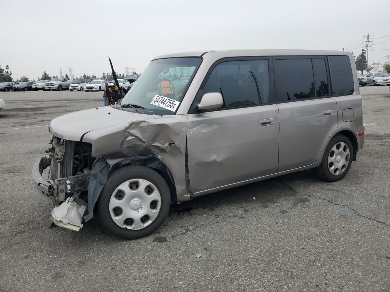 Extensive front end and side damage on a silver 2005 Scion xB. Front end damage includes bumper, fenders, and lights. Side damage is also visible. Interior shows signs of wear.