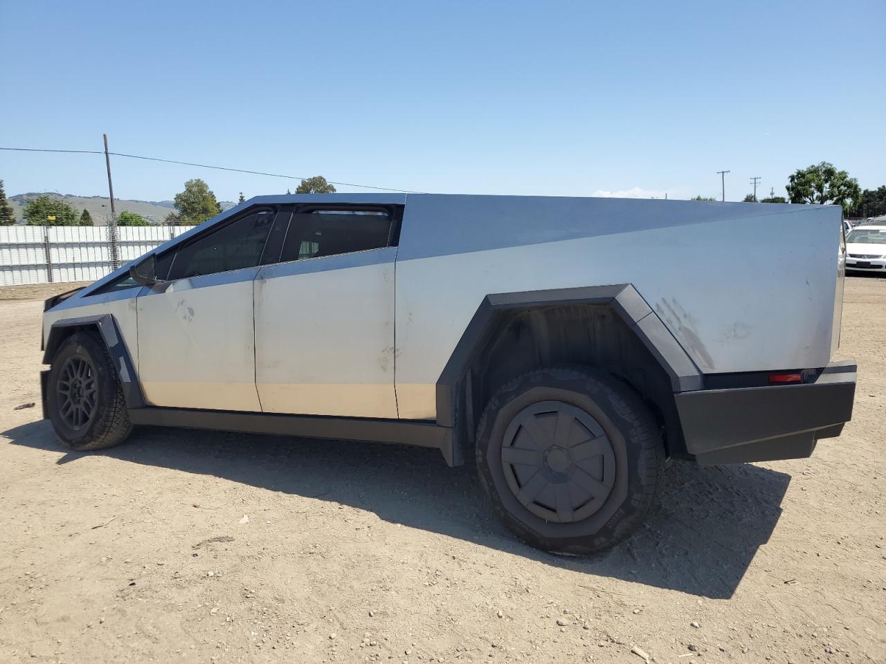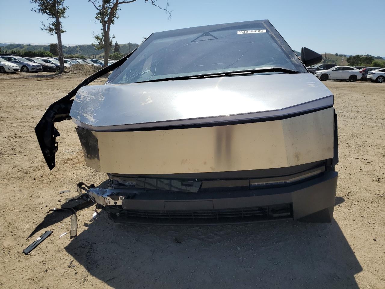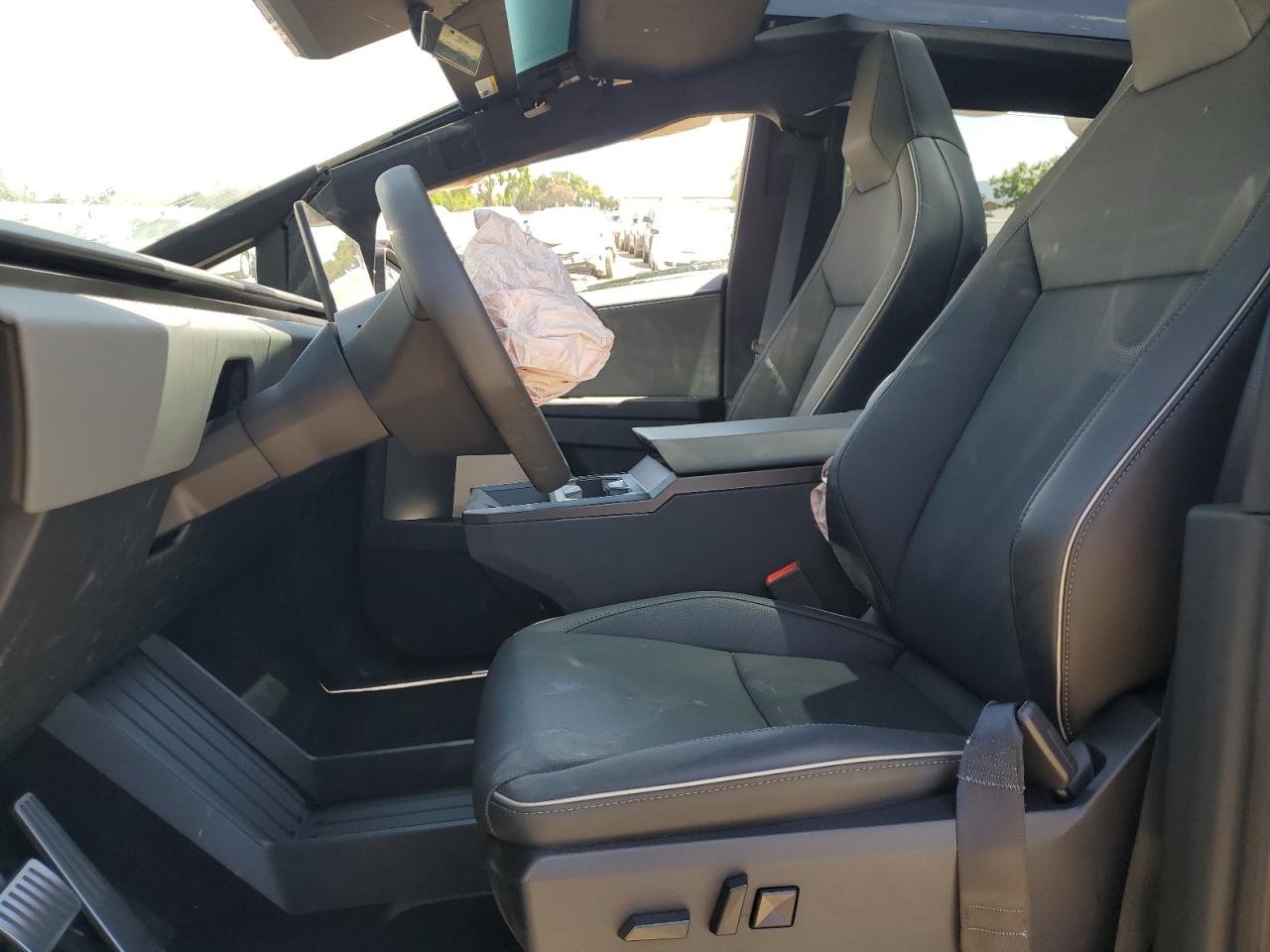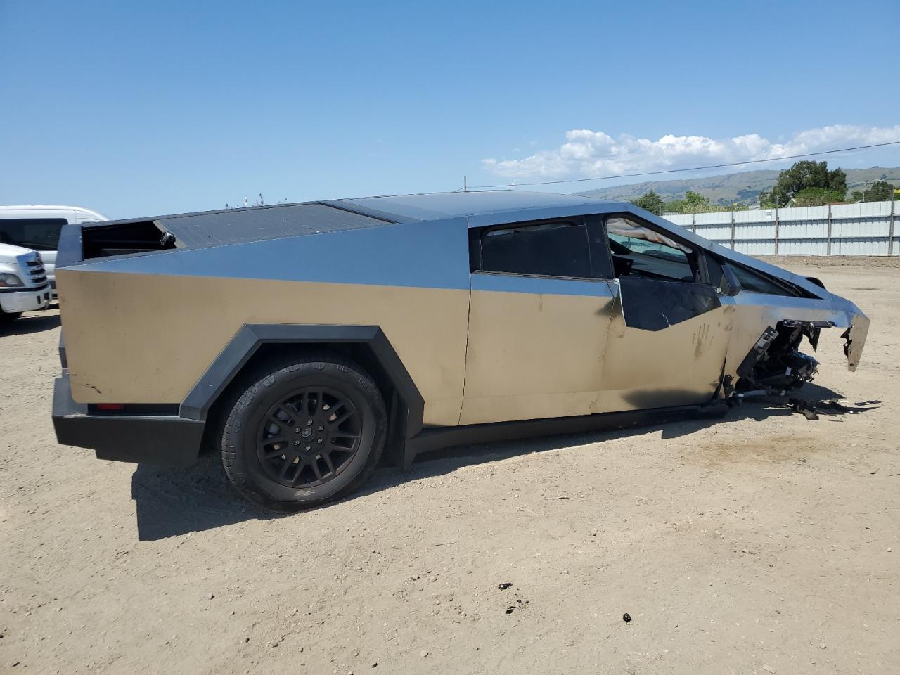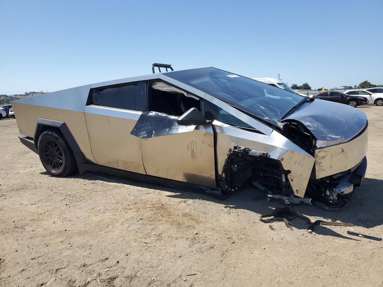 FairThis is a damaged 2024 Tesla Cybertruck. The primary damage is to the front end, with secondary damage to the side. The silver-colored body panels show significant impact damage, including crushed front end components, deformed body panels, and compromised glass on the front and possibly side windows. The wheels appear to be intact, but the vehicle's overall structure has sustained considerable damage. Interior damage is evident, with deployed airbags and visible damage to the dashboard and seats. This Cybertruck requires substantial repairs.