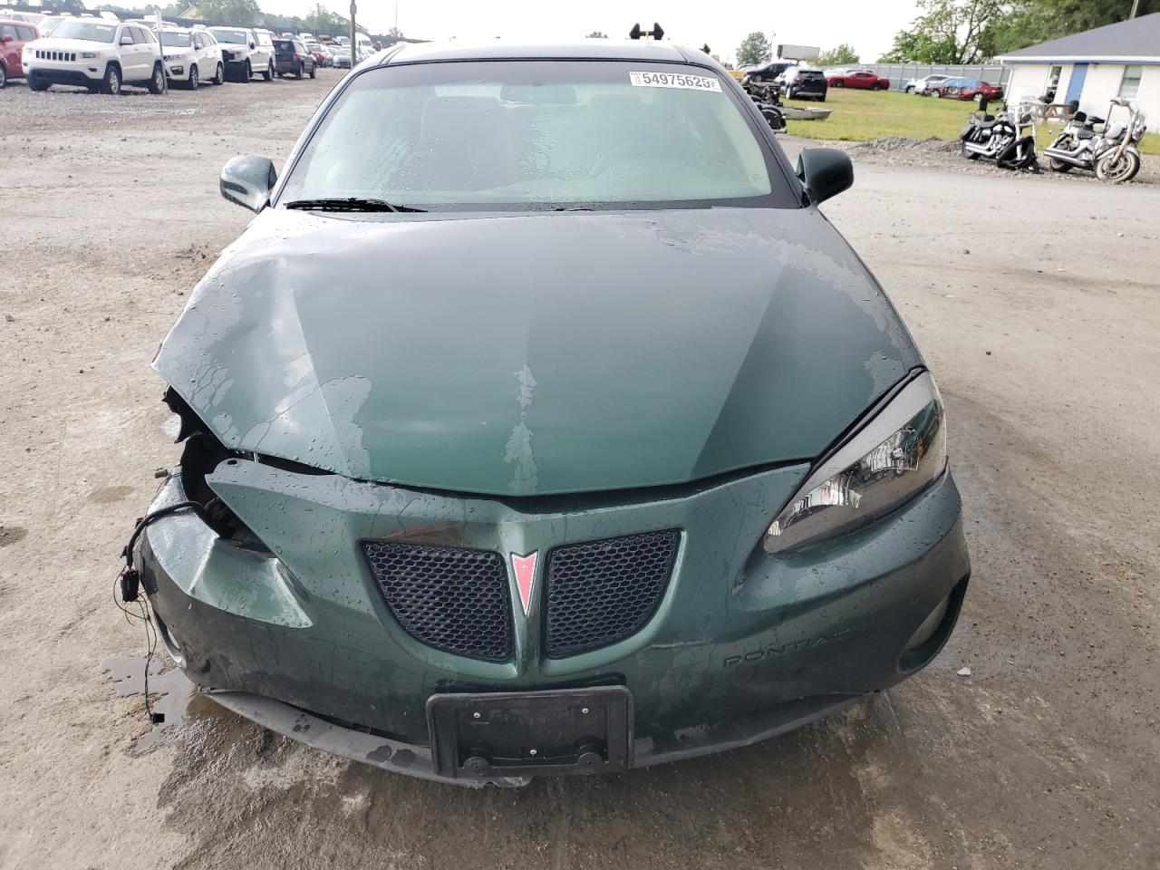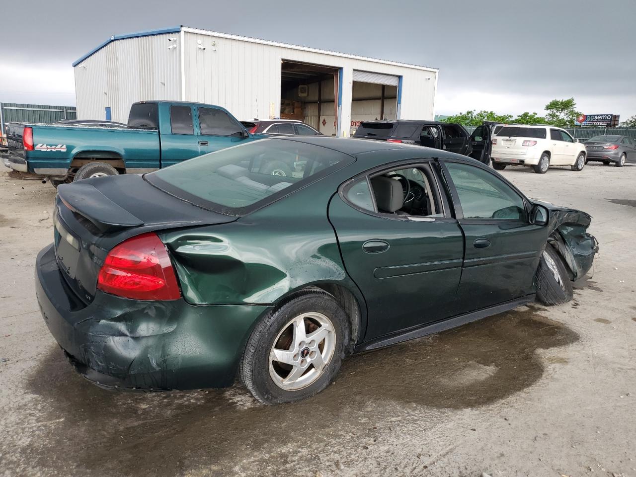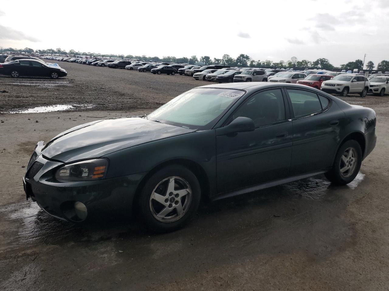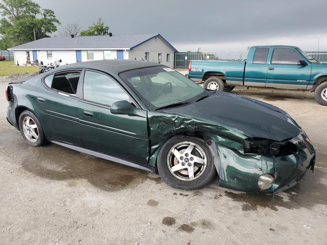 FairThis 2004 Pontiac Grand Prix is dark green and shows significant damage. The front end has considerable damage, and the rear end also shows signs of impact. This is a car, that has been in a crash, it has damage, but the interior seems to be in better shape.