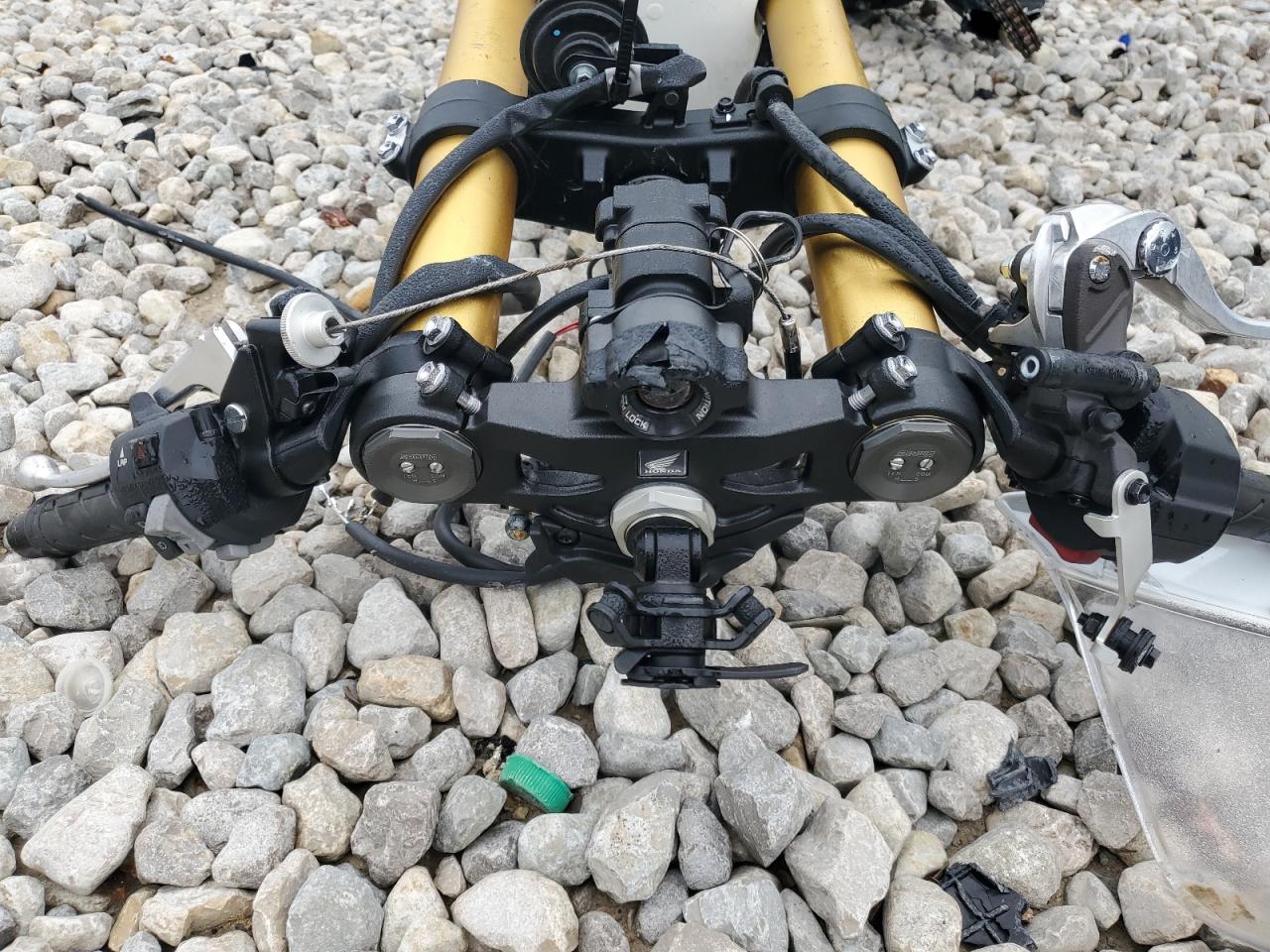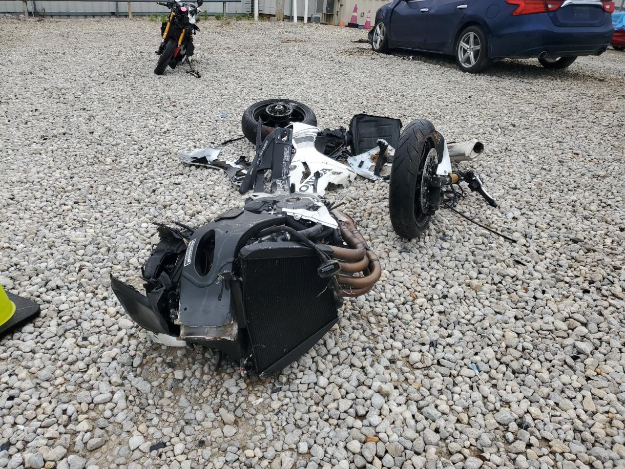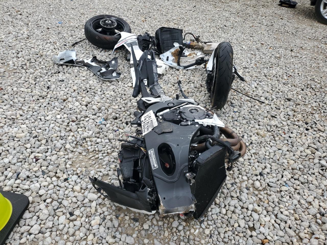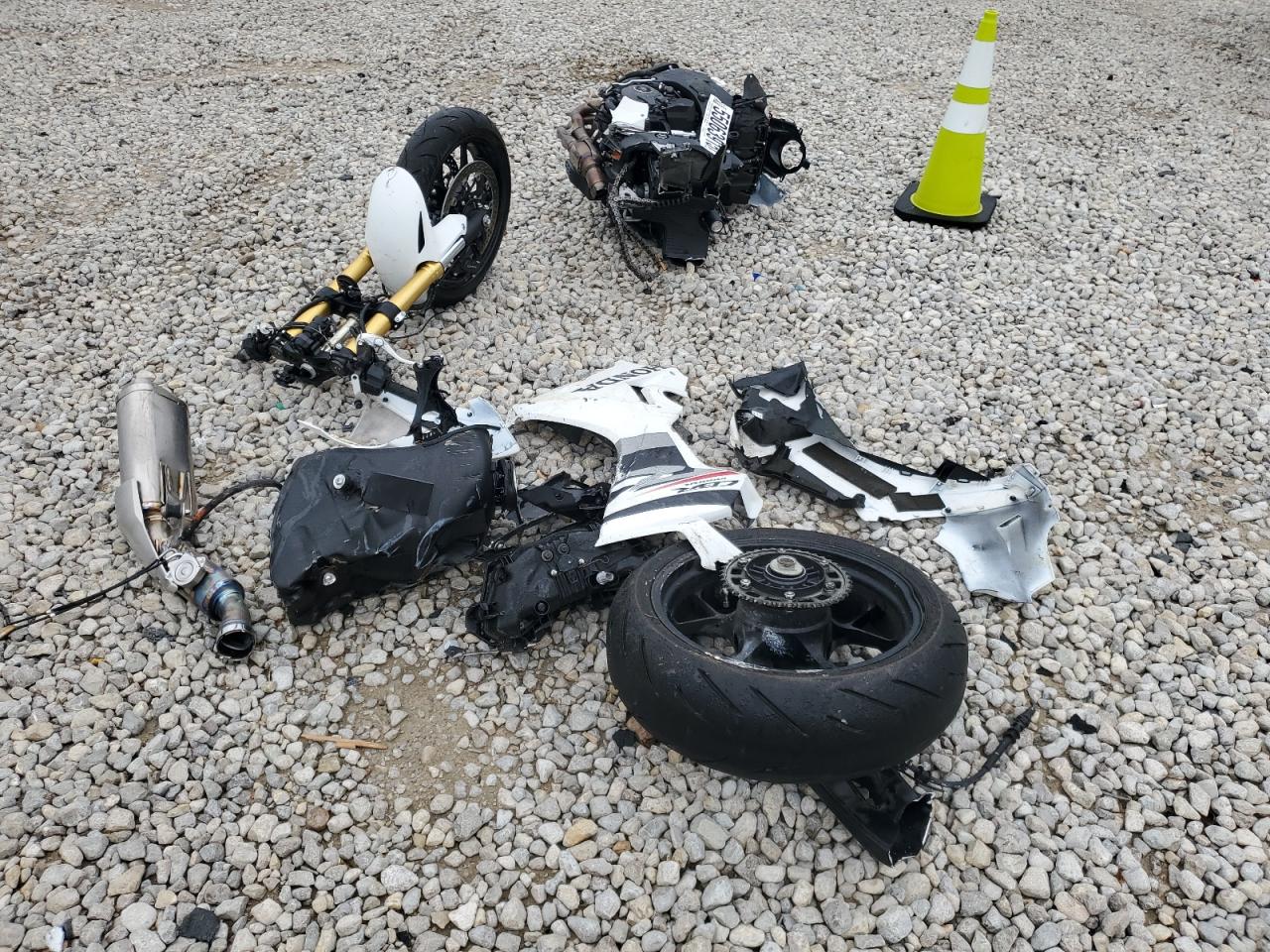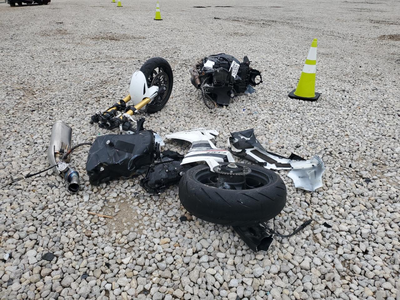The motorcycle has major damage to its body panels, engine, frame, and wheels. Visible damage includes shattered fairings, a detached engine, and twisted frame components. The motorcycle is beyond repair.