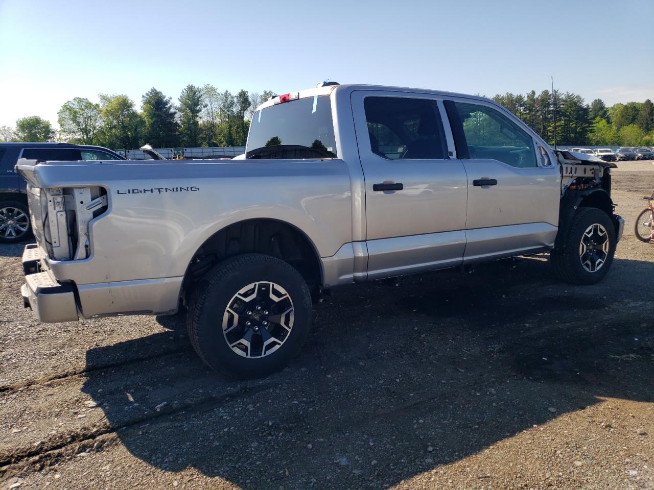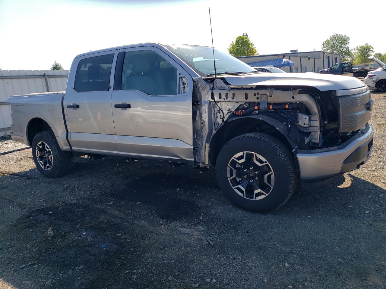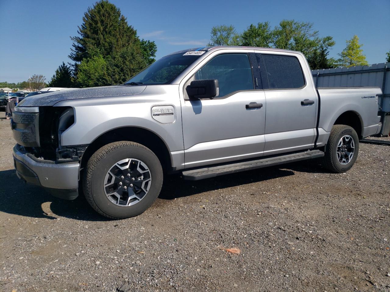 FairThe 2023 Ford F-150 Lightning in silver shows significant damage, primarily to the front and rear ends. The front end has extensive damage, with components missing, while the rear end also shows damage. The interior appears to be in decent condition, with only moderate signs of wear. The wheels appear to be intact, and the vehicle's start code is 'Run & Drive Verified'.