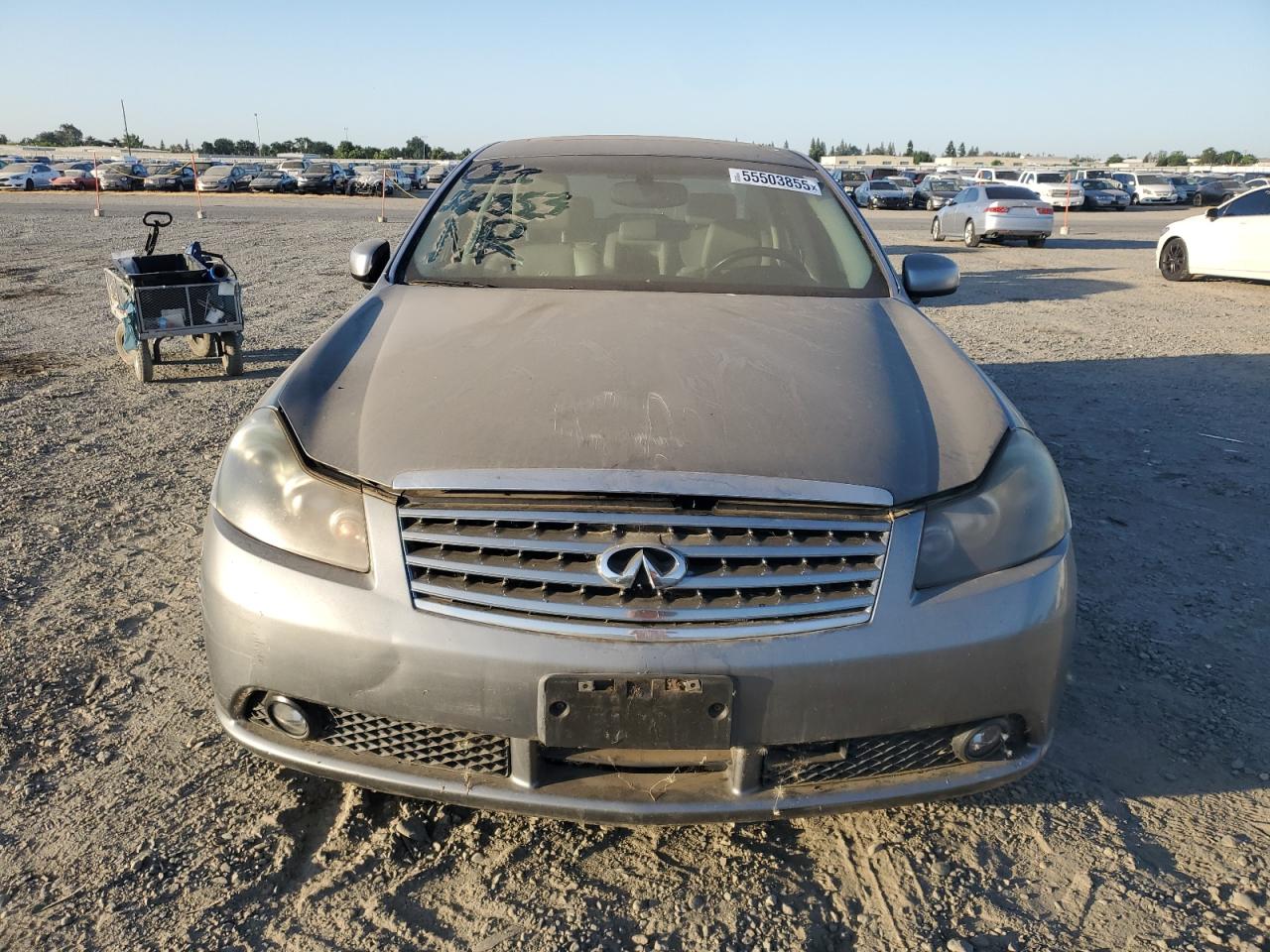 GoodThe INFINITI M35 BASE 2006 is a gray sedan. It has minor cosmetic damages, including scratches and dents. The wheels appear to be in good condition. The lights and glasses seem intact. The interior shows minimal wear and tear. Overall, the vehicle is in a fair state, and appears to be drivable. The airbags are not deployed.
