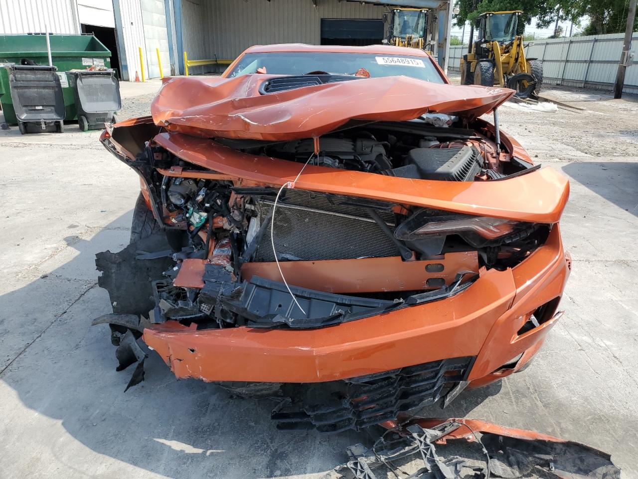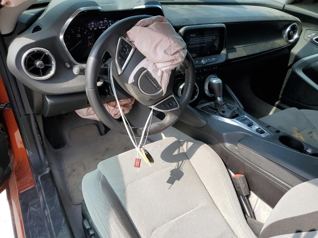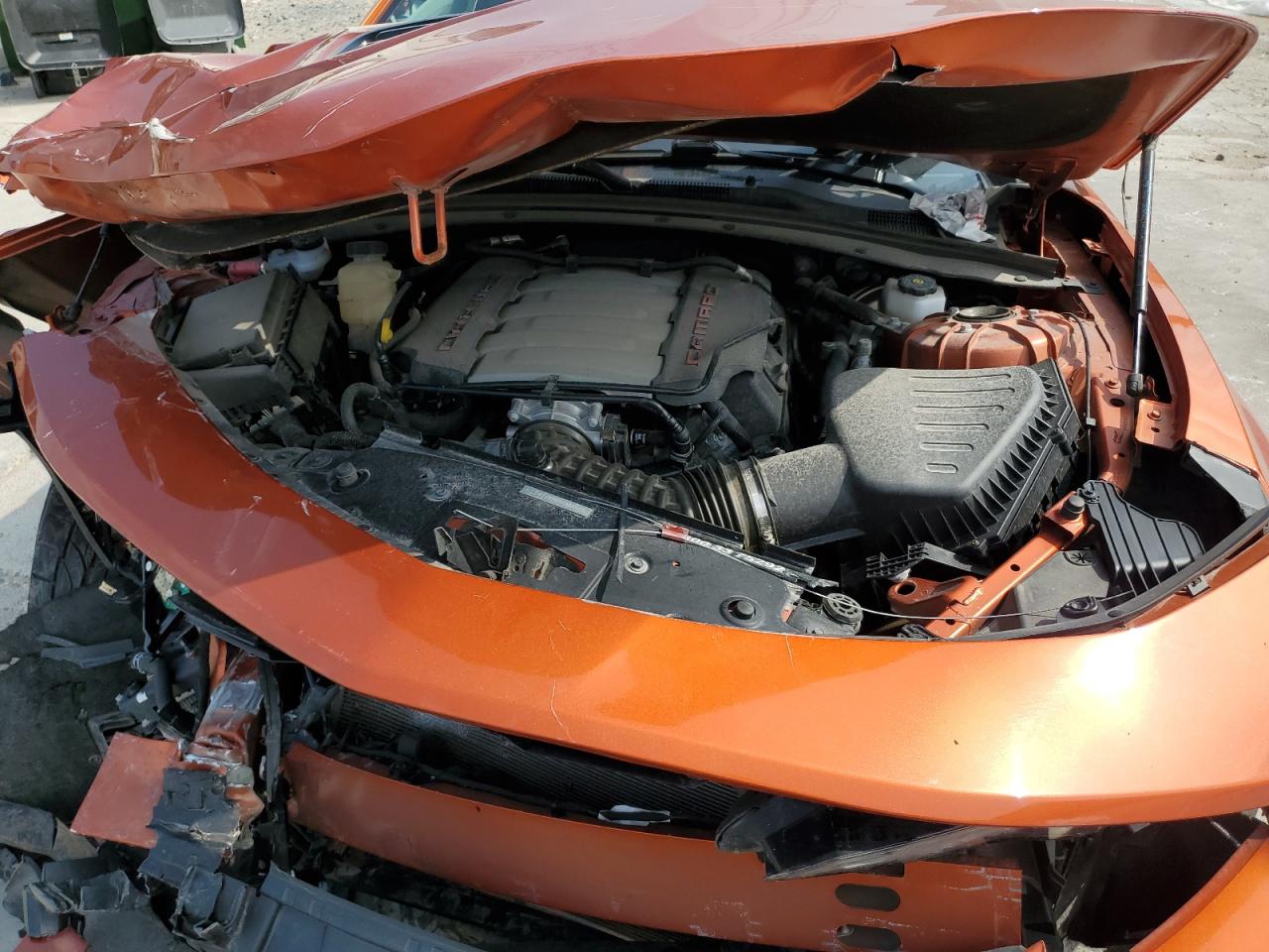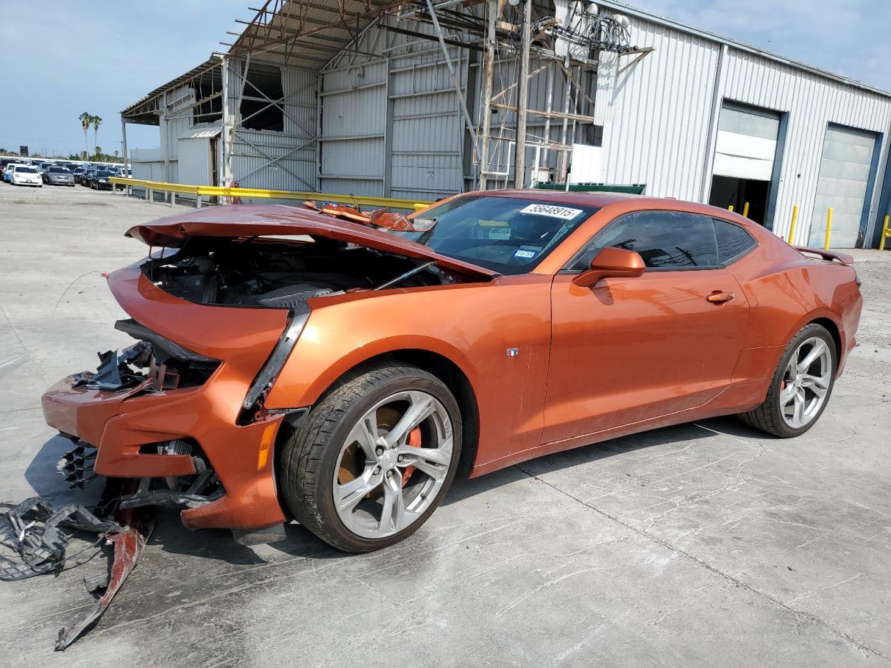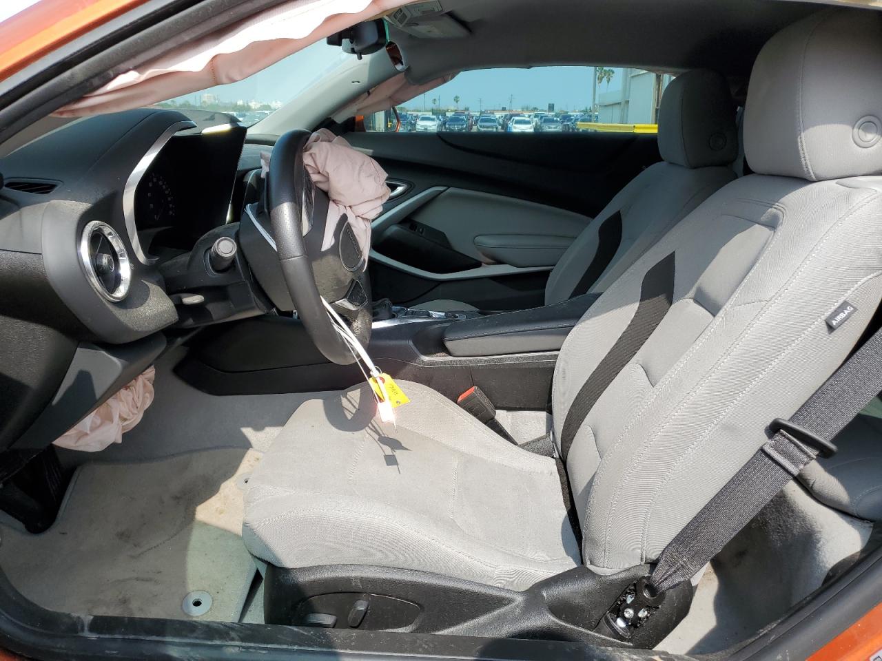 PoorThe 2023 CHEVROLET CAMARO LT1 in orange displays significant damage, primarily to the front end. The vehicle has sustained significant damage. The wheels appear to be intact, but the front lights and windshield likely require replacement or repair. Interior shows deployed airbags, indicating a forceful impact. The odometer shows 34112 miles. This car may not be drivable as is.
