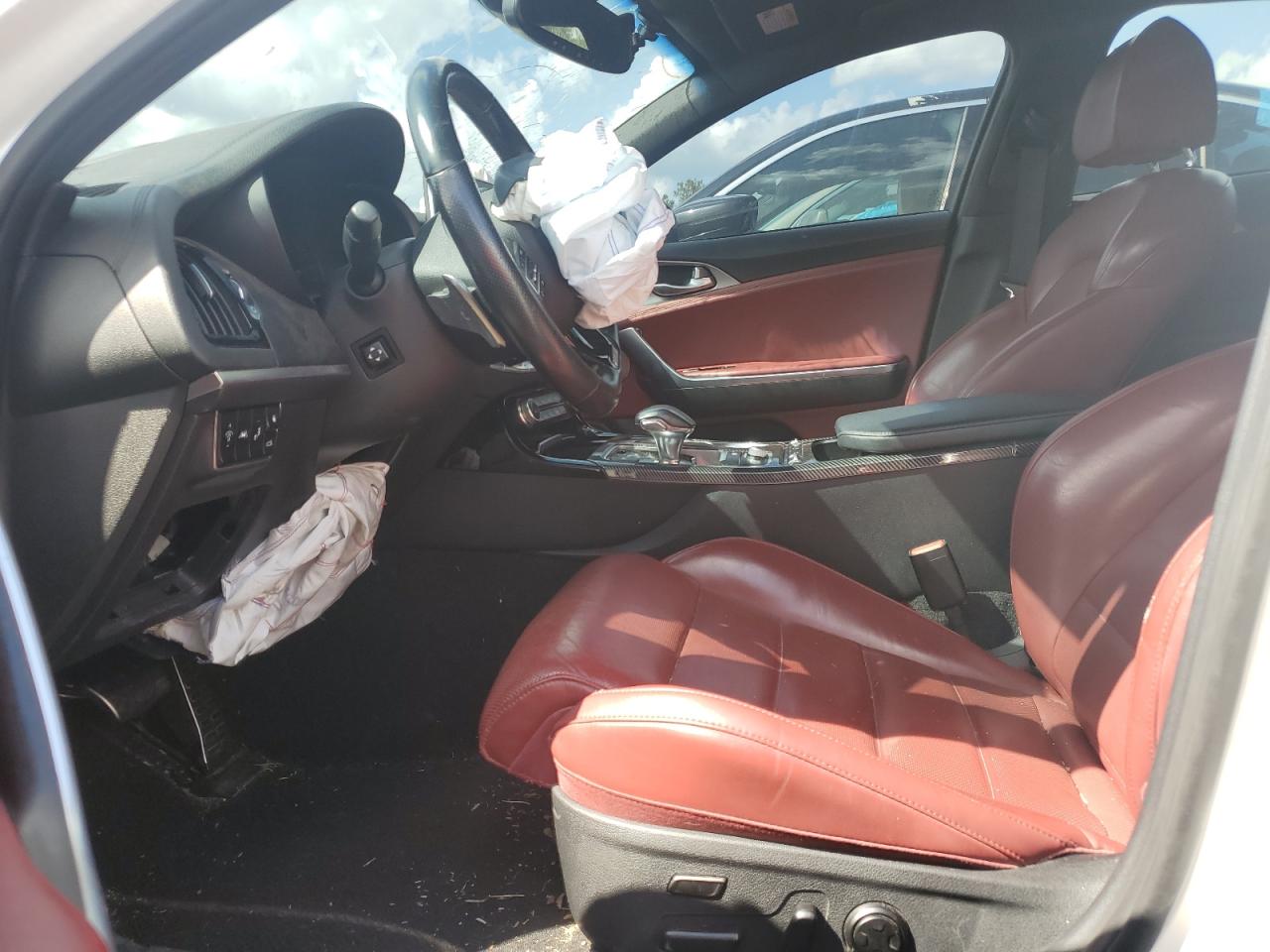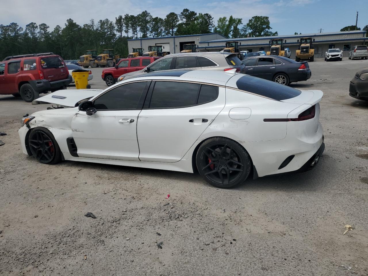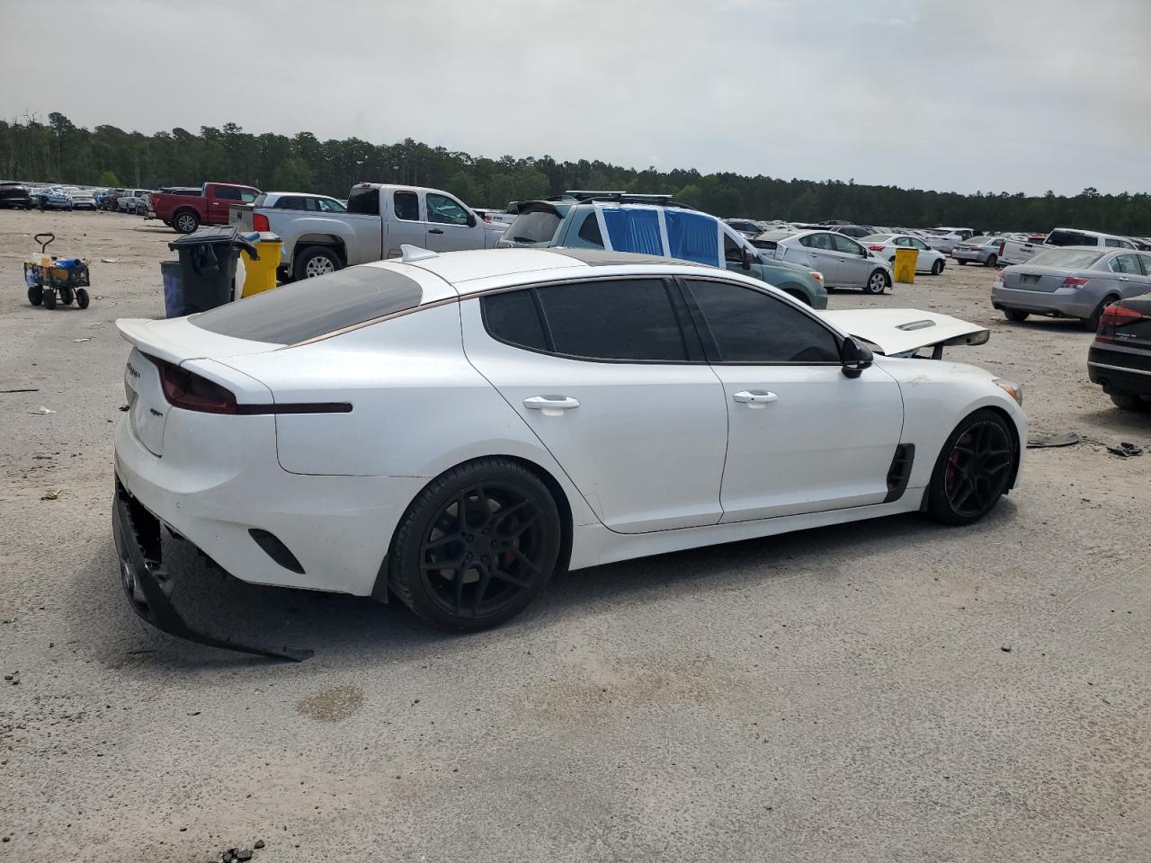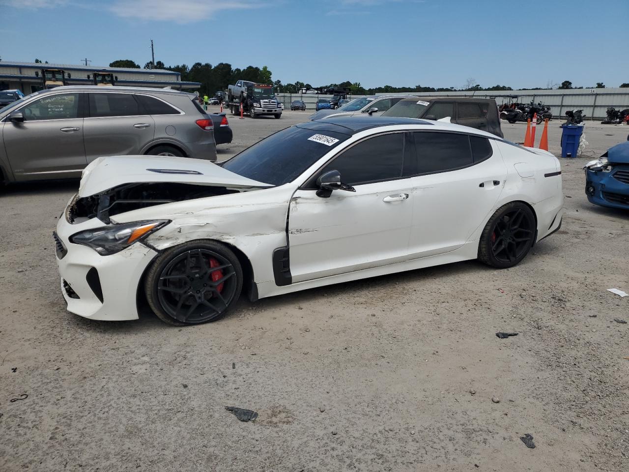 FairKIA STINGER GT 2020 in white color. This vehicle shows signs of significant damage. The exterior has visible damage, mainly to the body panels, including front and rear. The wheels appear to be intact. Interior shows damage, with deployed airbags. The vehicle's overall condition suggests that it requires considerable repair.