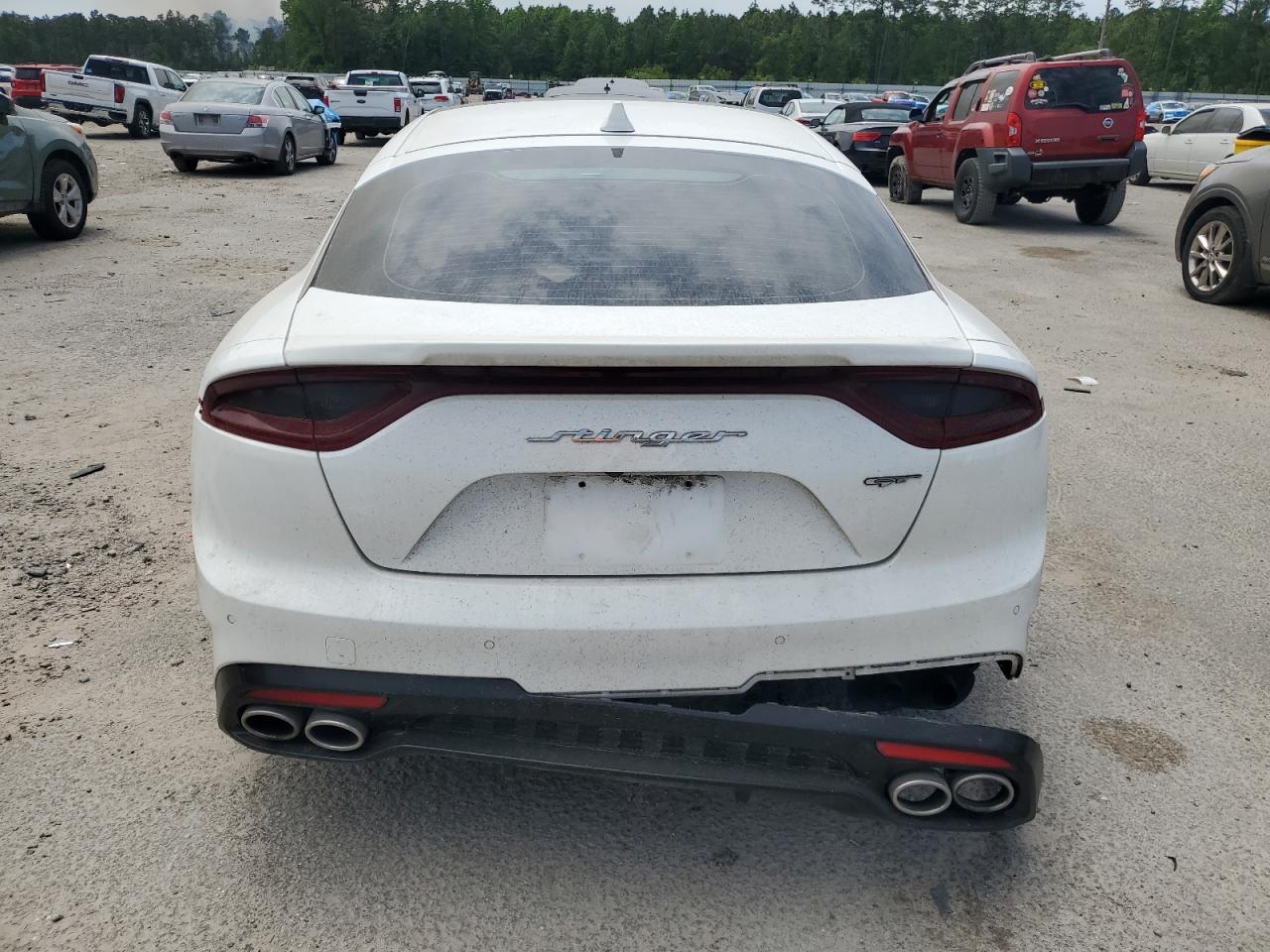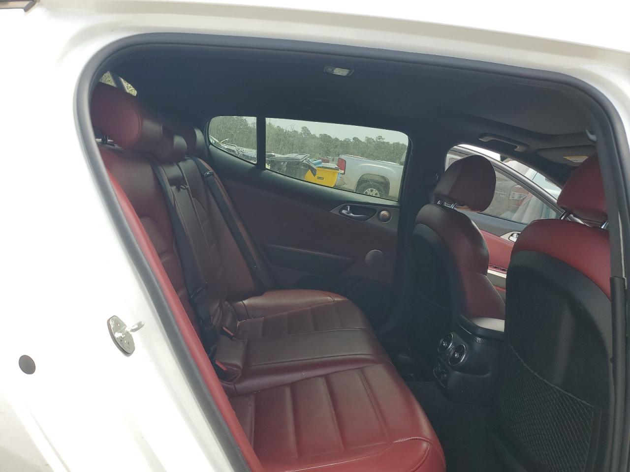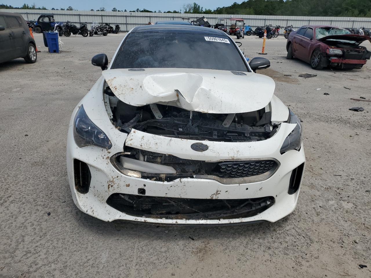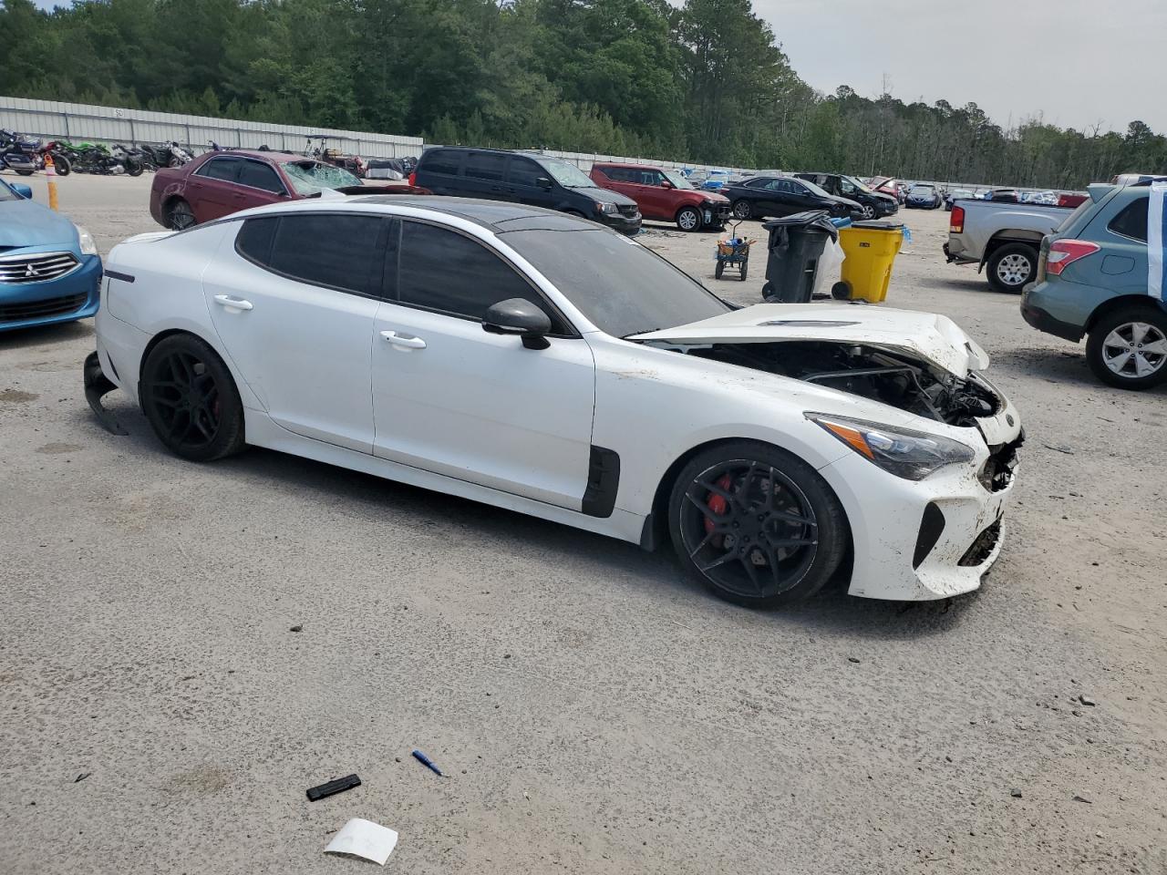 FairKIA STINGER GT 2020 in white color. This vehicle shows signs of significant damage. The exterior has visible damage, mainly to the body panels, including front and rear. The wheels appear to be intact. Interior shows damage, with deployed airbags. The vehicle's overall condition suggests that it requires considerable repair.