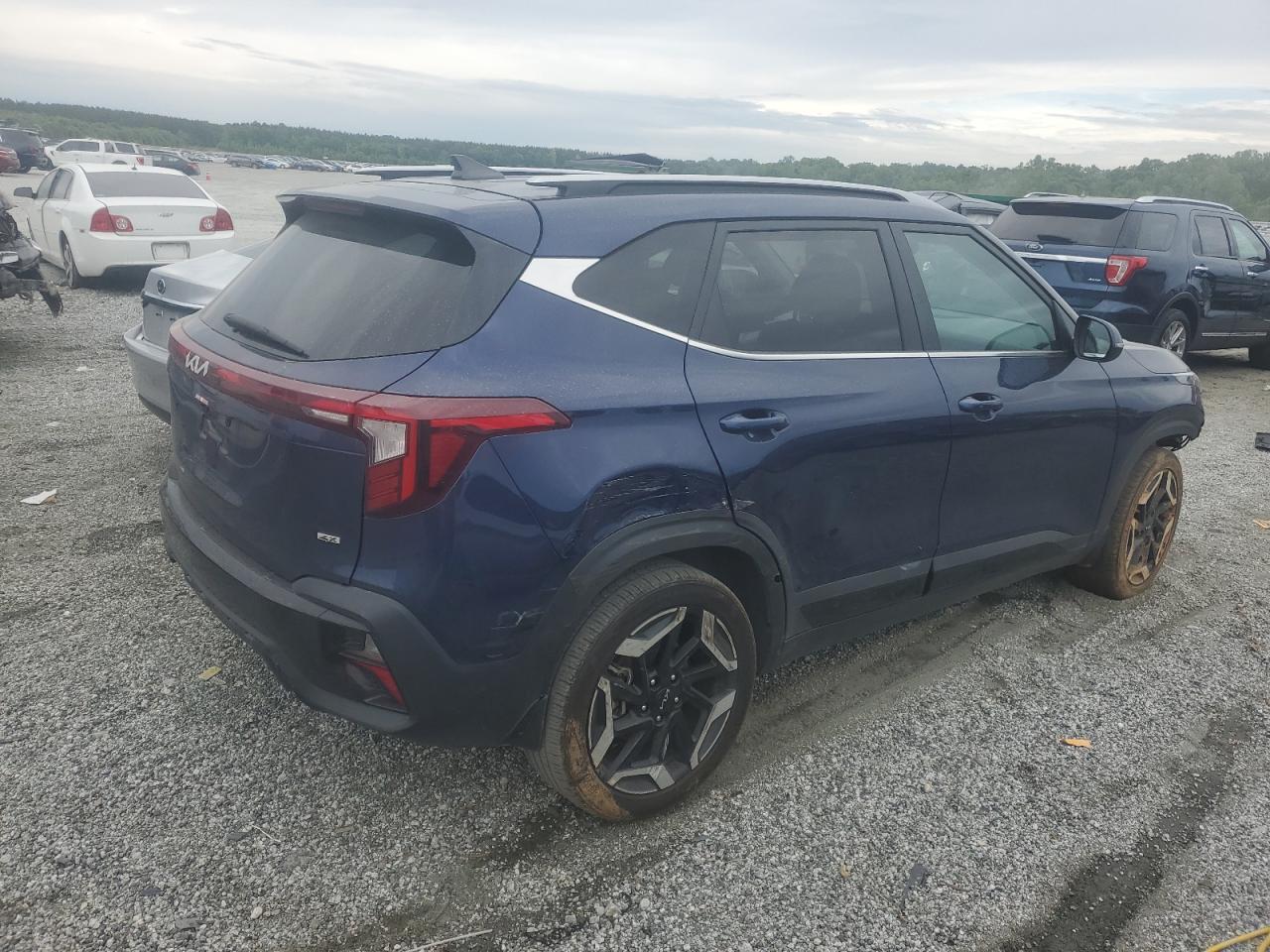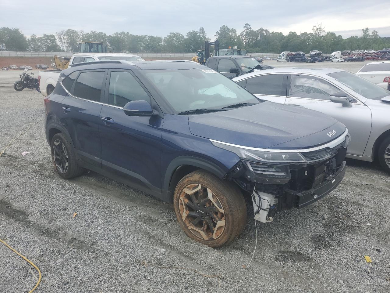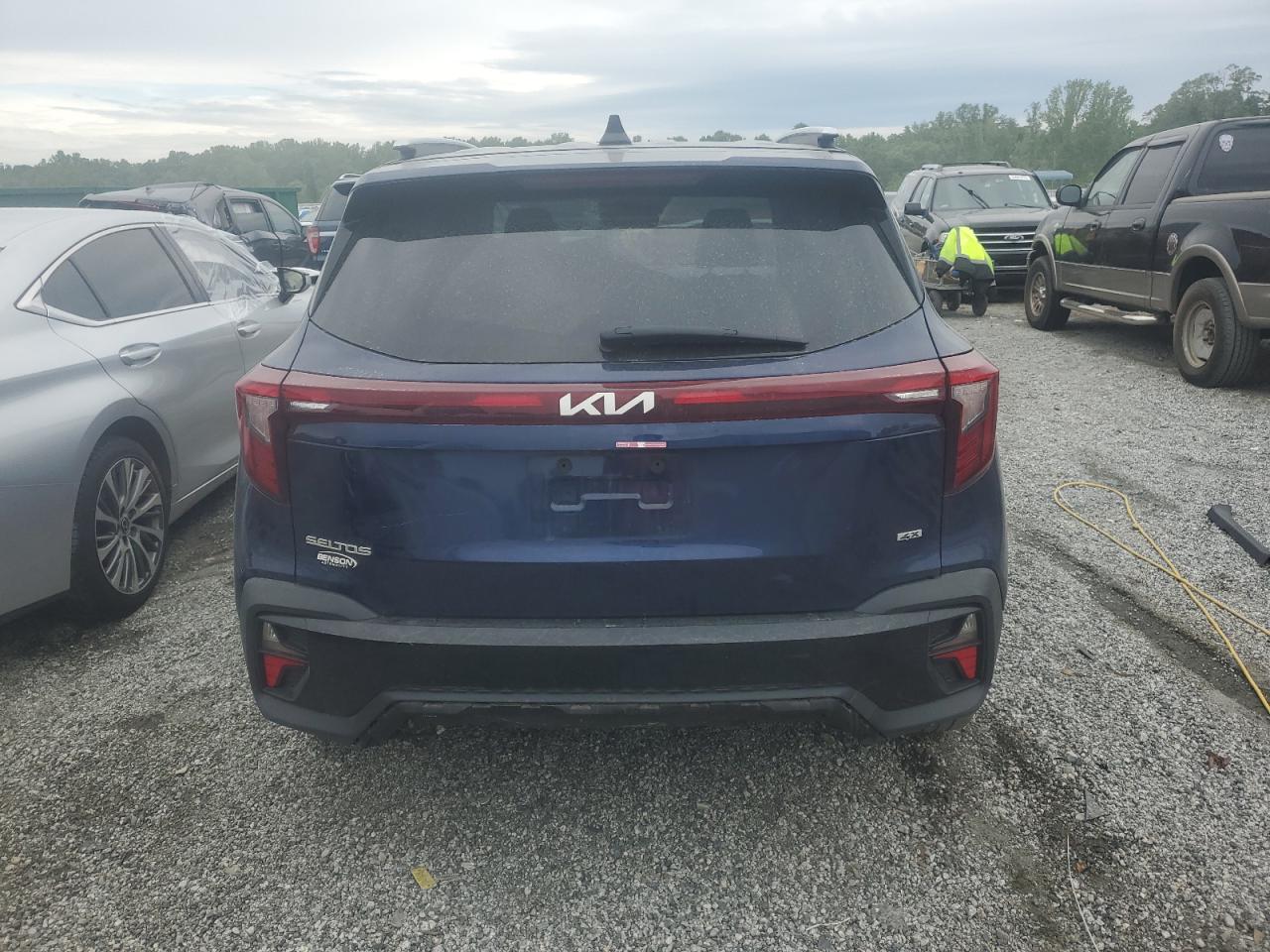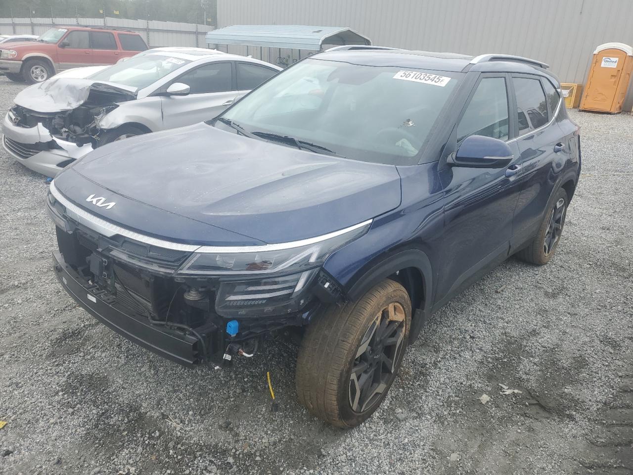 FairKIA SELTOS SX 2024 in blue with front-end damage. Run & Drive Verified. This vehicle presents with noticeable front-end impact. The damage includes a compromised front bumper, and possible damage to the lights. Interior shows airbag deployment and some damage on dashboard, otherwise is fine. Wheels appear intact. Vehicle is drivable, but requires repair.
