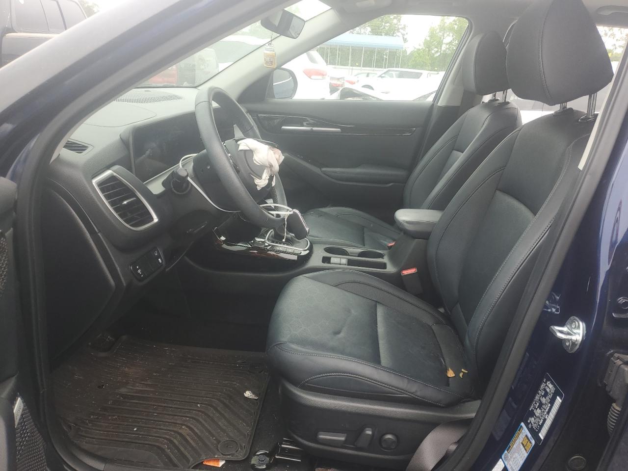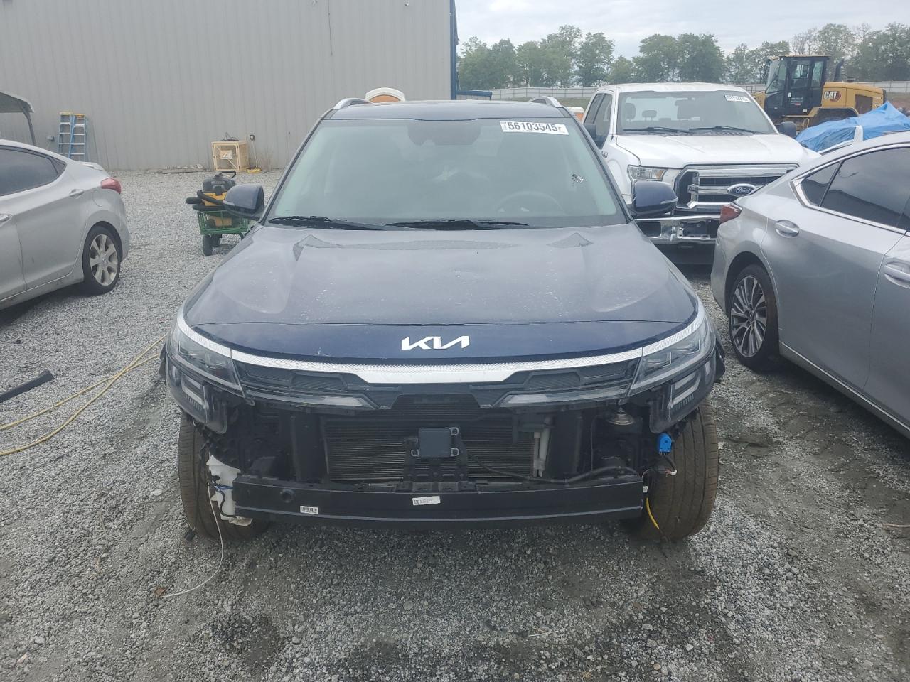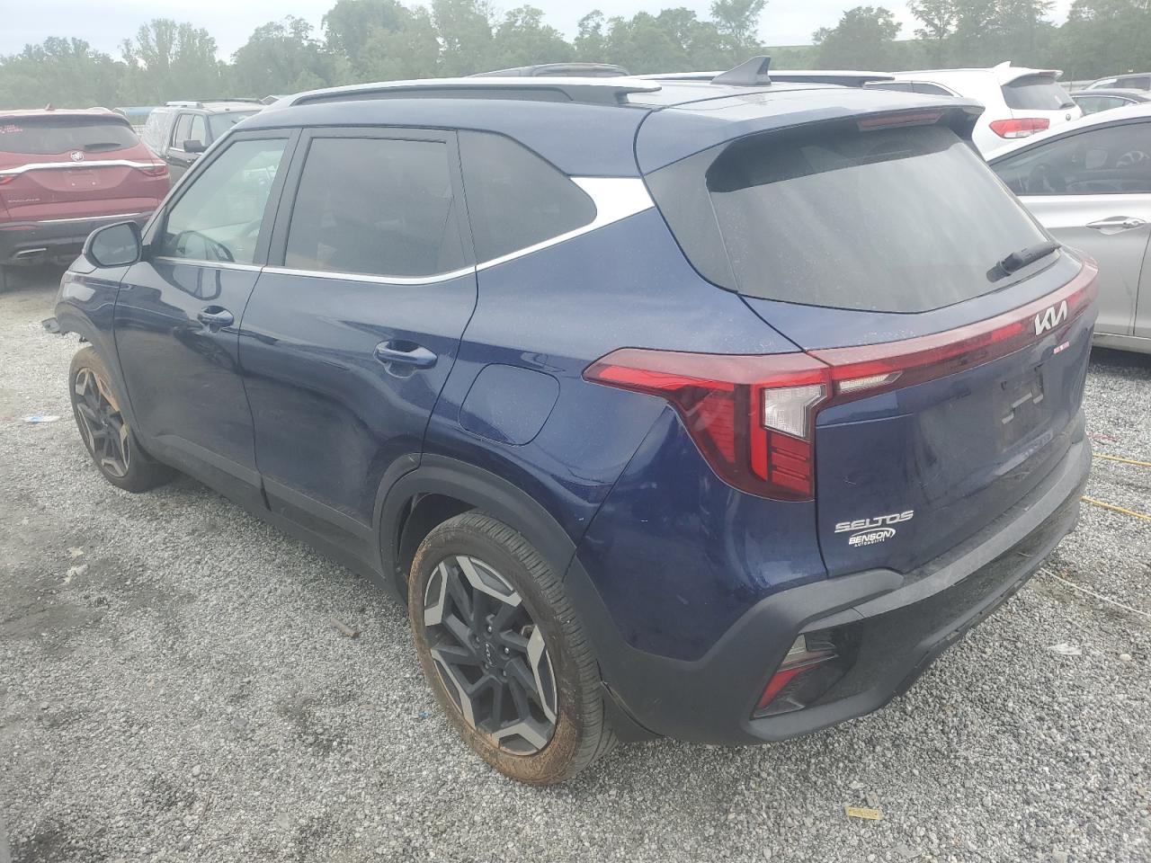 FairKIA SELTOS SX 2024 in blue with front-end damage. Run & Drive Verified. This vehicle presents with noticeable front-end impact. The damage includes a compromised front bumper, and possible damage to the lights. Interior shows airbag deployment and some damage on dashboard, otherwise is fine. Wheels appear intact. Vehicle is drivable, but requires repair.