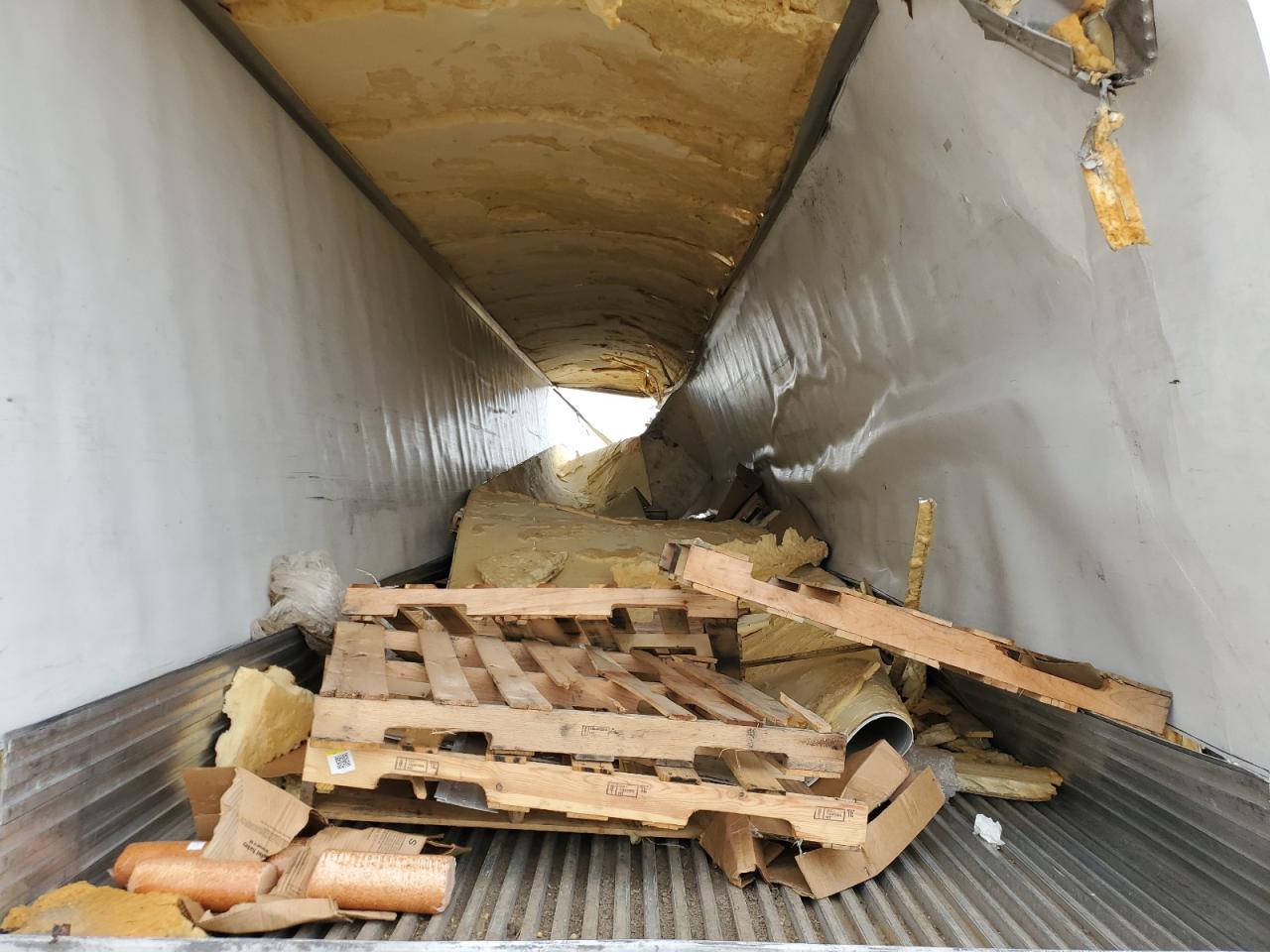 Severe rollover damage. The body panels are extensively damaged, the roof and sides are torn, revealing the interior structure. The interior also suffers significant damage. There is no visible damage to the wheels. The trailer's lights and glasses may be damaged or missing due to the rollover.