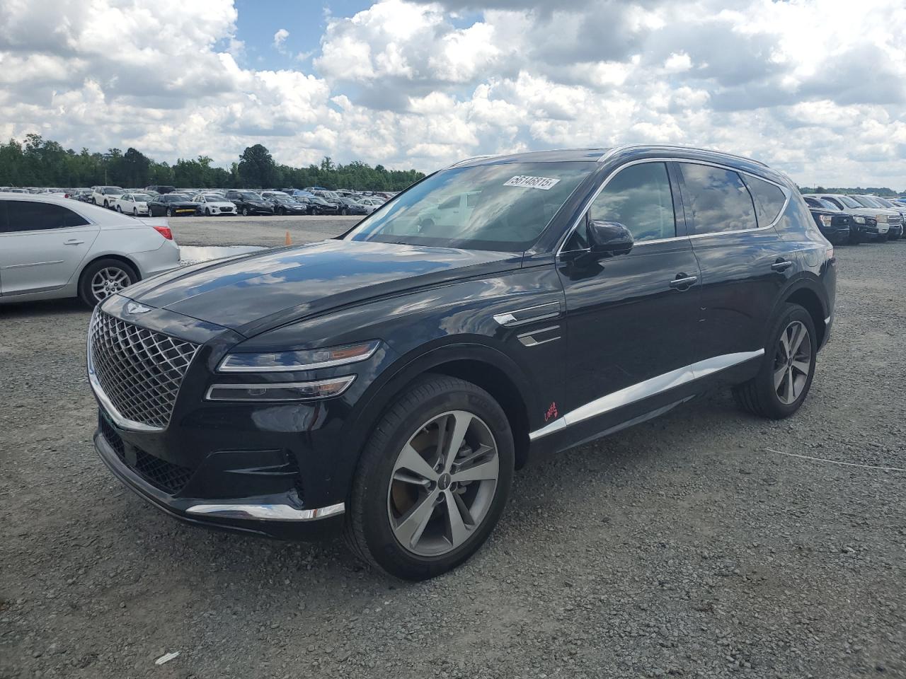The GV80 has damage to the front end. Interior damage is present, including deployed airbags. Wheels appear intact. The exterior shows damage consistent with the front-end impact.