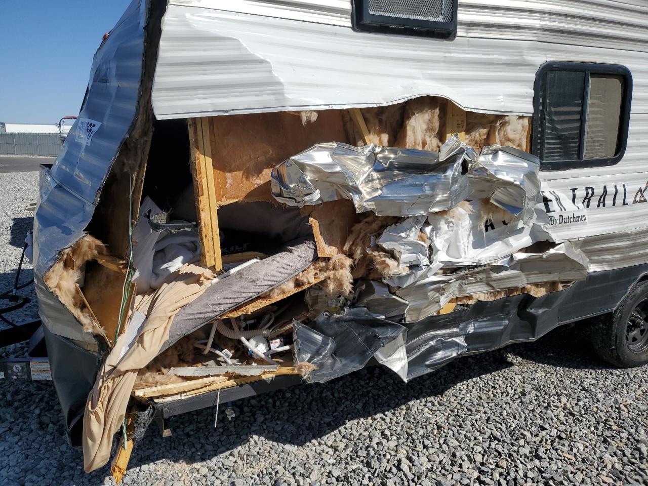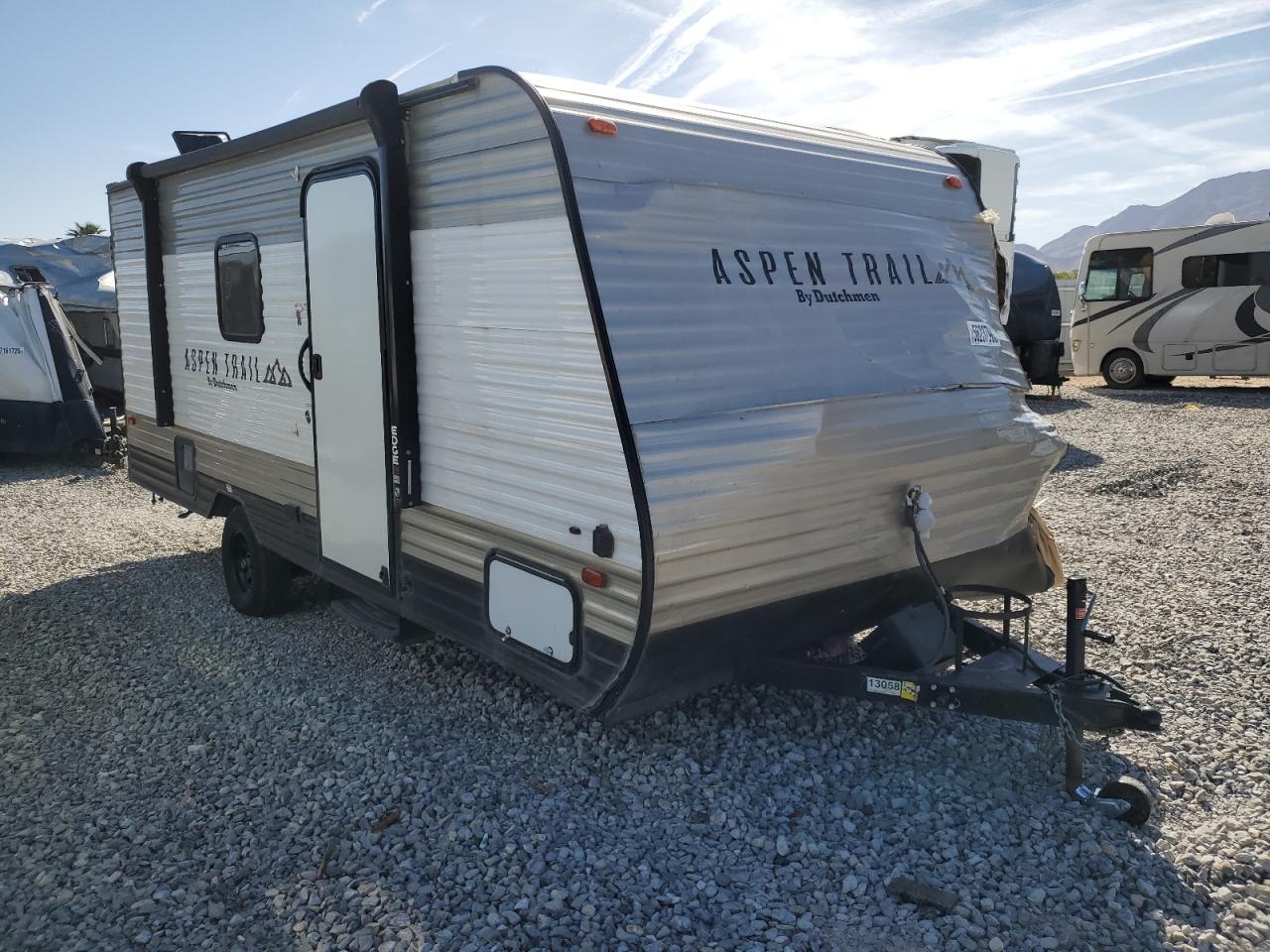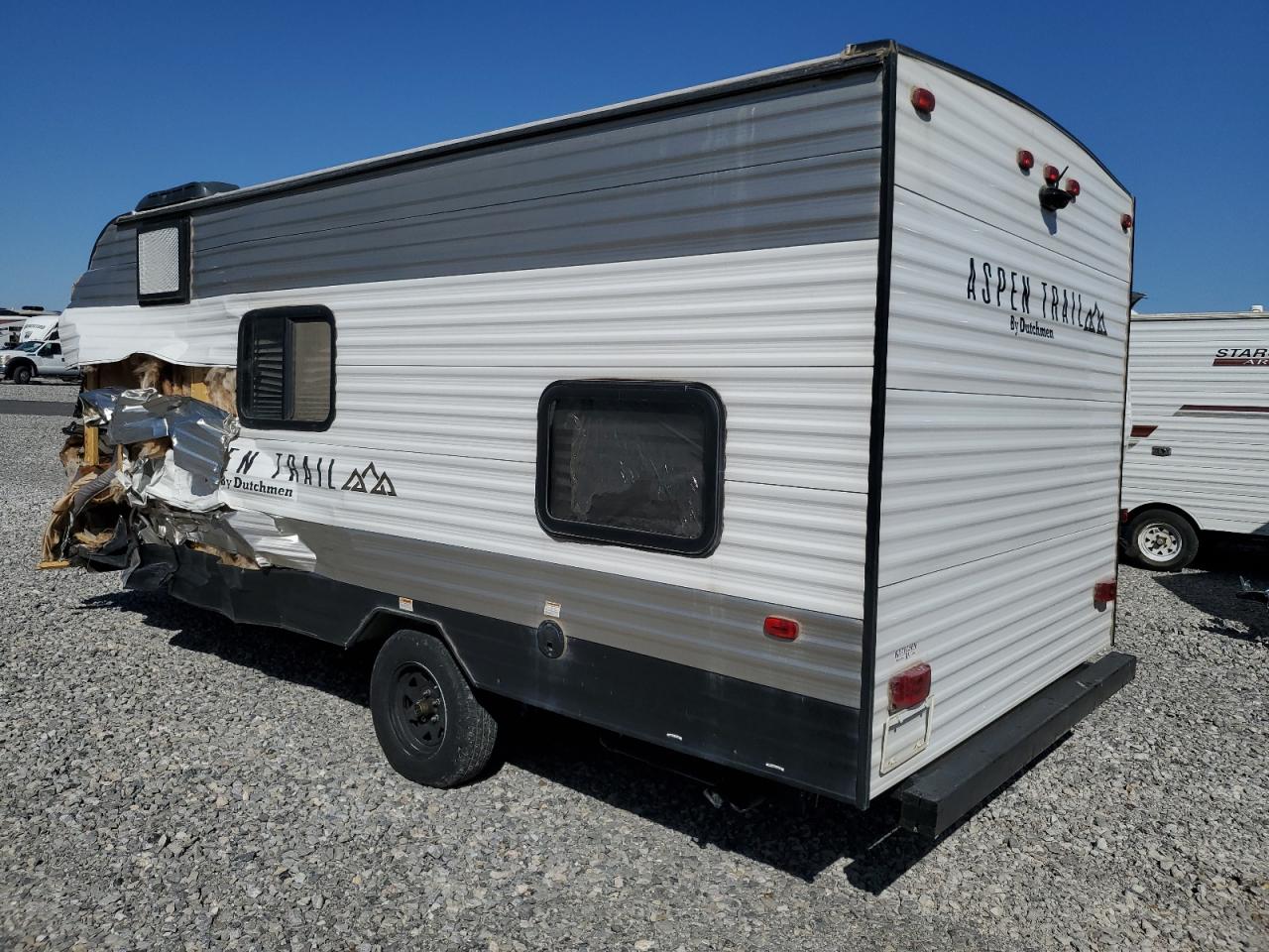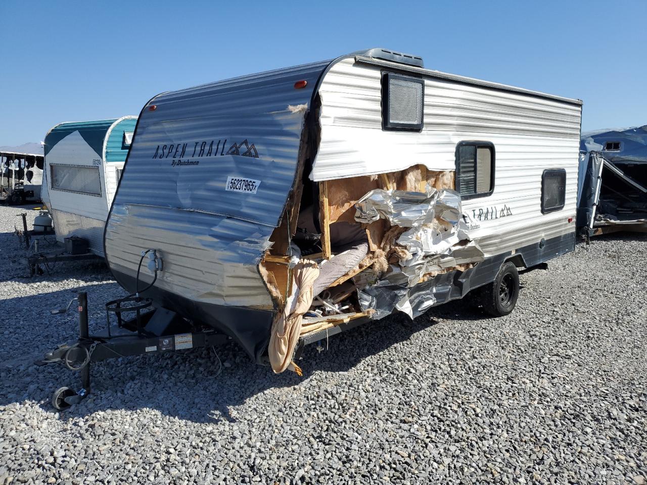 PoorThe two-tone 2021 Aspen Trail by Dutchman RV, shows significant damage primarily to the front end and side. The exterior condition is rated as 'Poor' due to extensive body damage. The interior condition is rated as 'Good'. The overall state of the vehicle is 'Fair', indicating that repairs may be needed, but it may still be drivable. The vehicle's front end is severely compromised, with major structural damage, including a crushed and torn front. The side panel also has major damage. Some of the windows are damaged, and some are in a better condition. The wheels appear to be intact. The interior seems to be in better condition. Damage Summary: The damage is mainly concentrated on the body. The vehicle may be drivable.