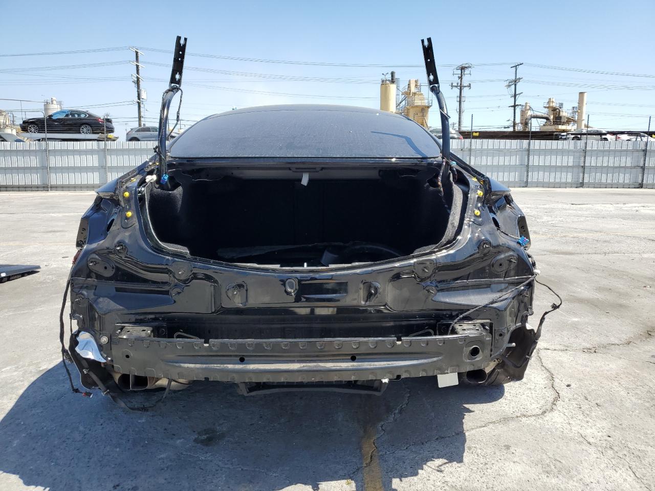 The vehicle sustained extensive damage, with major body panel damage, missing front components, and deployed airbags. The rear of the car also shows damage.