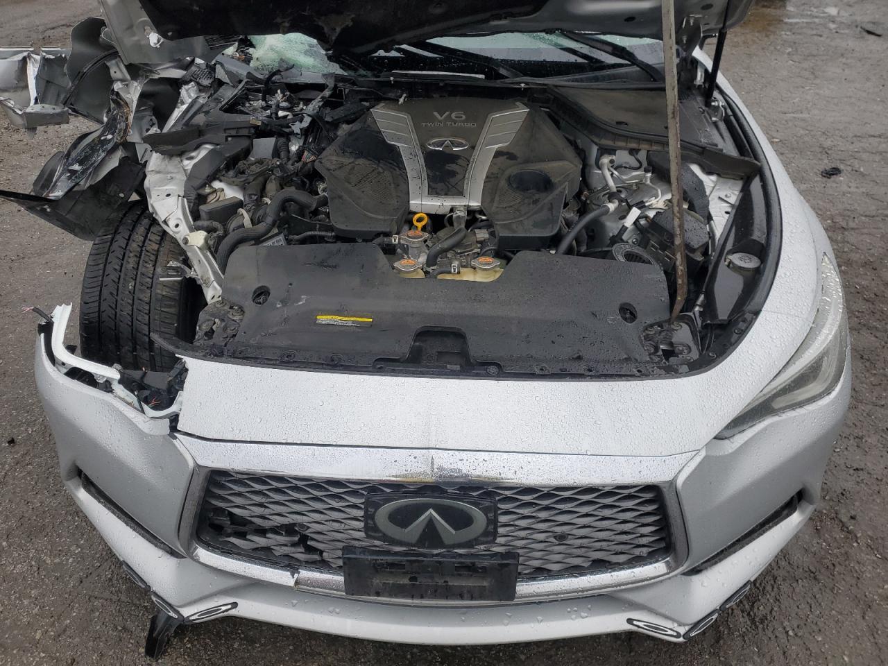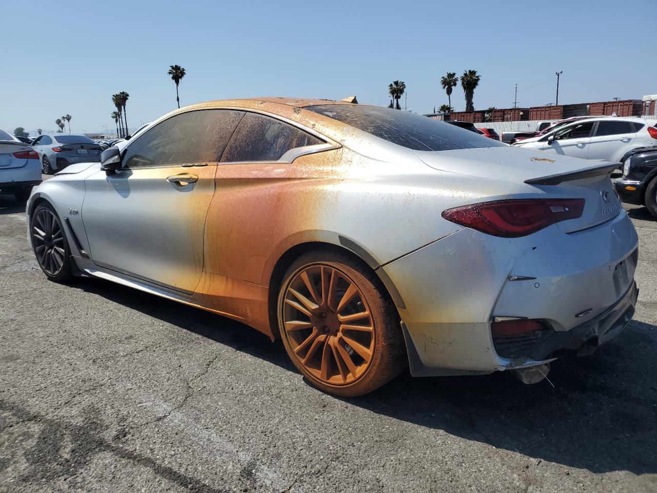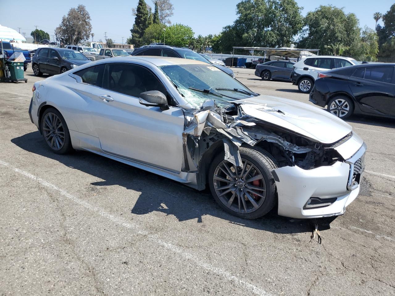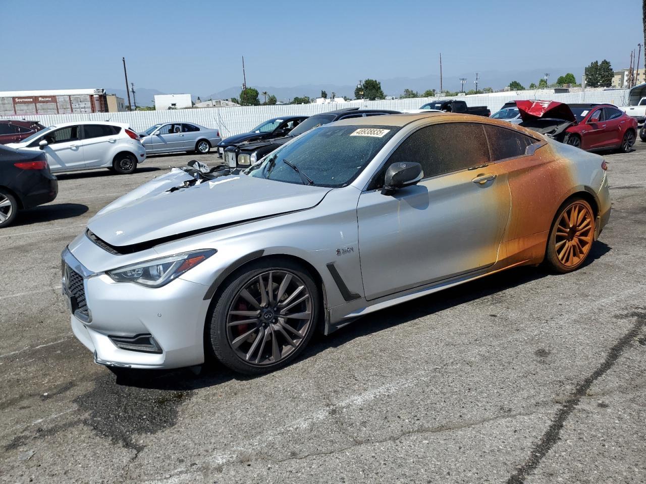 FairThe INFINITI Q60 RED SP 2017, a silver coupe, shows extensive damage. The exterior has significant body damage, with the front end heavily impacted, and the rear also damaged. The paint has been severely affected by an orange spray on the top, with visible scratches and dents across the body panels. The wheels appear to be in good condition, but some lights and glasses are damaged or missing. The interior has deployed airbags and visible damage to the seats and steering wheel. The car is likely not drivable in its current state.