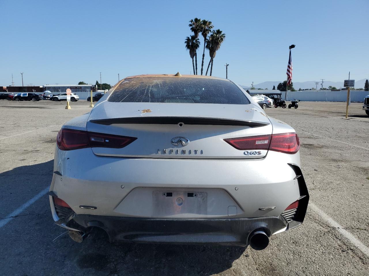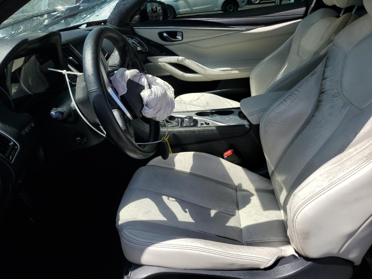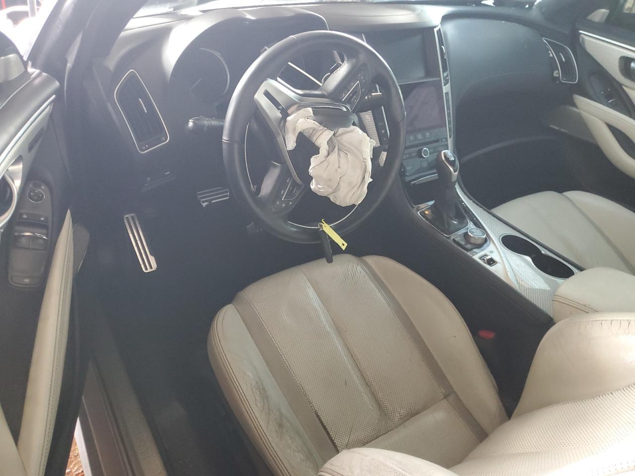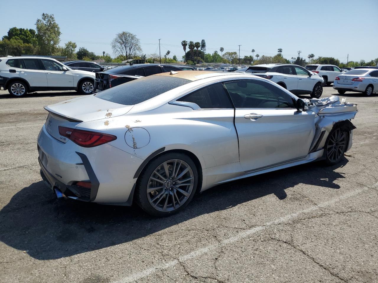 FairThe INFINITI Q60 RED SP 2017, a silver coupe, shows extensive damage. The exterior has significant body damage, with the front end heavily impacted, and the rear also damaged. The paint has been severely affected by an orange spray on the top, with visible scratches and dents across the body panels. The wheels appear to be in good condition, but some lights and glasses are damaged or missing. The interior has deployed airbags and visible damage to the seats and steering wheel. The car is likely not drivable in its current state.