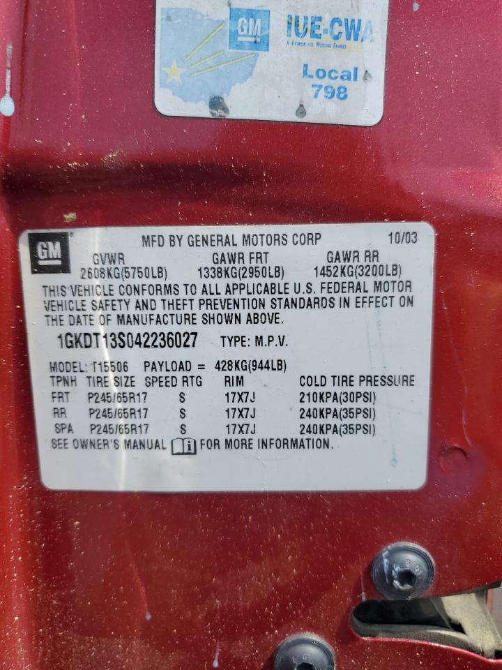 FairThis is a red 2004 GMC Envoy SUV. The vehicle exhibits minor dents and scratches, indicating cosmetic damage. The start code is 'Run & Drive Verified', suggesting the car is drivable. The interior shows moderate wear, while the exterior has visible damage. Summary: The vehicle has a fair overall condition with cosmetic damage. It has some visible dents and scratches on the body. The interior condition is good. The car is drivable.