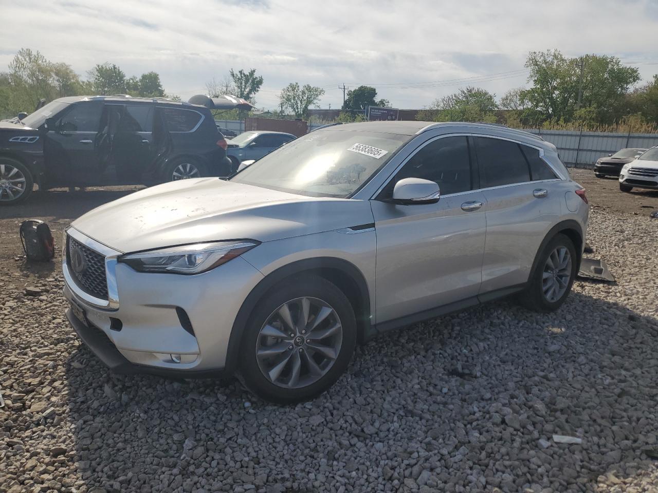 FairThis is a silver 2021 INFINITI QX50 LUXE with side and rear-end damage. The vehicle has significant body damage. The interior shows moderate wear.
