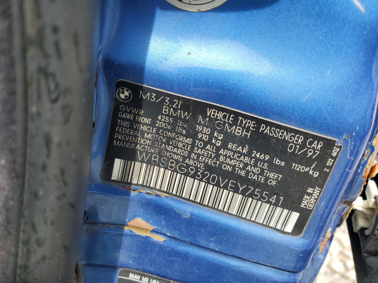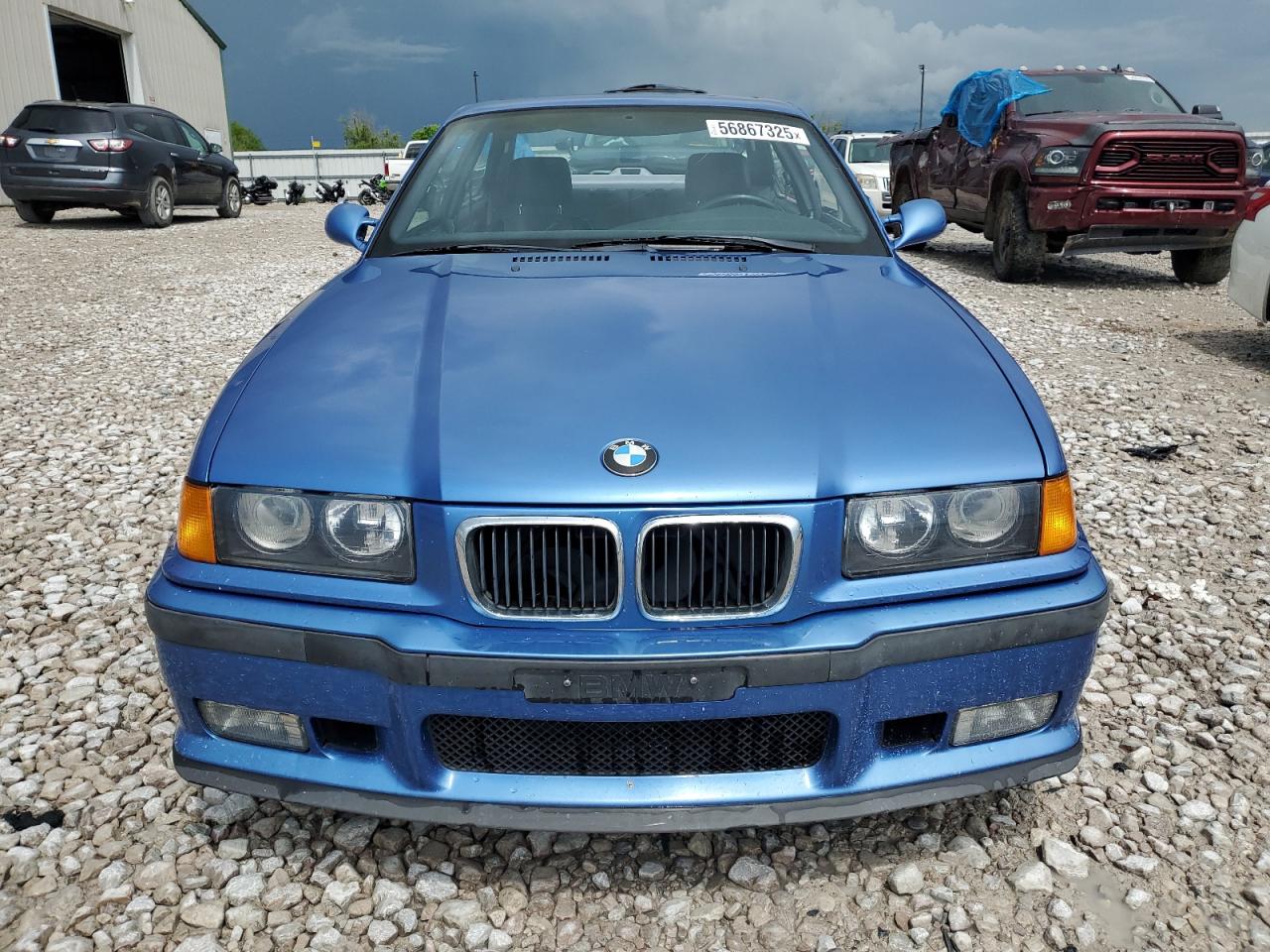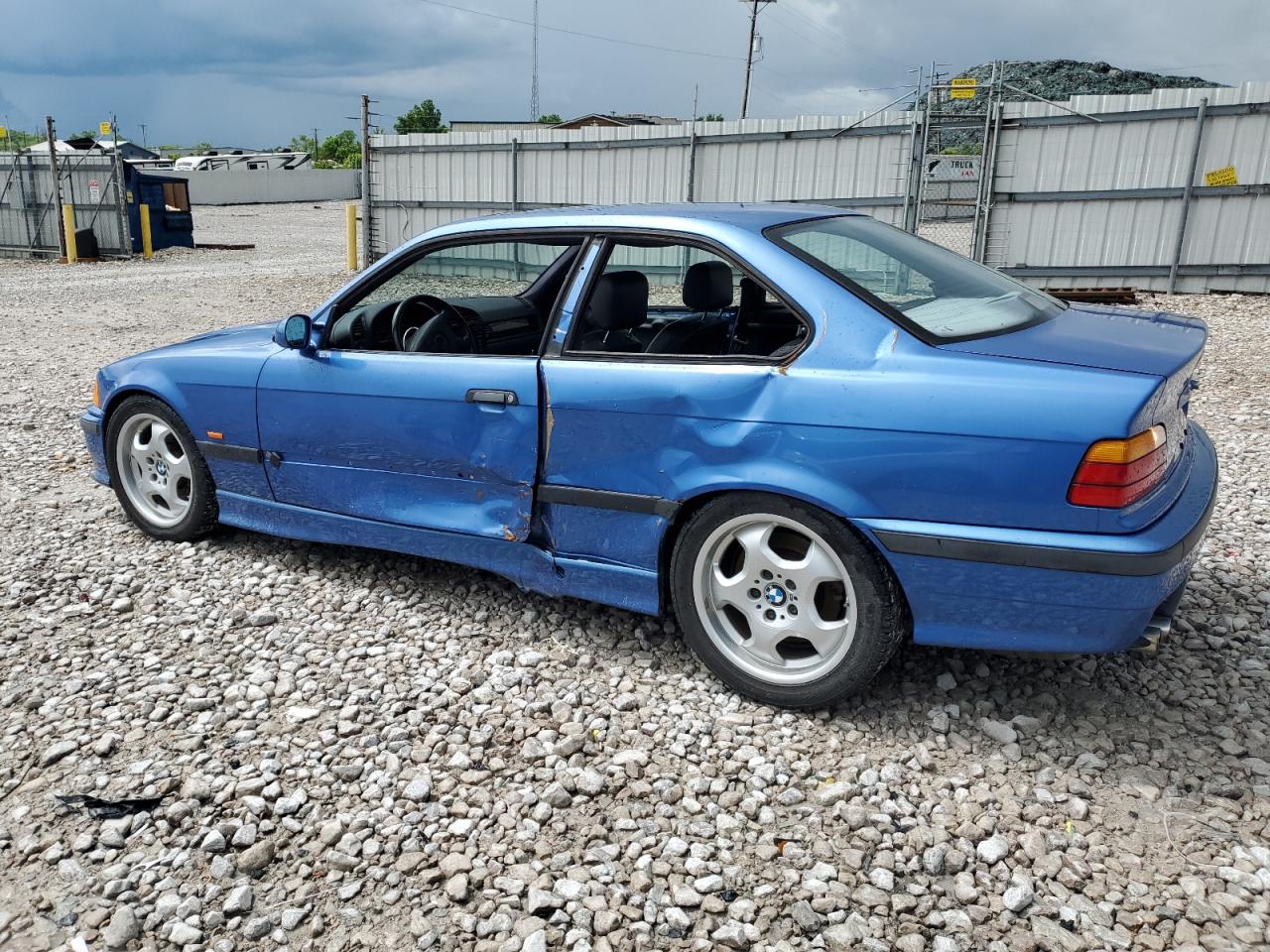 FairThe 1997 BMW M3, in a striking blue, exhibits significant damage to the side of the body. Despite the damage, the car is reported to be 'Run & Drive Verified'. The wheels and lights appear to be intact, but the car shows signs of wear and tear. The interior has damage, and it is not possible to determine the status of the airbags from the provided images.