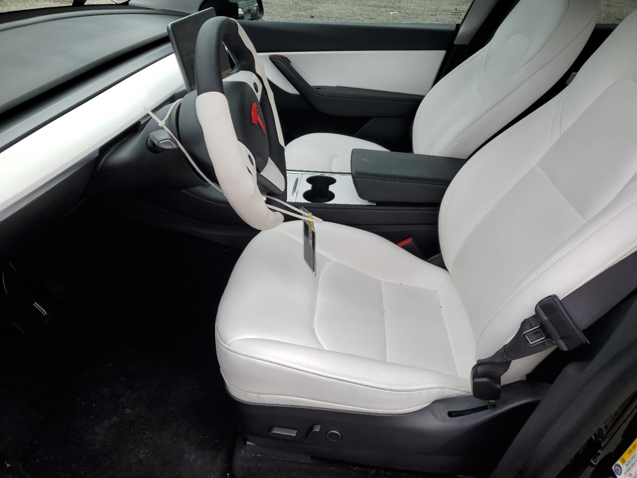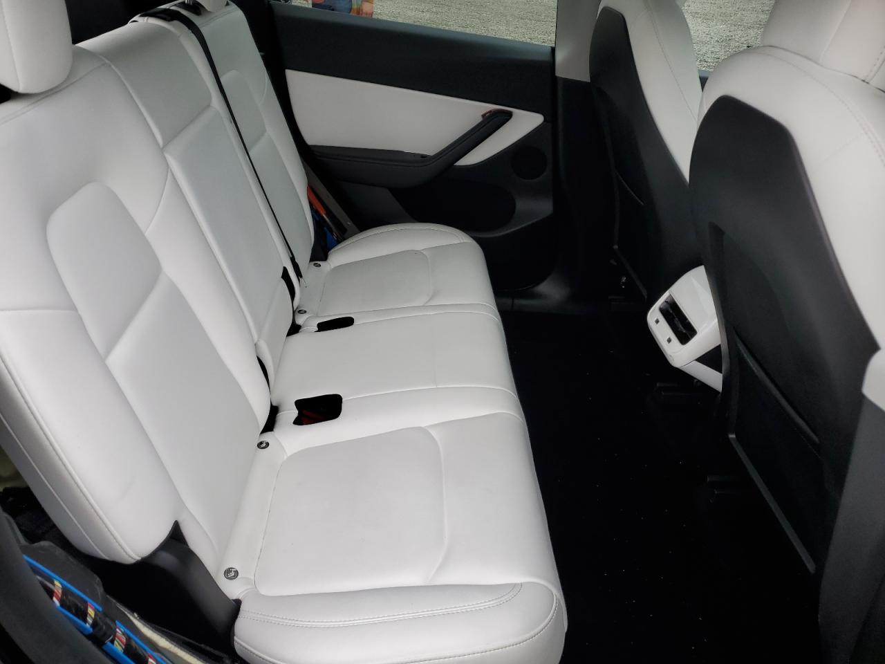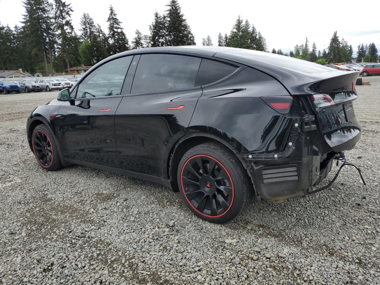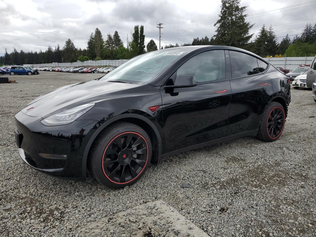 FairThe black 2022 Tesla Model Y presents with significant rear-end damage and some side damage. The wheels have red accents, but the rear of the vehicle has sustained substantial impact damage. The interior appears to have white seats.