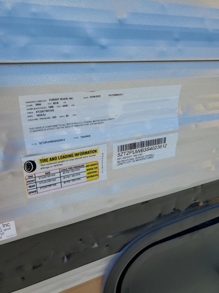 GoodThis is a Forest River Puma Travel Trailer 2025. The primary damage is hail, and the color is white. The vehicle's overall condition appears to be good, with minor to moderate visible damage. Wheels and lights appear to be in good condition. The interior condition is very good, with minimal wear and tear. The vehicle is drivable.