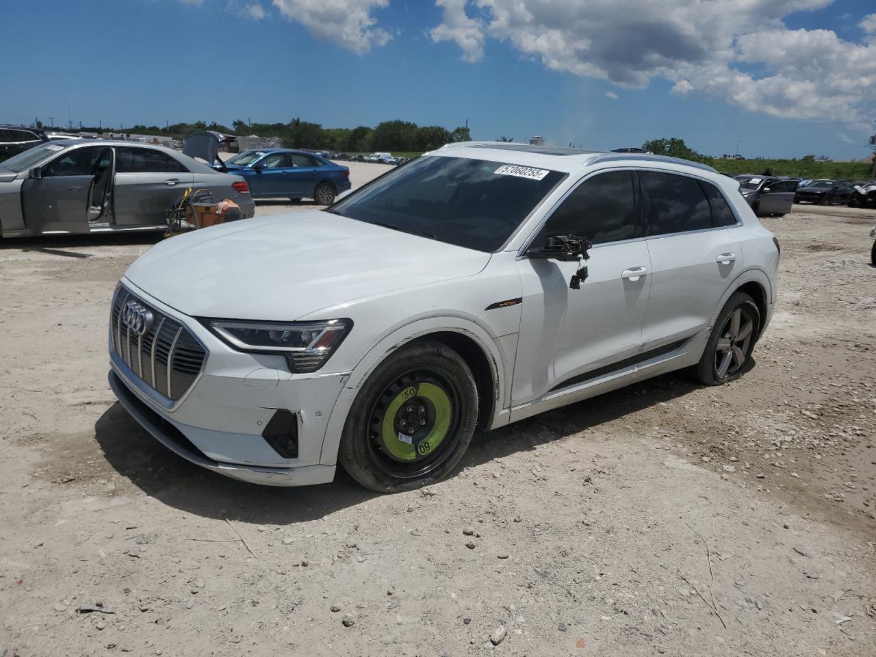 FairThis white AUDI E-TRON PRE 2019, start code DEFAULT, exhibits primary side and secondary rear end damage. The exterior shows moderate damage, while the interior appears in good condition. The vehicle's wheels have visible damage, and the lights and glasses seem intact. The E-Tron is a luxury electric SUV. The car has a visible airbag in the cabin. The damages include side and rear-end impacts, affecting body panels and potentially requiring repairs for drivability and cosmetic issues. The car has airbags in the cabin.