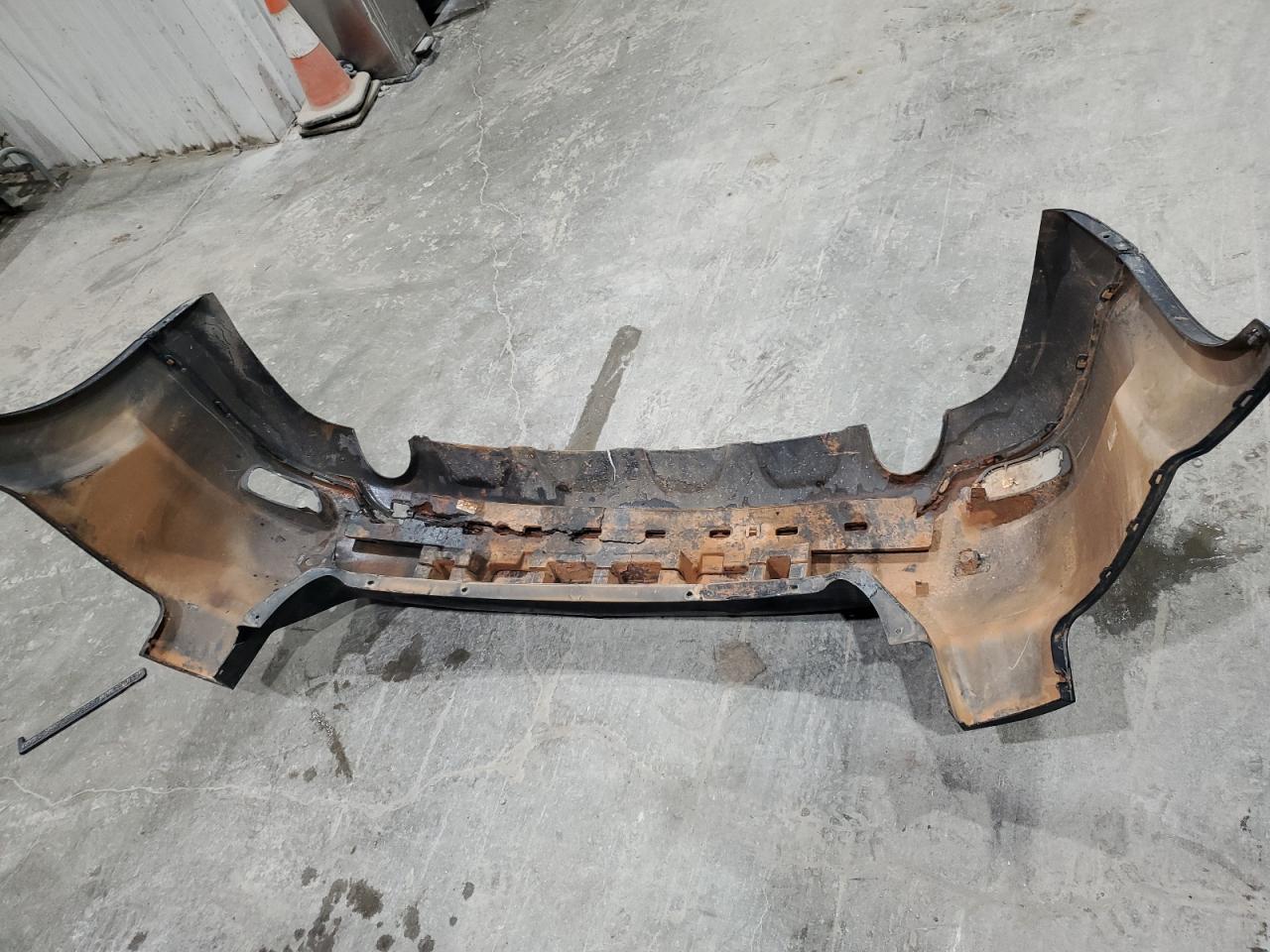 The primary damage is rear-end collision, and secondary damage from hail. The rear of the vehicle shows extensive damage to the body, including bent and crumpled panels. The interior appears to have minimal wear and tear.