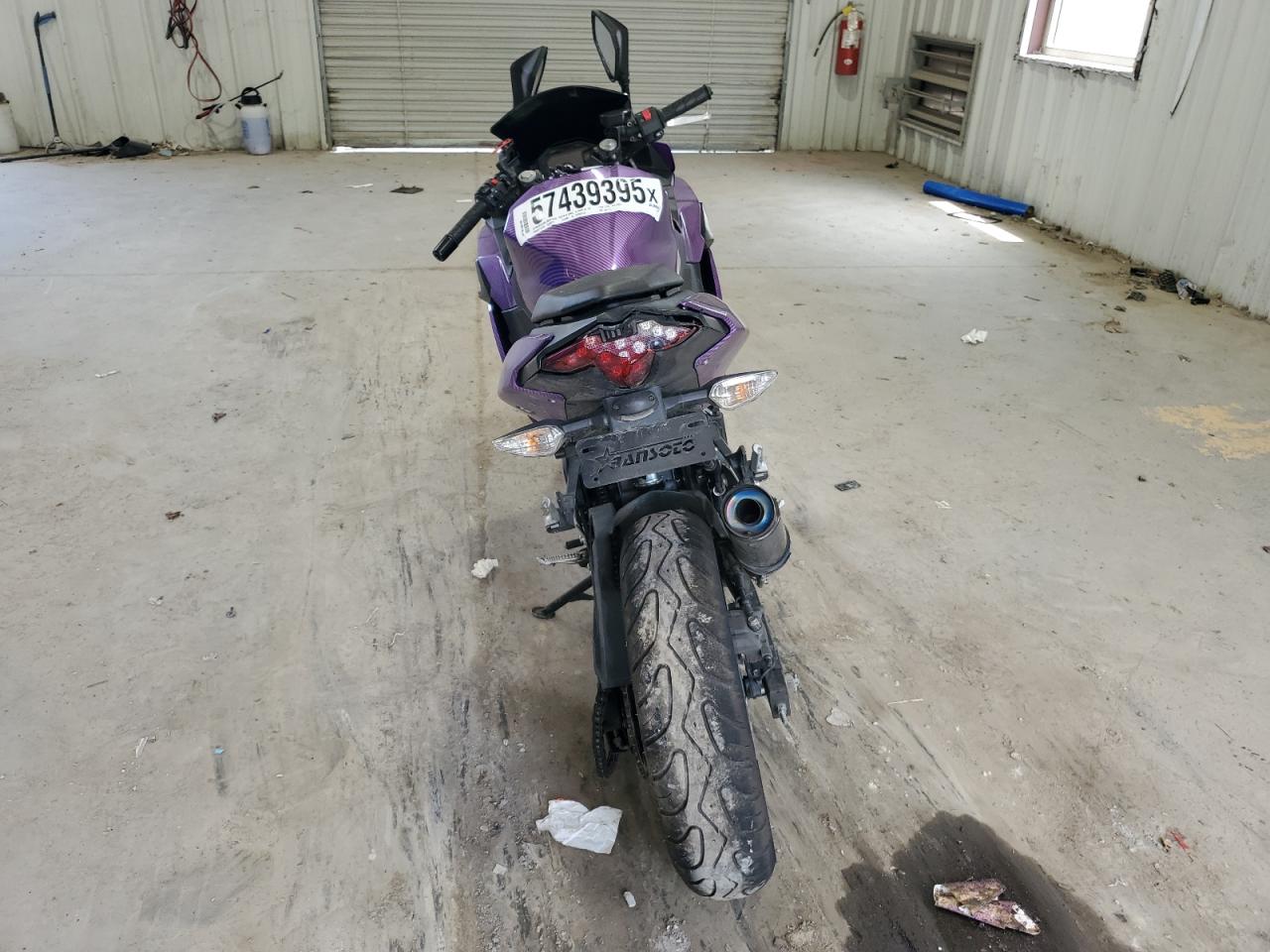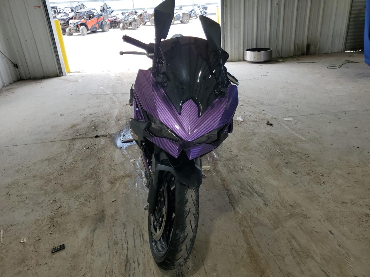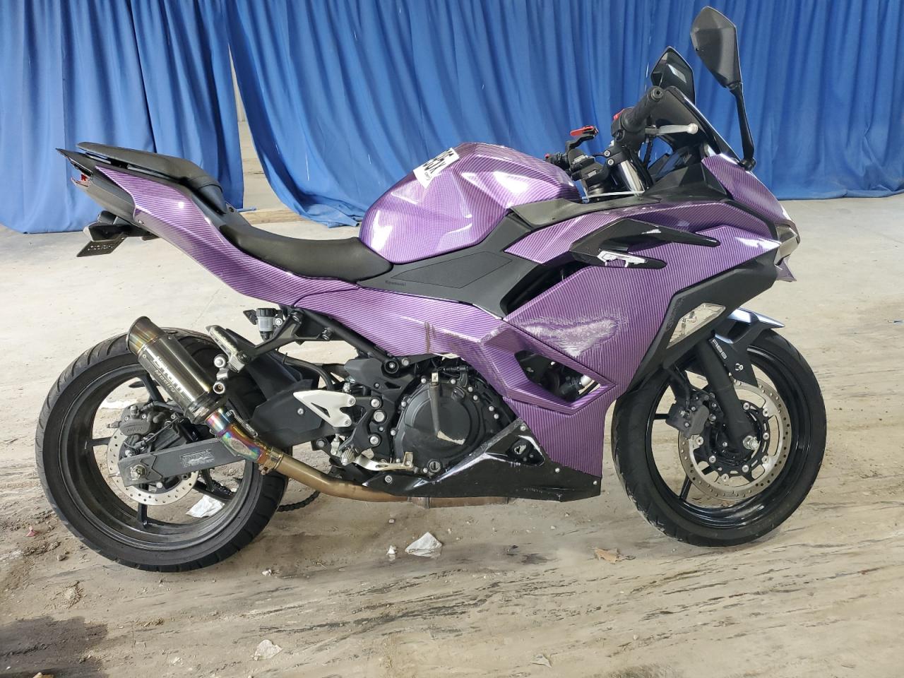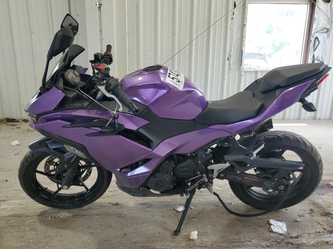 FairThis is a 2024 KAWASAKI EX500 motorcycle with purple body, start code is Vehicle Starts. Primary damage: SIDE, secondary damage: no damage. The motorcycle shows signs of cosmetic and body damage.