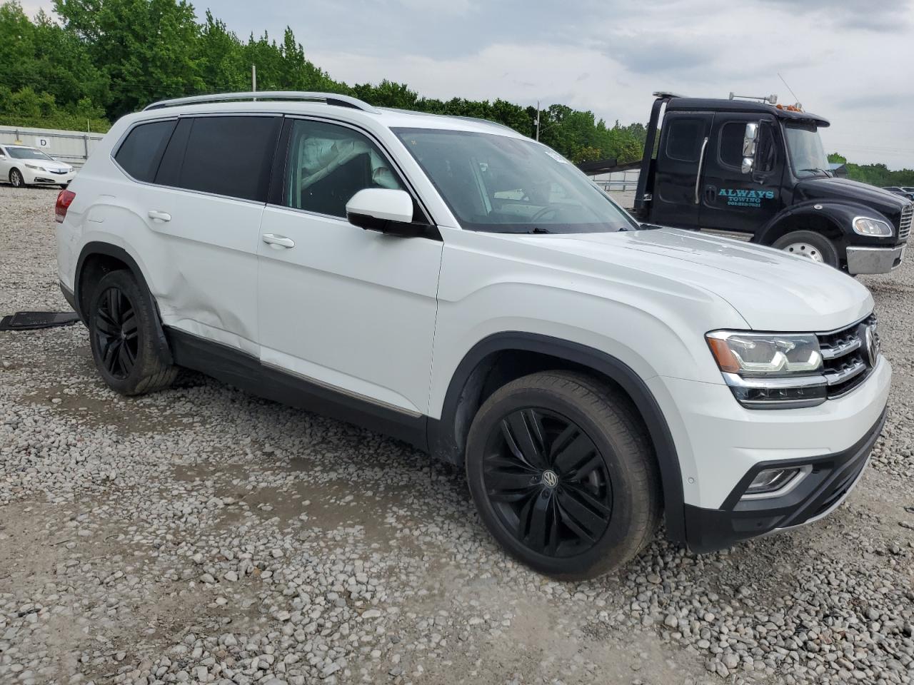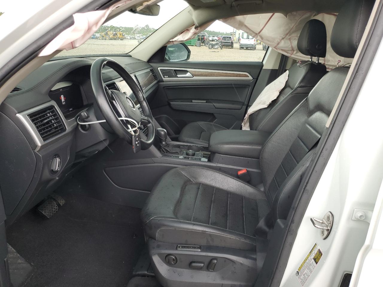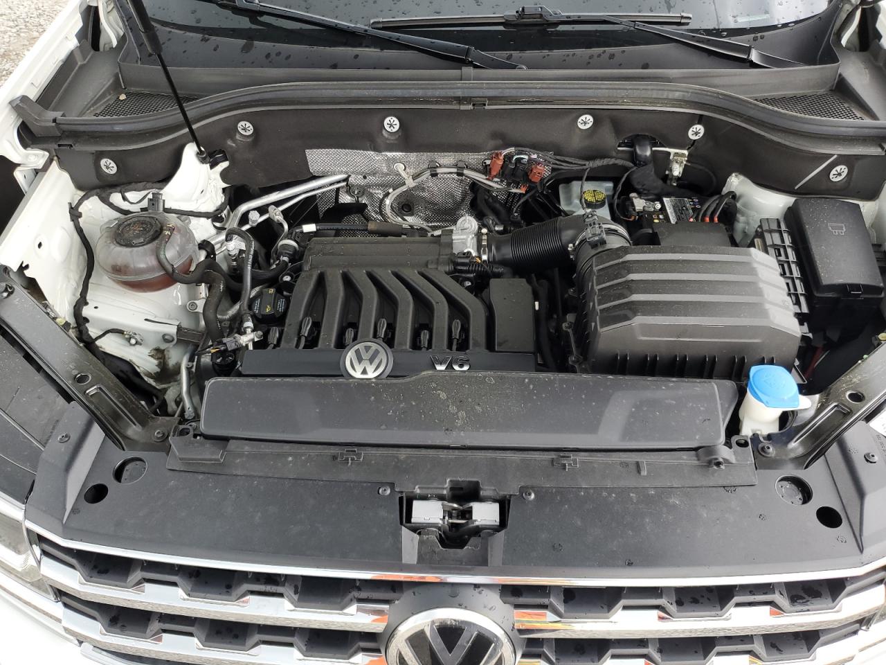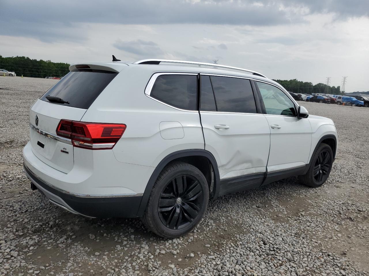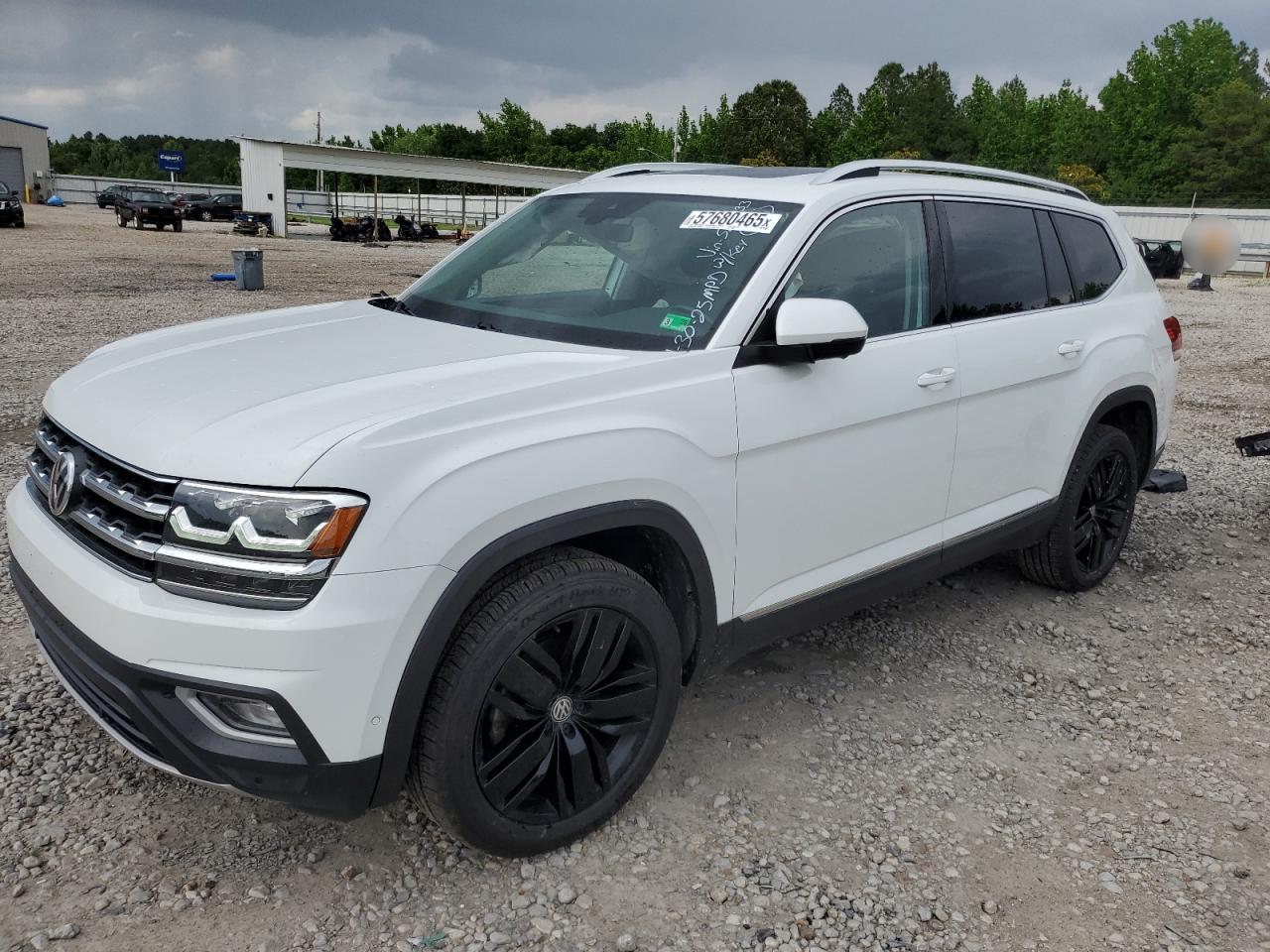 Fair2019 VOLKSWAGEN ATLAS SEL. The car is white and has a Run & Drive Verified status. The primary damage is SIDE, with secondary damage including MINOR DENT/SCRATCHES. The vehicle's body panels have sustained damage. Interior condition is rated as Good. The airbags have been deployed, indicating potential internal damage. The vehicle is drivable.