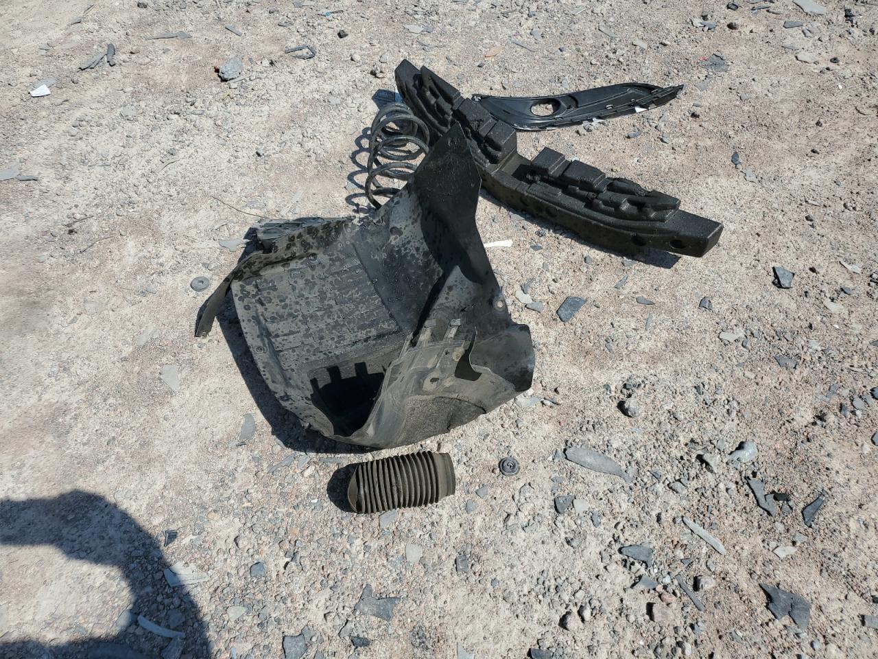 The vehicle has significant front-end damage, with body panels heavily affected. Undercarriage damage is also noted. The interior shows signs of impact, including deployed airbags and damage to various elements. The car requires extensive repairs.