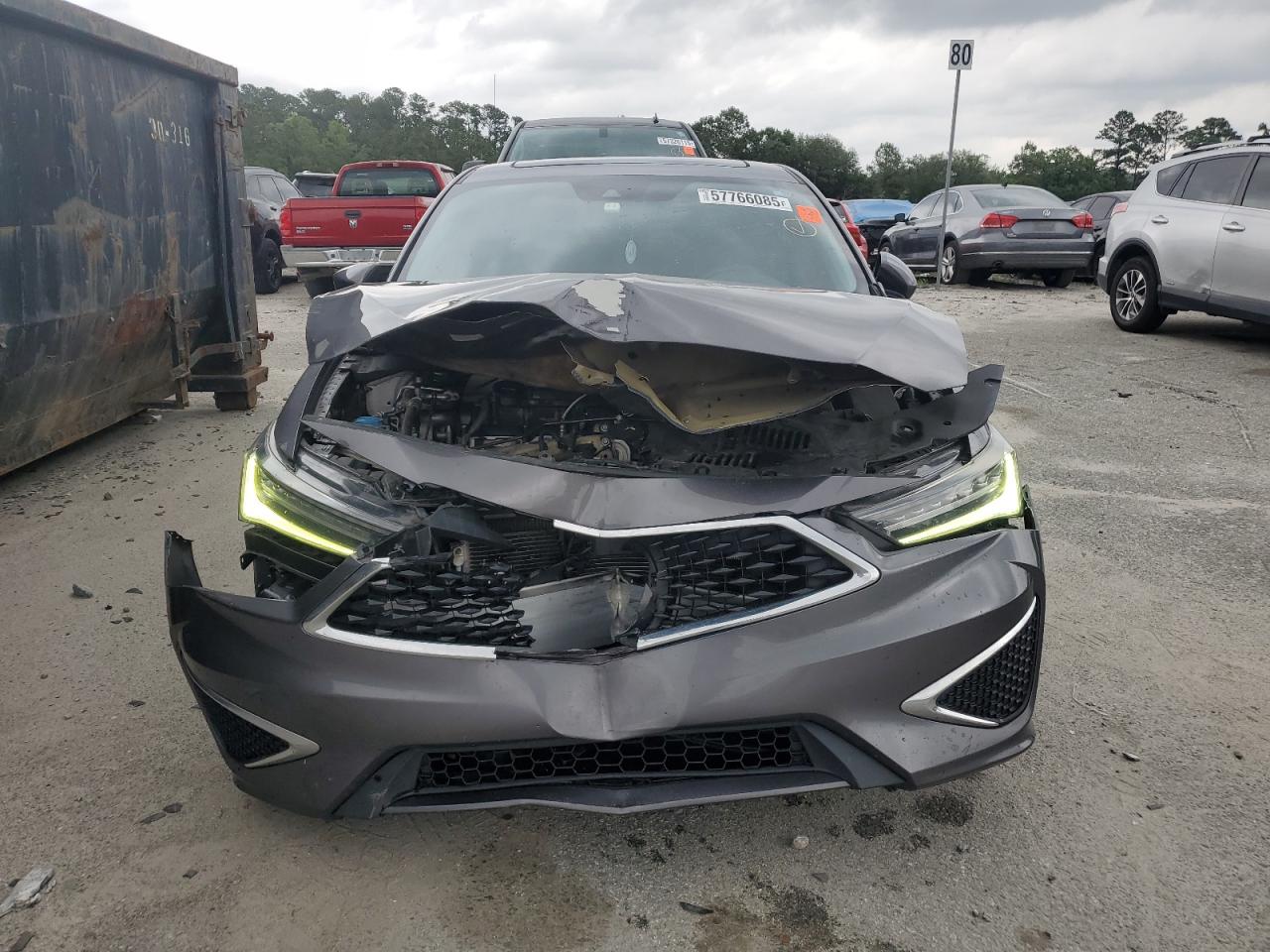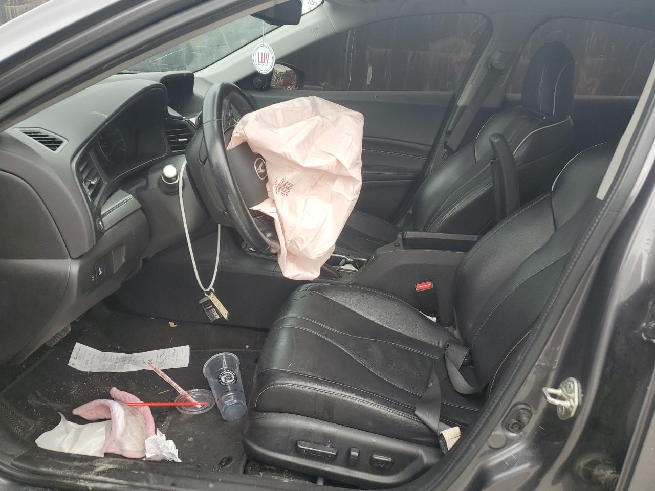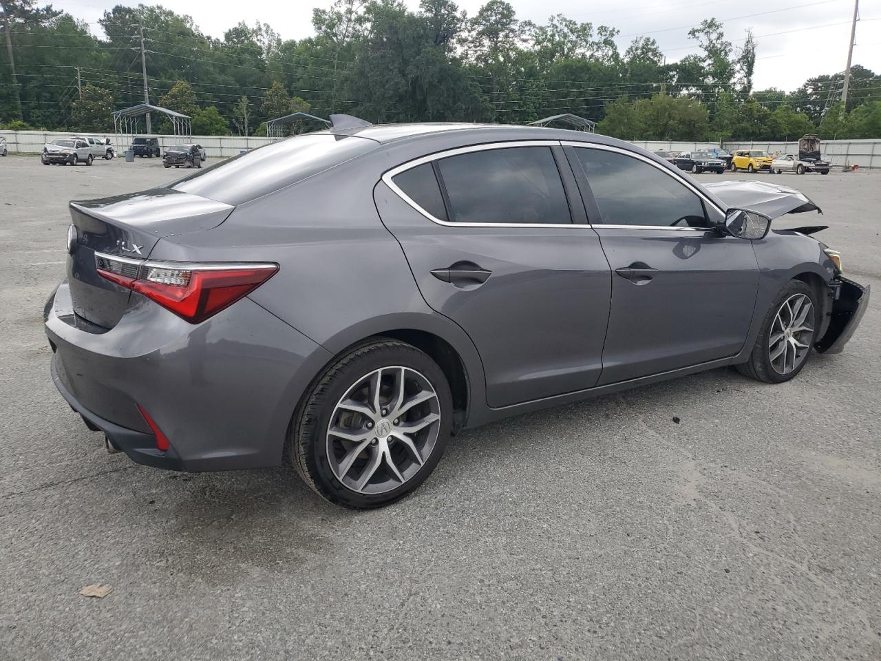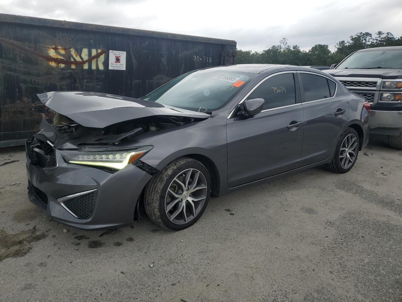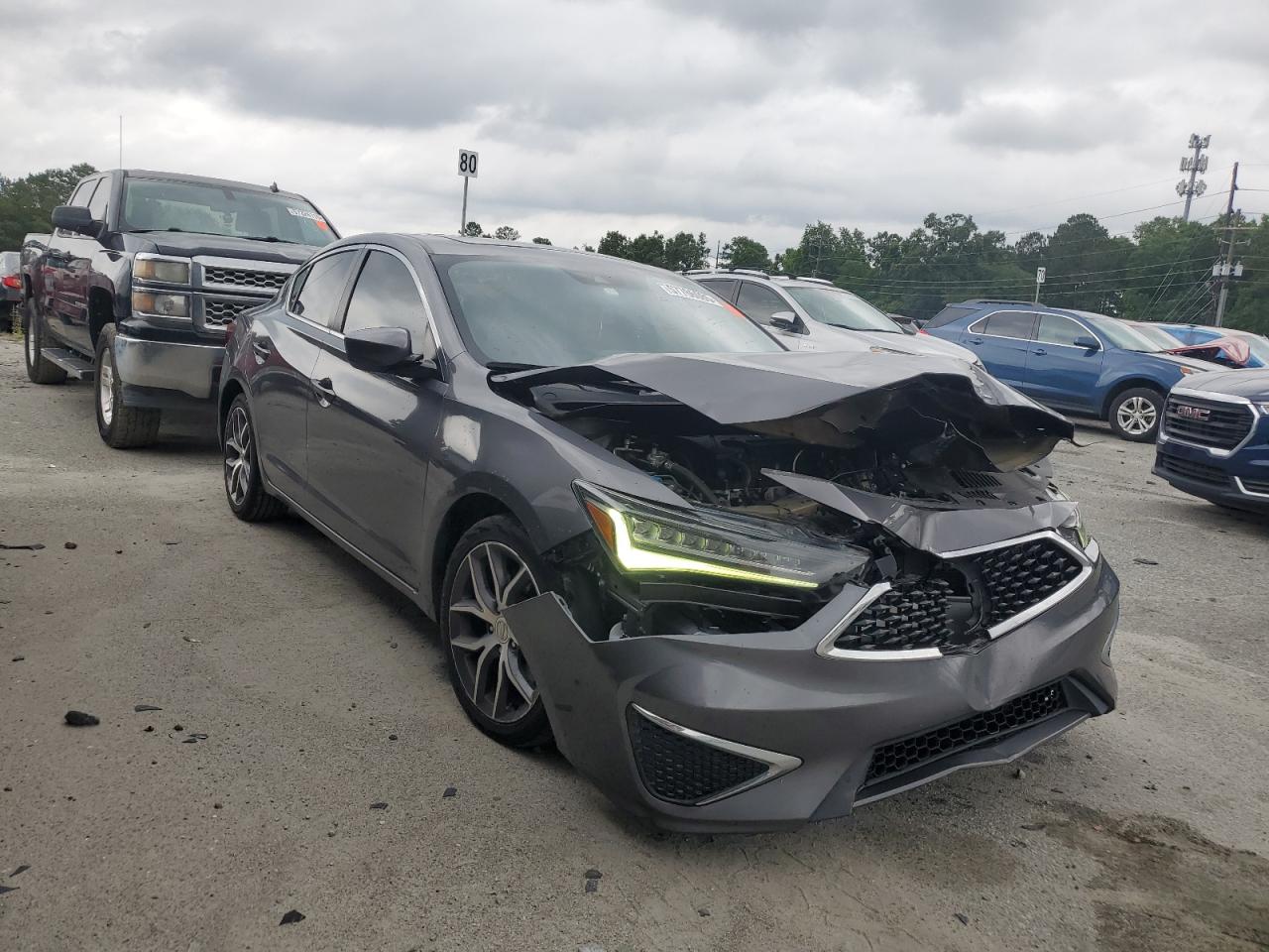 FairThe 2019 Acura ILX Premium is a gray sedan with significant front-end damage, indicating a collision. The primary damage is to the front end, with no reported secondary damage. The car has deployed airbags. It is described as 'Run & Drive Verified'.