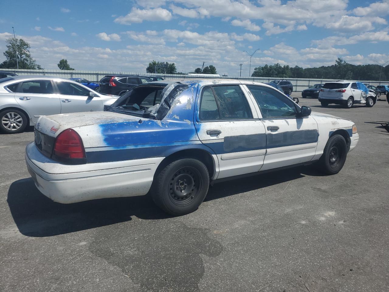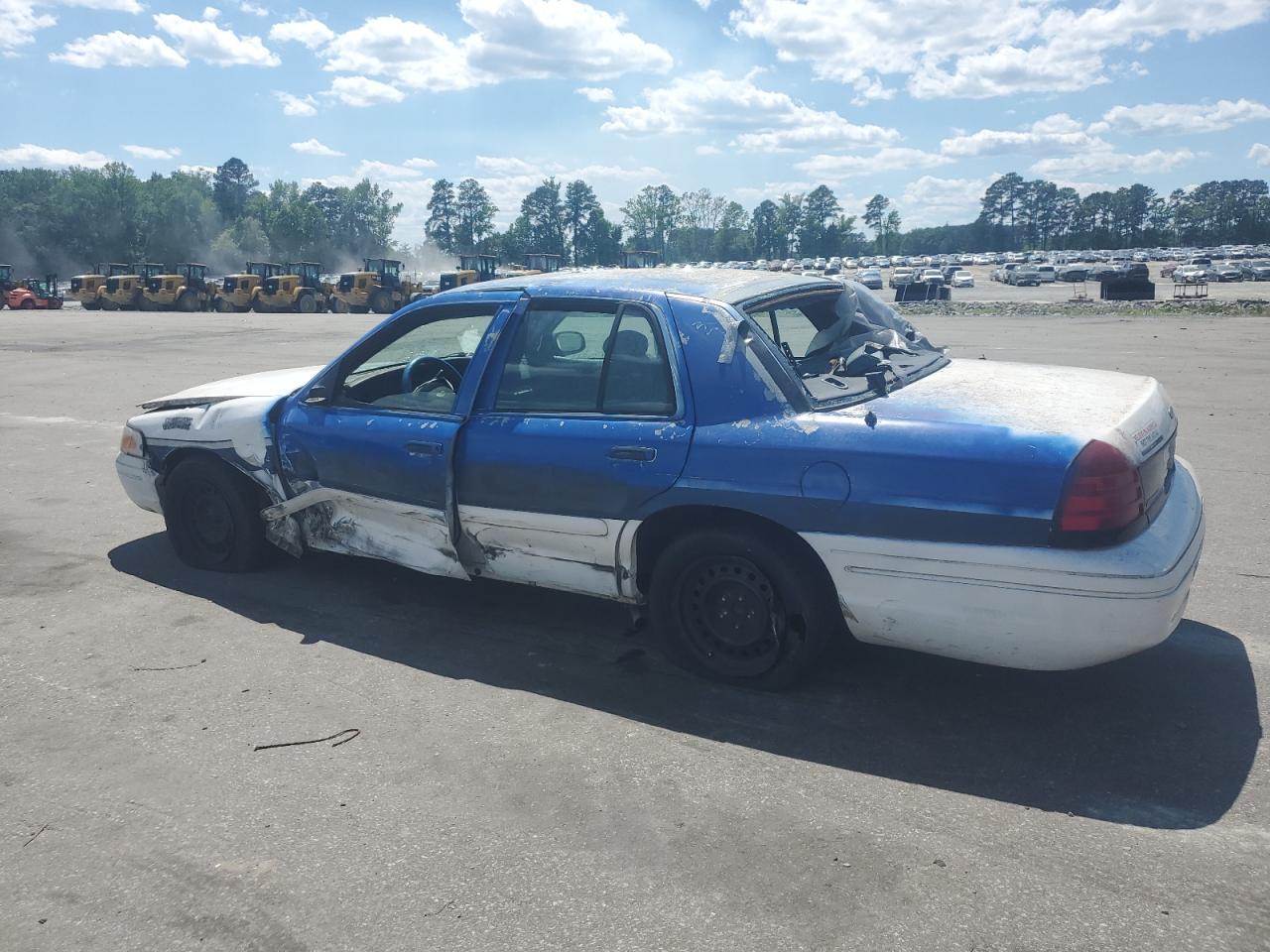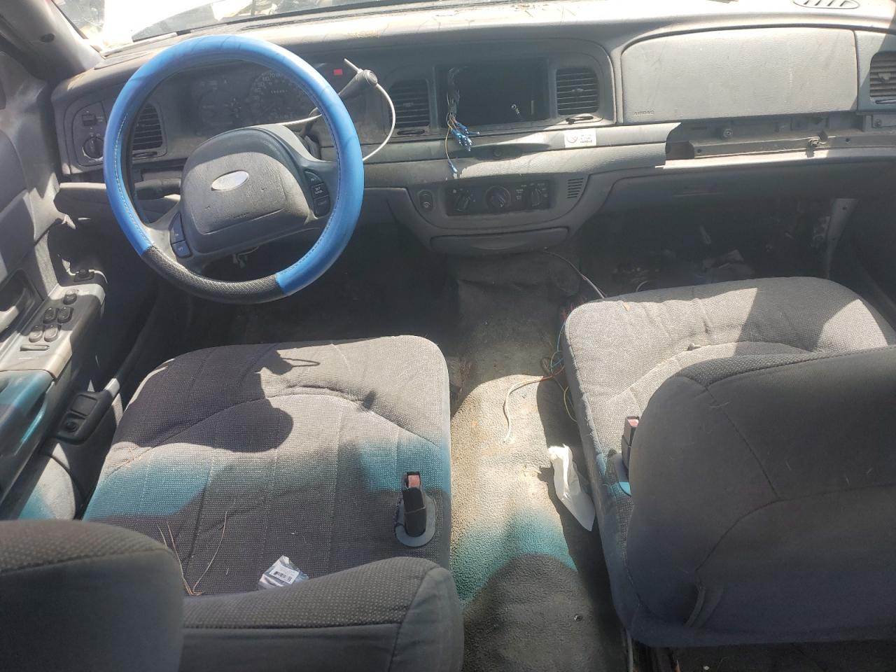 FairThis 2002 Ford Crown Victoria shows significant damage, primarily to the body panels. The vehicle is blue and has sustained impact damage to multiple areas, including the front, sides, and roof. The wheels appear to be intact. Interior damage includes visible wear and tear, potentially with damaged upholstery. Overall, the car is drivable, but requires considerable repair.