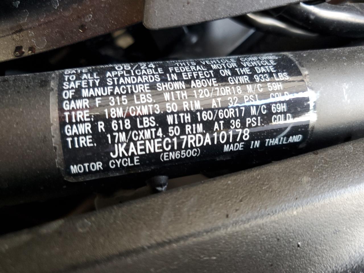 GoodThe black KAWASAKI EN650 C 2024 motorcycle shows evidence of front-end damage, categorized as "Body" damage. Despite this, the motorcycle is reported as "Run & Drive Verified." The exterior condition is assessed as "Good," suggesting minor to moderate visible damage requiring some replacements. The interior is in "Excellent" condition. Overall, the motorcycle is in "Good" condition, implying it is drivable with repair needs.