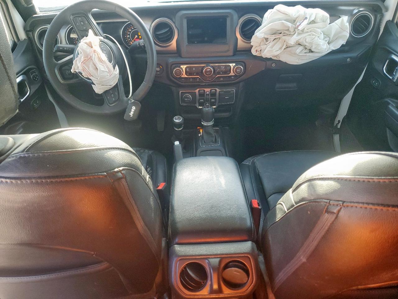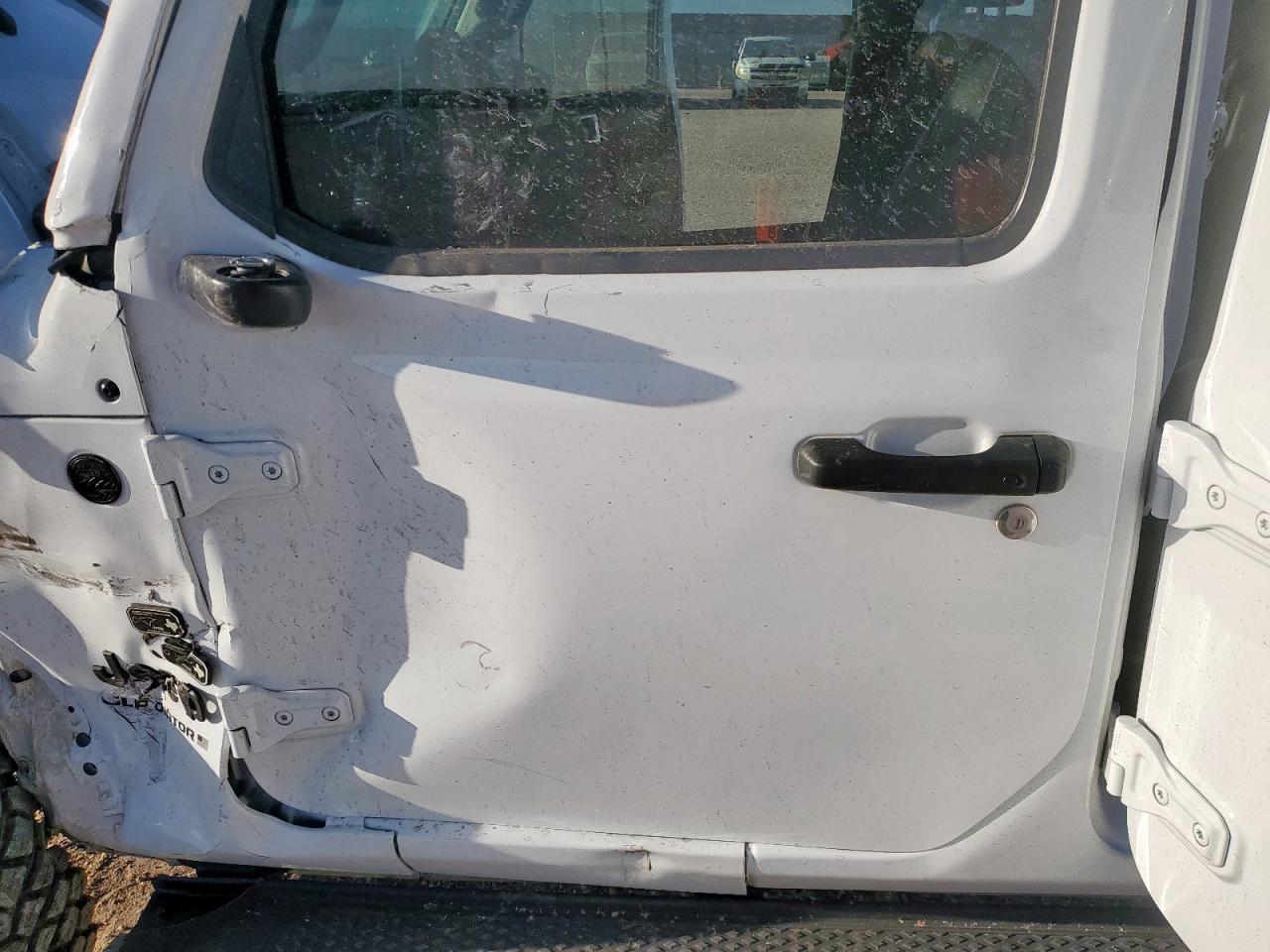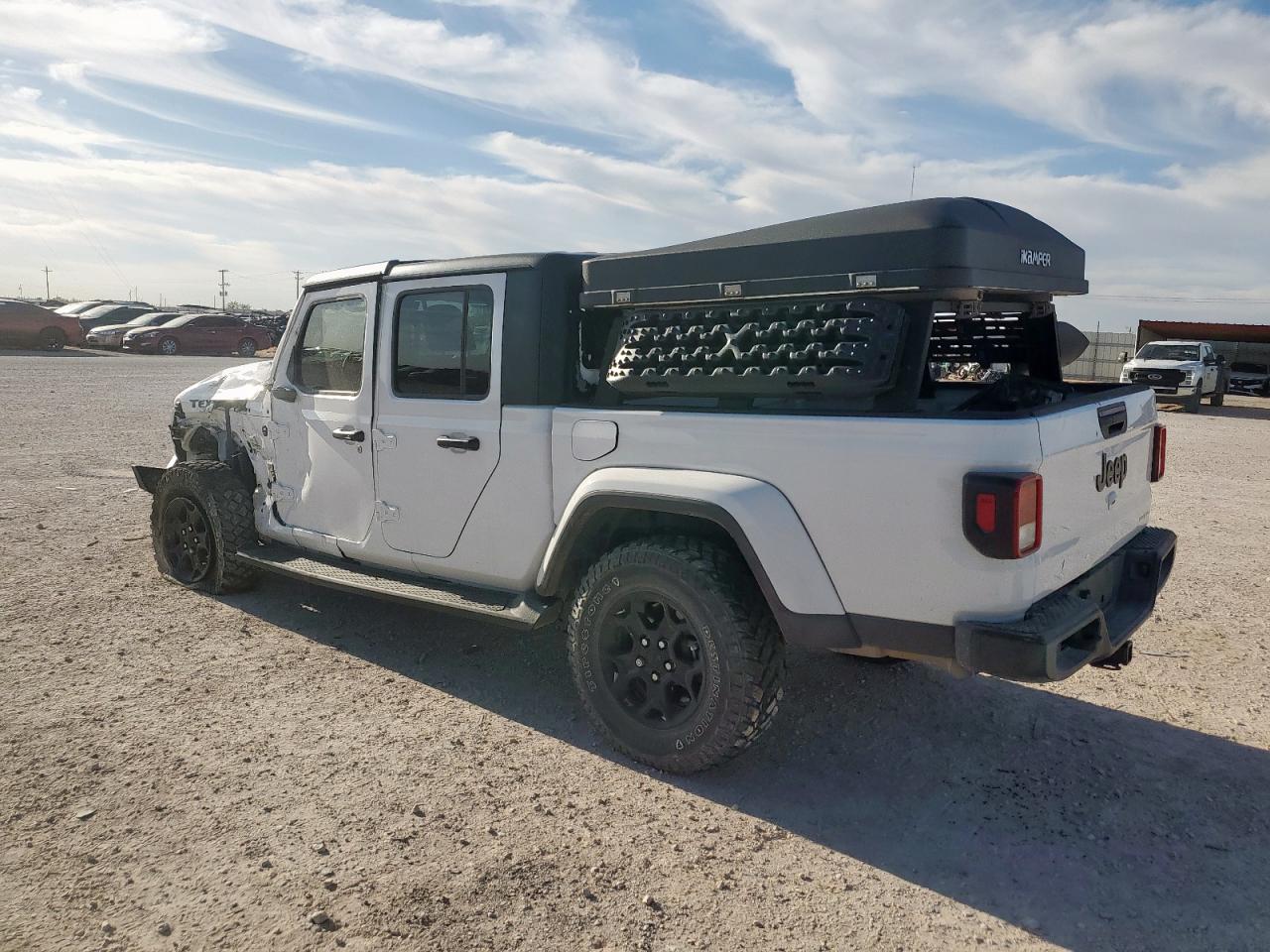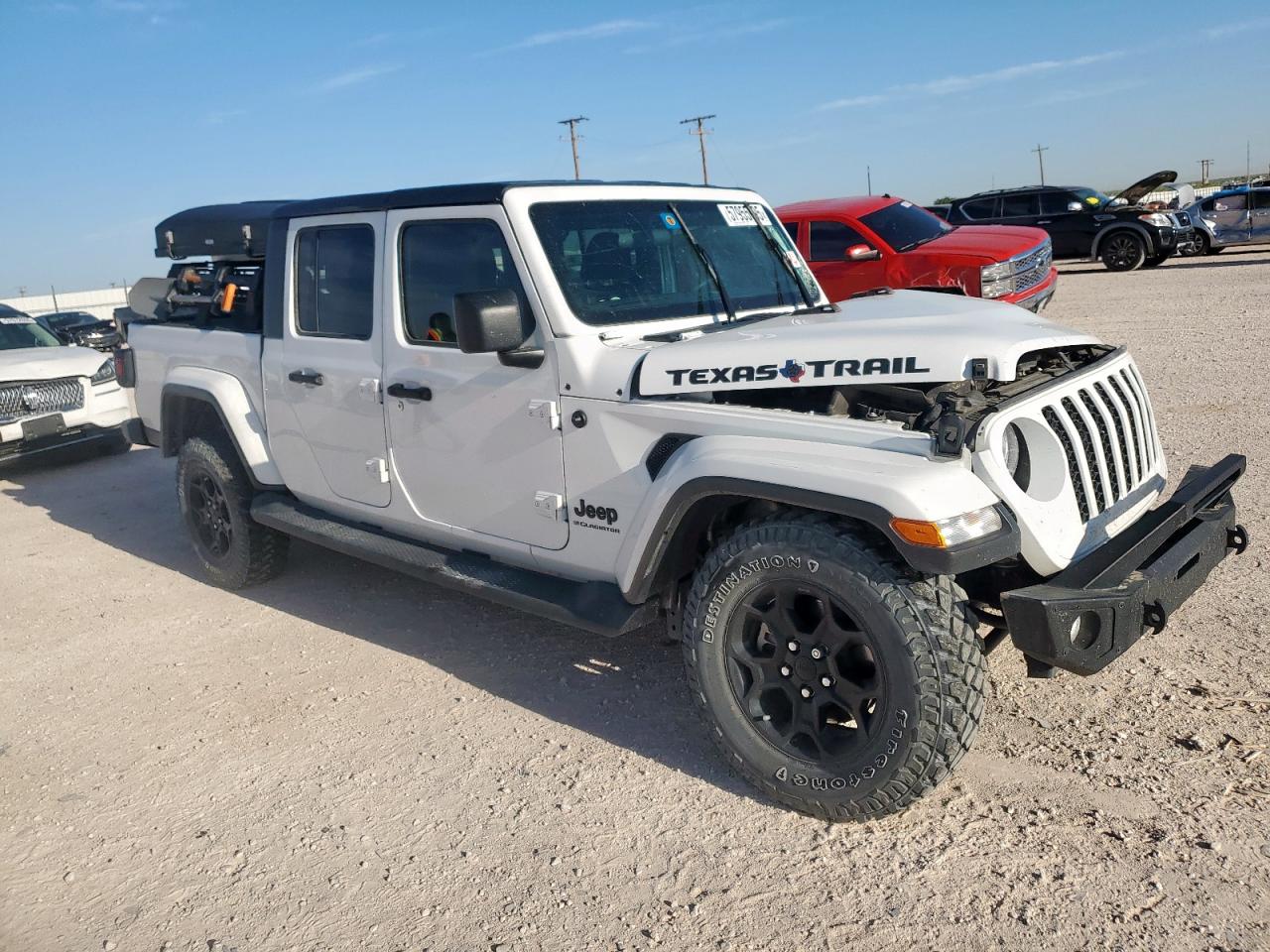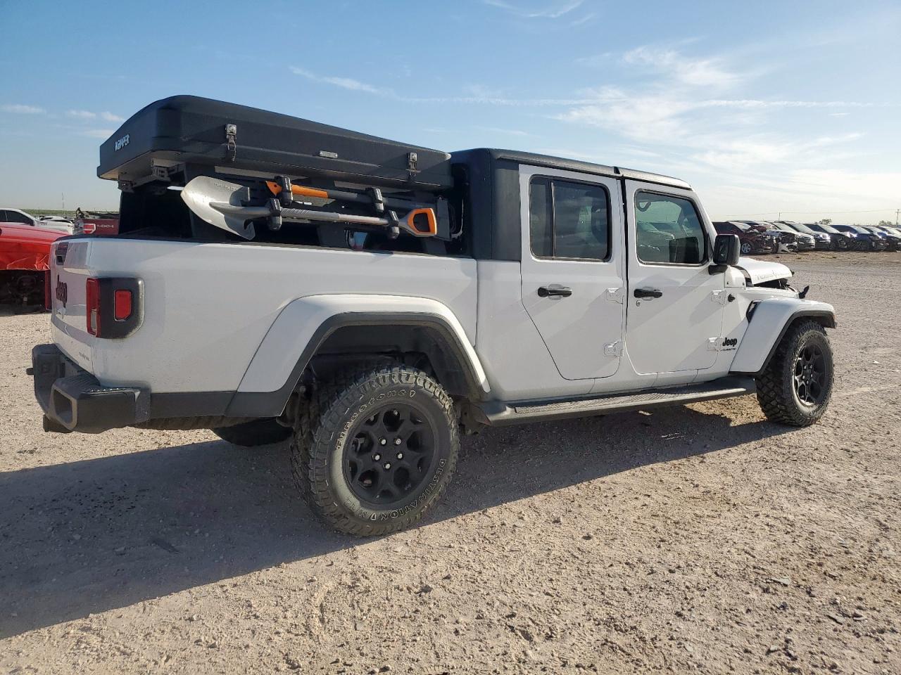 FairThis white 2023 Jeep Gladiator has sustained significant damage. The front end shows substantial impact, affecting the hood, fender, bumper, and likely structural components. The side of the vehicle also exhibits considerable damage. The interior has deployed airbags, indicating a significant collision. The vehicle is equipped with aftermarket features, including a roof-mounted tent. The Jeep shows signs of wear and tear overall.