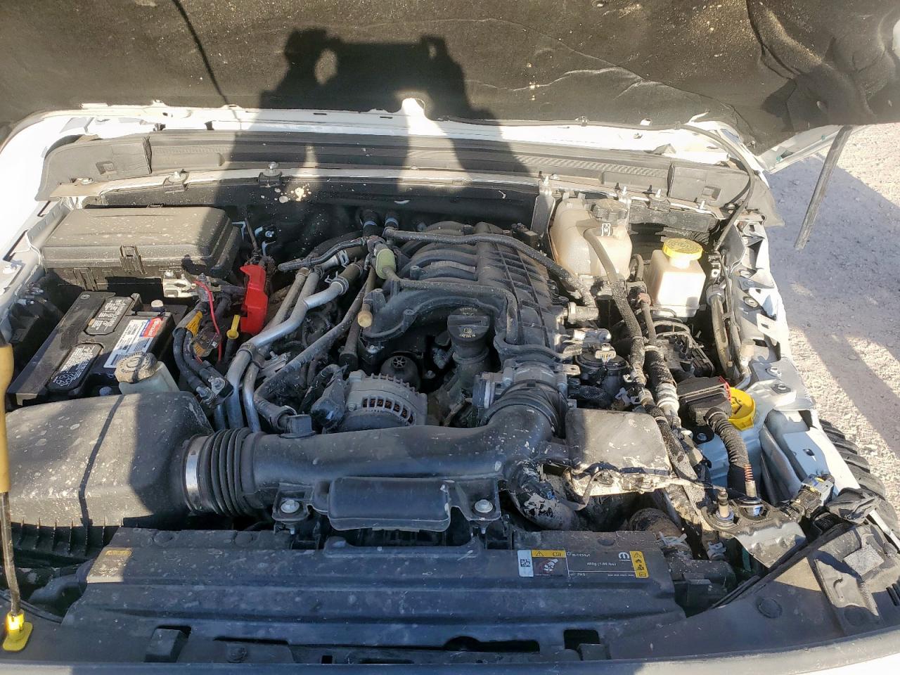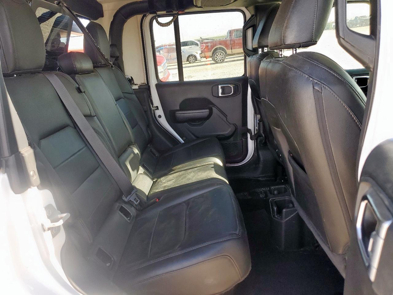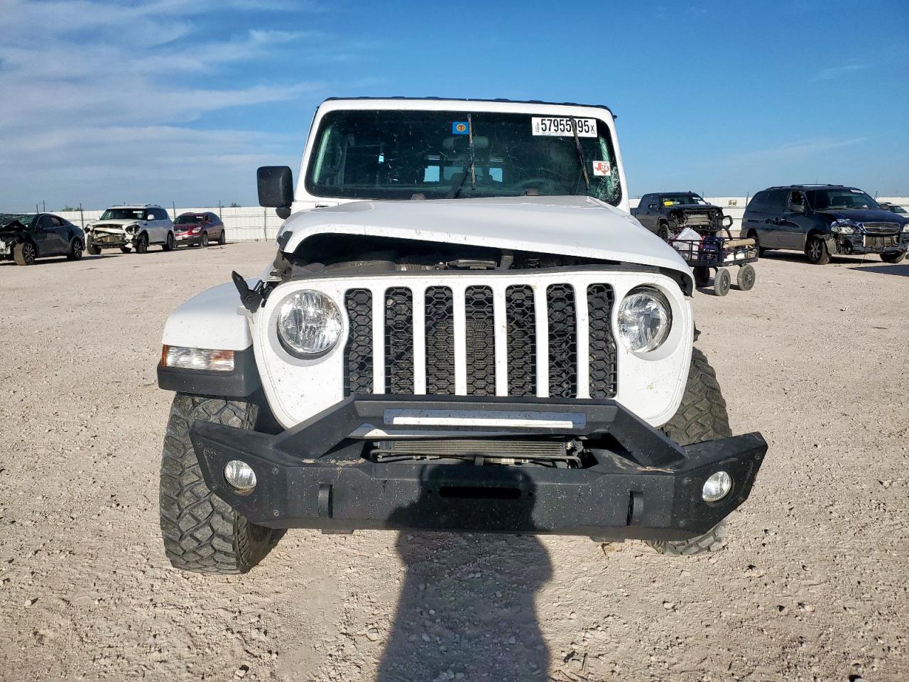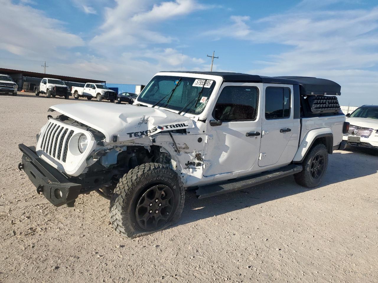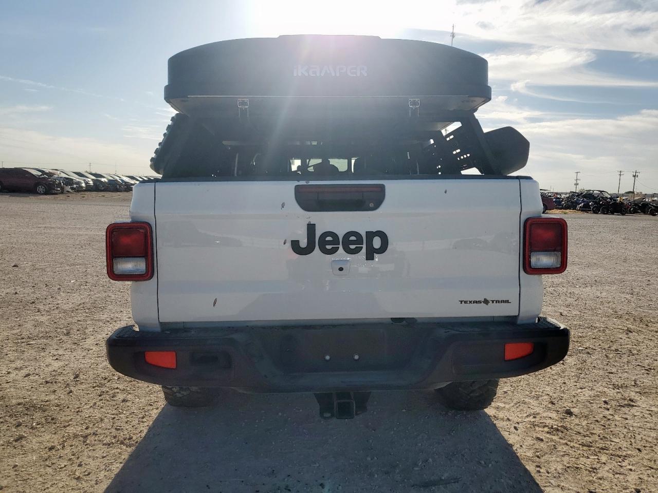 FairThis white 2023 Jeep Gladiator has sustained significant damage. The front end shows substantial impact, affecting the hood, fender, bumper, and likely structural components. The side of the vehicle also exhibits considerable damage. The interior has deployed airbags, indicating a significant collision. The vehicle is equipped with aftermarket features, including a roof-mounted tent. The Jeep shows signs of wear and tear overall.