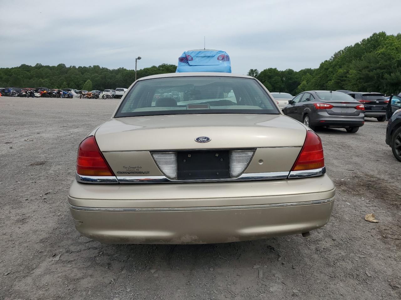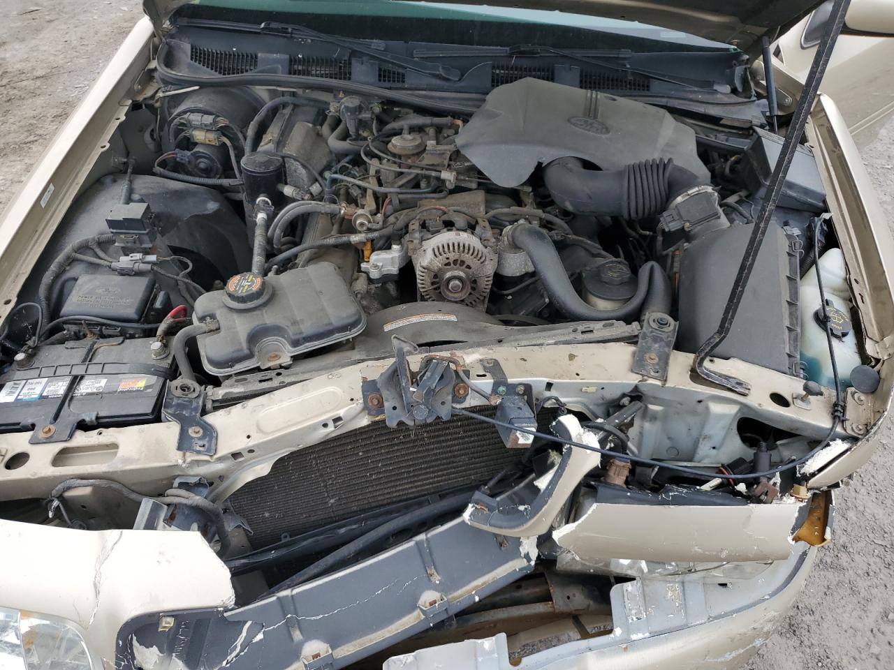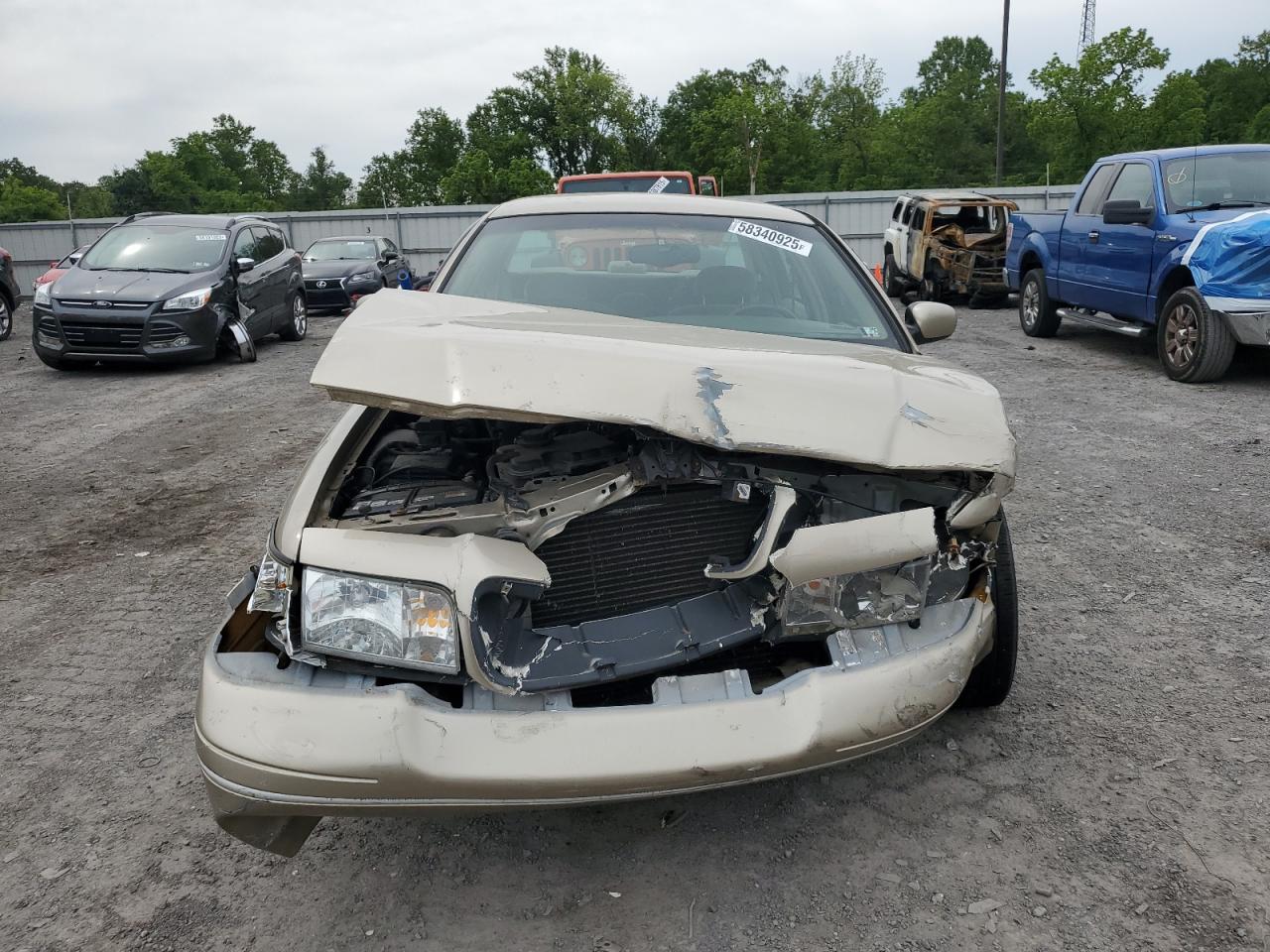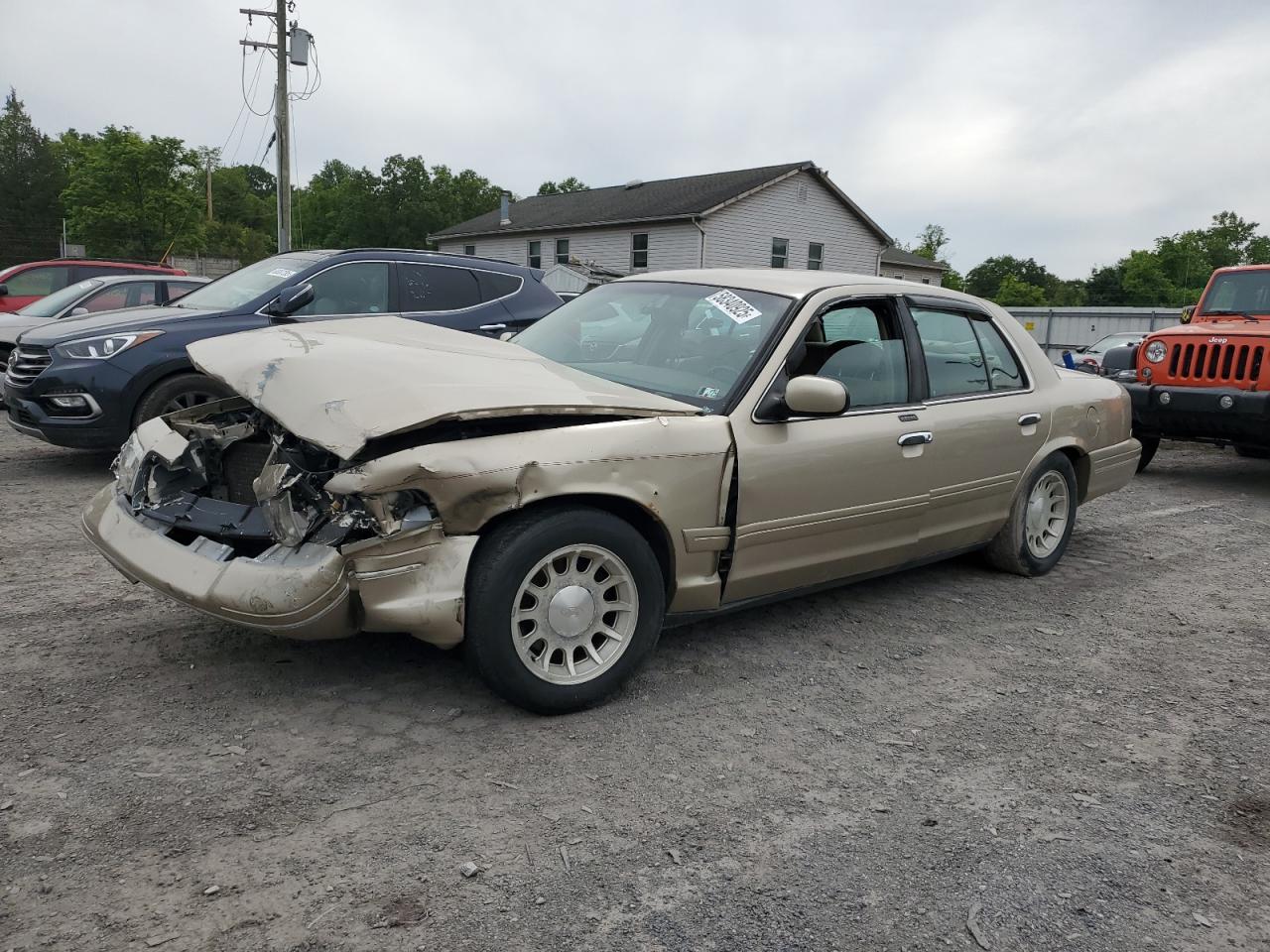 FairThis 1999 Ford Crown Victoria exhibits significant damage. The front end is heavily damaged, with evident crumpling and possible frame involvement, and side damage. The gold paint shows wear. The interior shows wear with stained fabric. The car likely requires considerable repair and is not drivable.