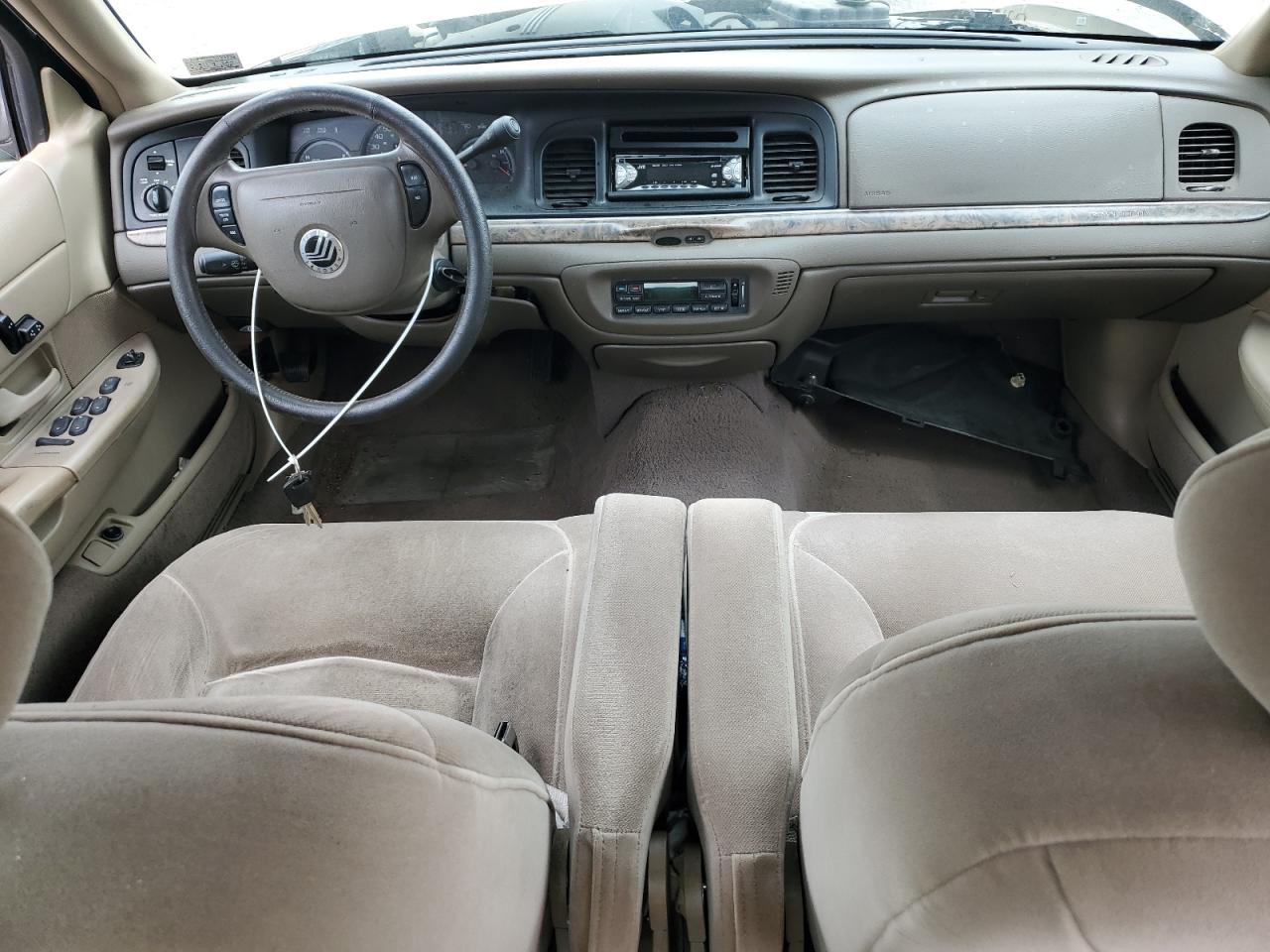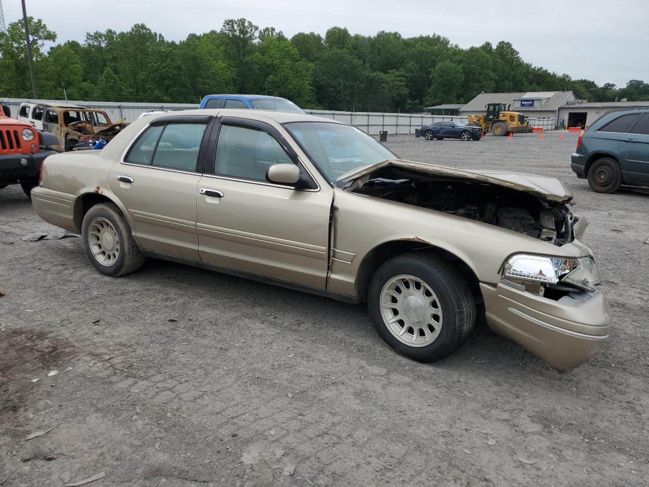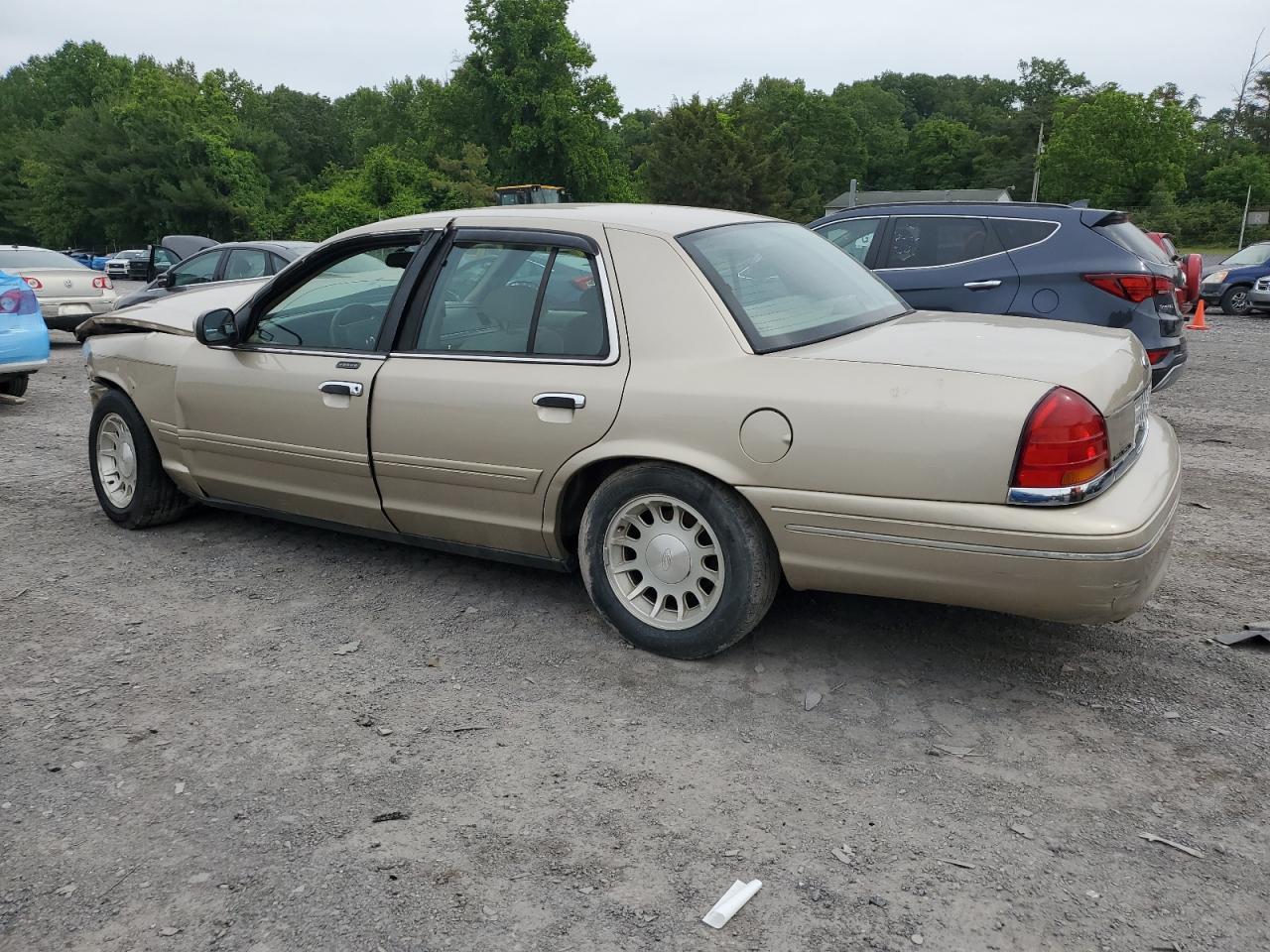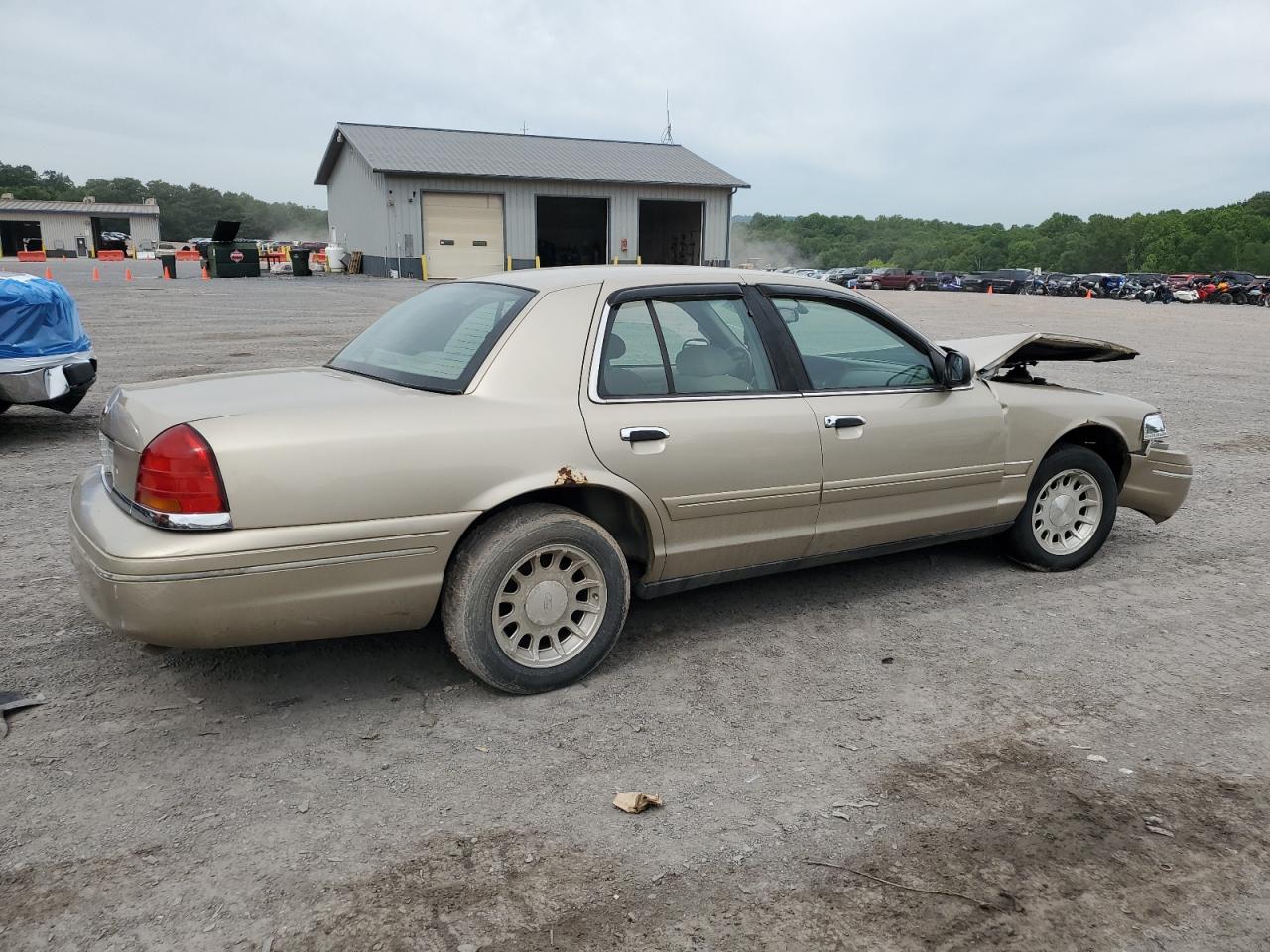 FairThis 1999 Ford Crown Victoria exhibits significant damage. The front end is heavily damaged, with evident crumpling and possible frame involvement, and side damage. The gold paint shows wear. The interior shows wear with stained fabric. The car likely requires considerable repair and is not drivable.