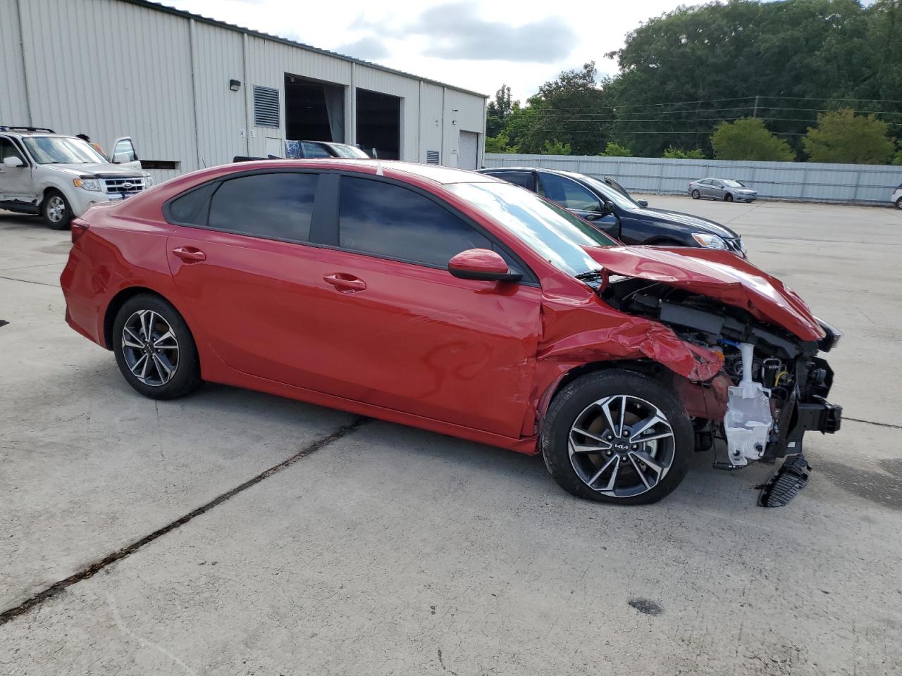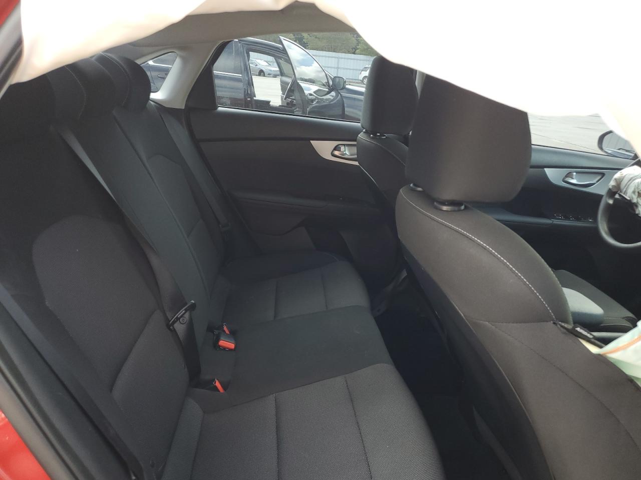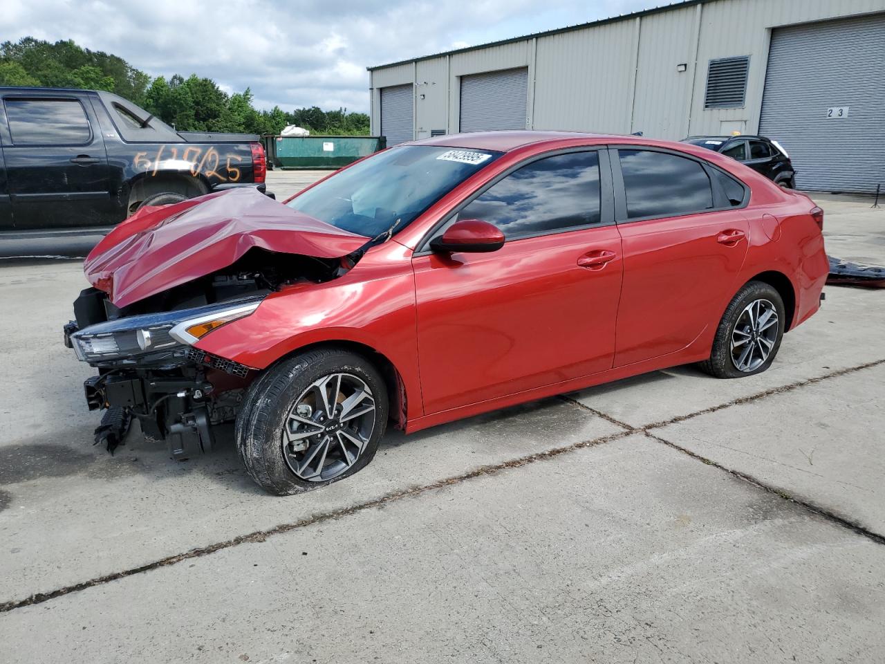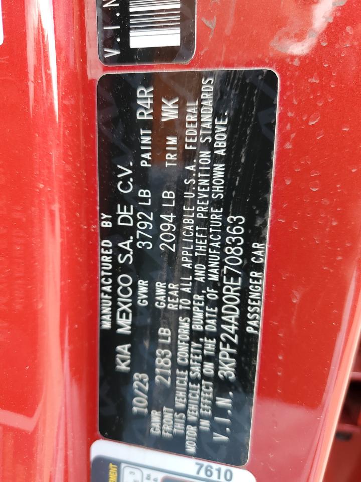 FairThis is a red 2024 KIA FORTE LX. The car's front end shows significant damage, indicating a collision. The airbags have deployed. The vehicle starts and runs, as indicated by the Run & Drive Verified status.
